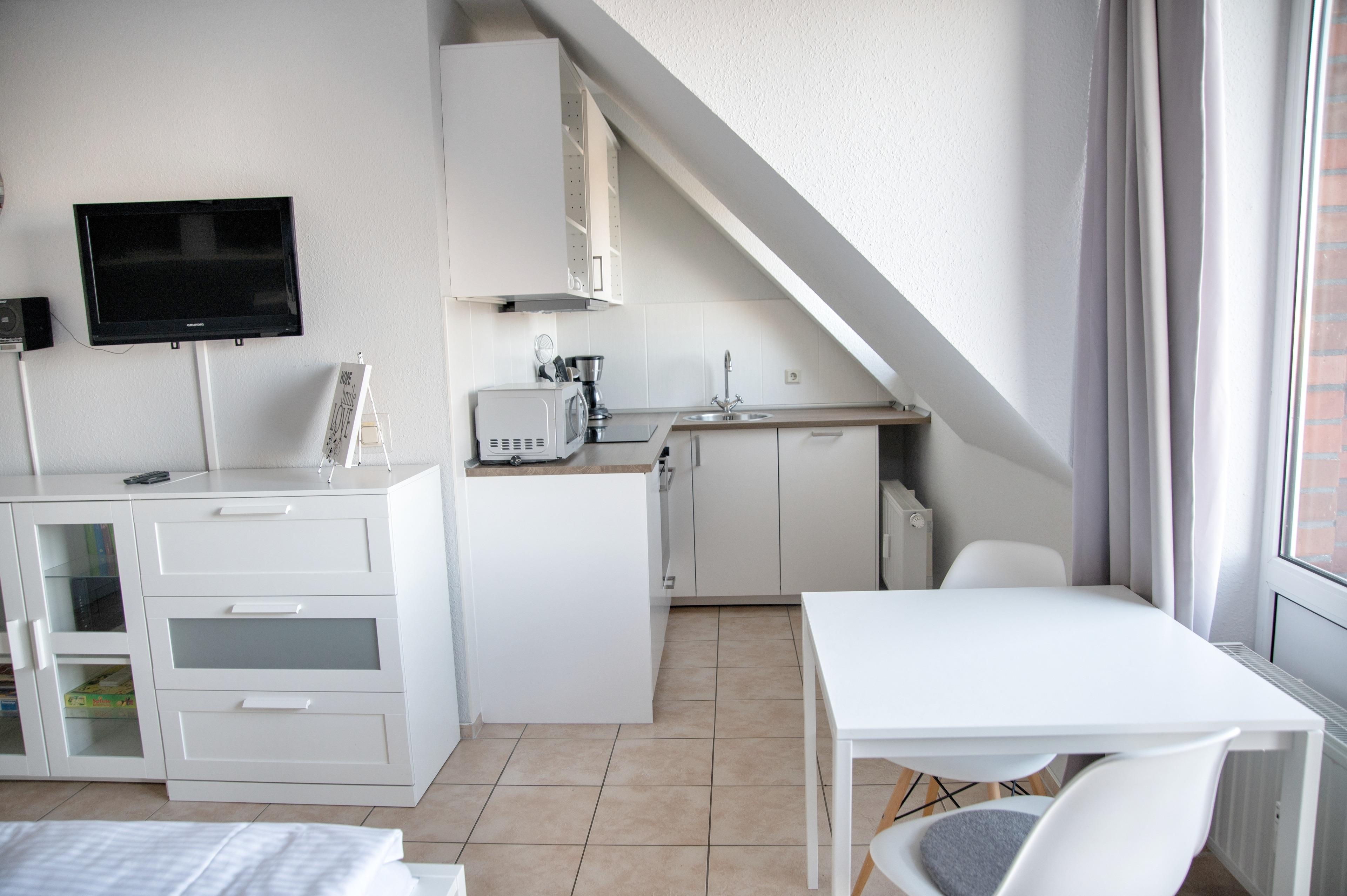 Im offenen Wohn- und Essbereich steht Ihnen ein Esstisch mit zwei Stühlen zur Verfügung. Die Küchenzeile ist für ein Appartement gut ausgestattet. Bestandteile sind unter anderem ein Kochfeld, eine Kaffeemaschine, eine Mikrowelle sowie ein Kühlschrank. Multimedial stehen Ihnen hier ein Flachbildfernseher mit Kabelanschluss zur Verfügung. Auch einige Gesellschaftsspiele dürfen nicht im Bestand fehlen. Beidseitig Ihres Bettes finden Sie einen Nachttisch mit einer Leselampe vor. Auch steht Ihnen ein großer Kleiderschrank zur Verfügung, der Ihren Kofferinhalt gut verstauen lässt. Die Küchenzeile ist zum Wohnzimmer hin offen, was das Appartement großzügiger erscheinen lässt. Das Badezimmer hat eine Dusche mit Duschkabine und natürlich haben Sie auch hier Ablageflächen. Der Flur beherbergt eine Flurgarderobe und einen Spiegel. Das Appartement Seestern liegt im zweiten Obergeschoss des Hauses Seestern, im Eingang 1. In unmittelbarer Nähe dieses Appartements befinden sich weitere Ferienappartements unserer Gesellschaft. Eine gemeinsame Anmietung ist hier sehr gut möglich.
