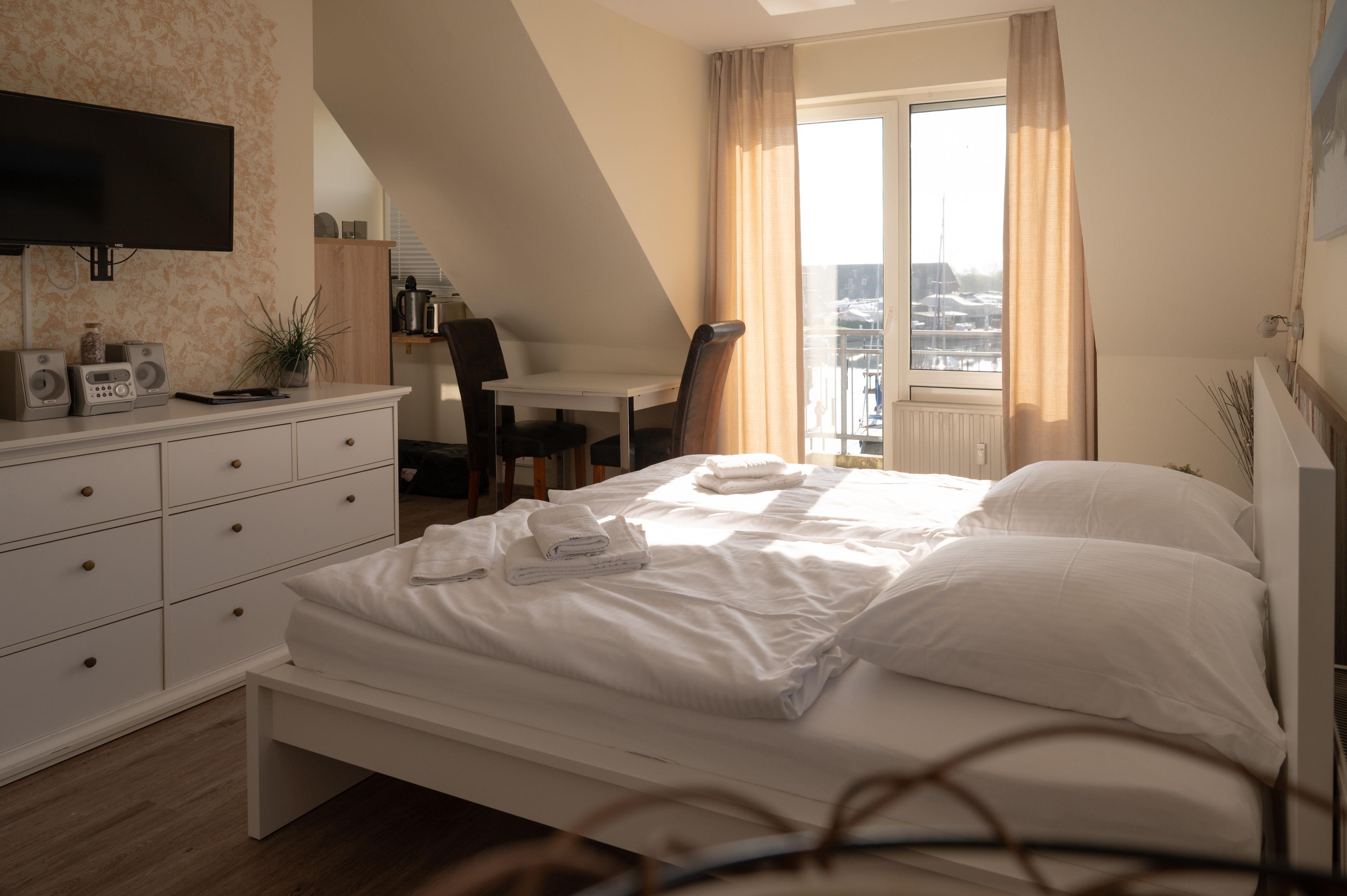 Das Appartement Seeigel erstreckt sich auf 27 Quadratmetern. Es unterteilt sich in einen großen Wohn- und Schlafbereich, eine Küchenecke, einen Flur sowie ein Bad. Vom südost- ausgerichteten Balkon aus haben Sie einen schönen Blick auf ein Hafenbecken der Lagunenstadt. Auch das Jagdschloss unseres Seebades können Sie von hier aus sehen. Balkonmöbel warten hier auch schon auf Sie.