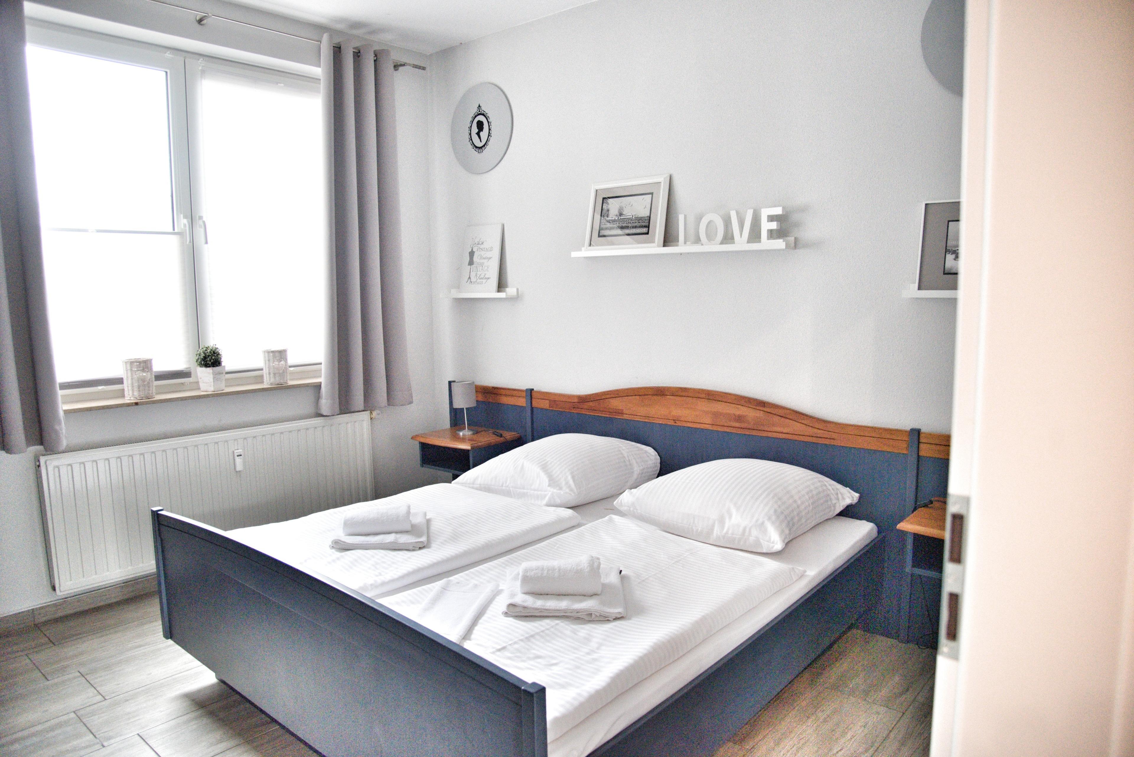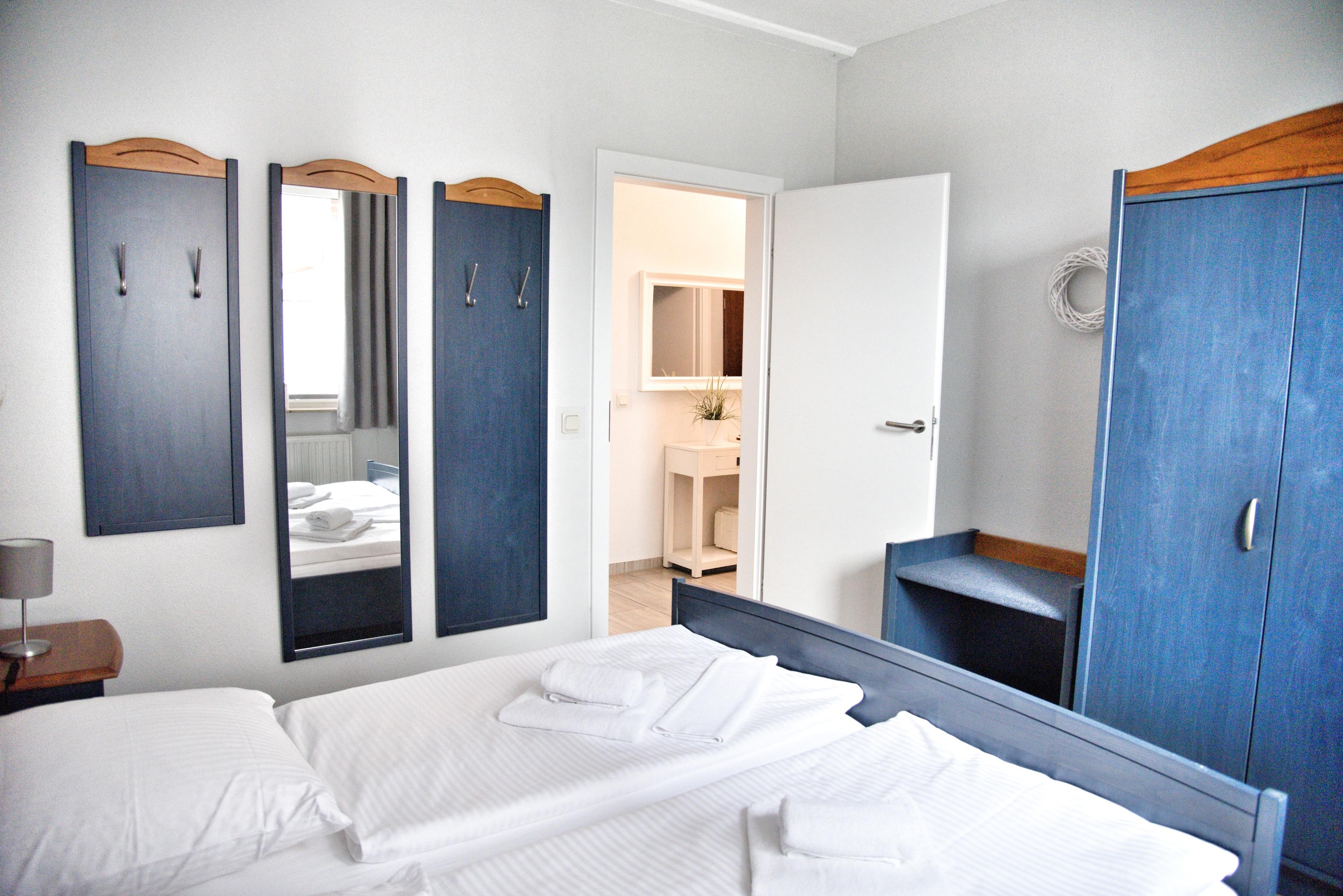 In Ihrem großen Schlafzimmer befindet sich ein Doppelbett mit höhenverstellbaren Lattenrosten. Nachtische, Leselampen, Garderoben und ein Spiegel möchten hier von Ihnen genutzt werden. Der große Schrank und auch das Kofferbord werden Ihnen gute Dienste leisten. Auch der Safe kann von Ihnen gerne genutzt werden. Im kleinen Schlafzimmer sind zwei Einzelbetten mit den Maßen 80 x 200cm für Sie vorhanden. Der dreiflügelige Kleiderschrank wird auch hier genügend Stauraum für Ihr Gepäck bieten. Ihre neue Küche ist für Sie voll ausgestattet. Bestandteile sind unter anderem ein Cerankochfeld, ein Backofen, eine Kaffeemaschine, eine Mikrowelle, viel Geschirr, ein Geschirrspüler, eine große Kühl- und Gefrierkombination und weiteres Equipment. Ein besonderes Highlight ist hier der kleine Bistrotisch am Fenster. Dort können Sie bei einer Tasse Kaffee den Möwen und Fischreihern im Hafenbecken zuschauen. Zusätzlich steht Ihnen hier auch eine Waschmaschine zur Verfügung. Das Badezimmer hält eine Badewanne mit Duschecke, Ablageflächen und einen Fön für Sie bereit. Ihre persönlichen Mitbringsel finden hier ausreichend Platz. Im Flur finden Sie eine Garderobe, ein Sideboard und einen Spiegel vor. Die Ferienwohnung Luv befindet sich im Erdgeschoss des Hauses Regatta im Eingang 2. In unmittelbarer Nähe dieses Appartements befinden sich weitere Ferienappartements unserer Gesellschaft. Eine gemeinsame Anmietung ist hier sehr gut möglich.