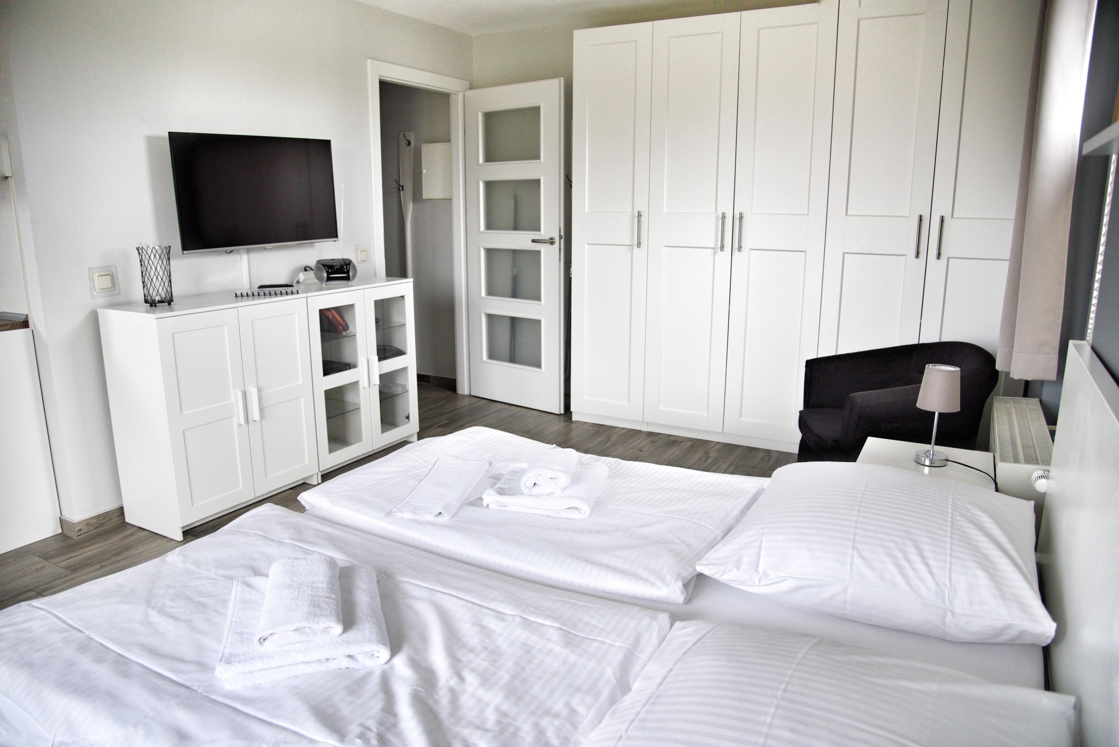 Im offenen Wohn- und Essbereich steht Ihnen ein Esstisch mit zwei Stühlen zur Verfügung. Die Küchenzeile ist sehr gut ausgestattet. Bestandteile sind unter anderem ein Cerankochfeld und ein Backofen, eine Kaffeemaschine, ein Kühlschrank, eine Mikrowelle und ein Geschirrspüler findet hier Platz. Multimedial stehen Ihnen hier ein Flachbildfernseher mit Kabelanschluss zur Verfügung. Beidseitig Ihres Bettes finden Sie ein Nachttisch mit einer Leselampe vor. Ebenfalls steht Ihnen hier ein großer Kleiderschrank und ein separater Sessel zur Verfügung. Das Badezimmer hat eine Dusche mit Duschkabine und auch hier finden Sie Ablageflächen für all Ihre Mitbringsel. Liebevolle Details laden zum Wohlfühlen ein. Der Flur beherbergt eine Flurgarderobe und einen Spiegel. Das Appartement Dalben liegt im Erdgeschoss des Hauses Seestern, im Eingang 1. In unmittelbarer Nähe dieses Appartements befinden sich auch weitere Ferienappartements unserer Gesellschaft. Eine gemeinsame Anmietung ist hier sehr gut möglich.