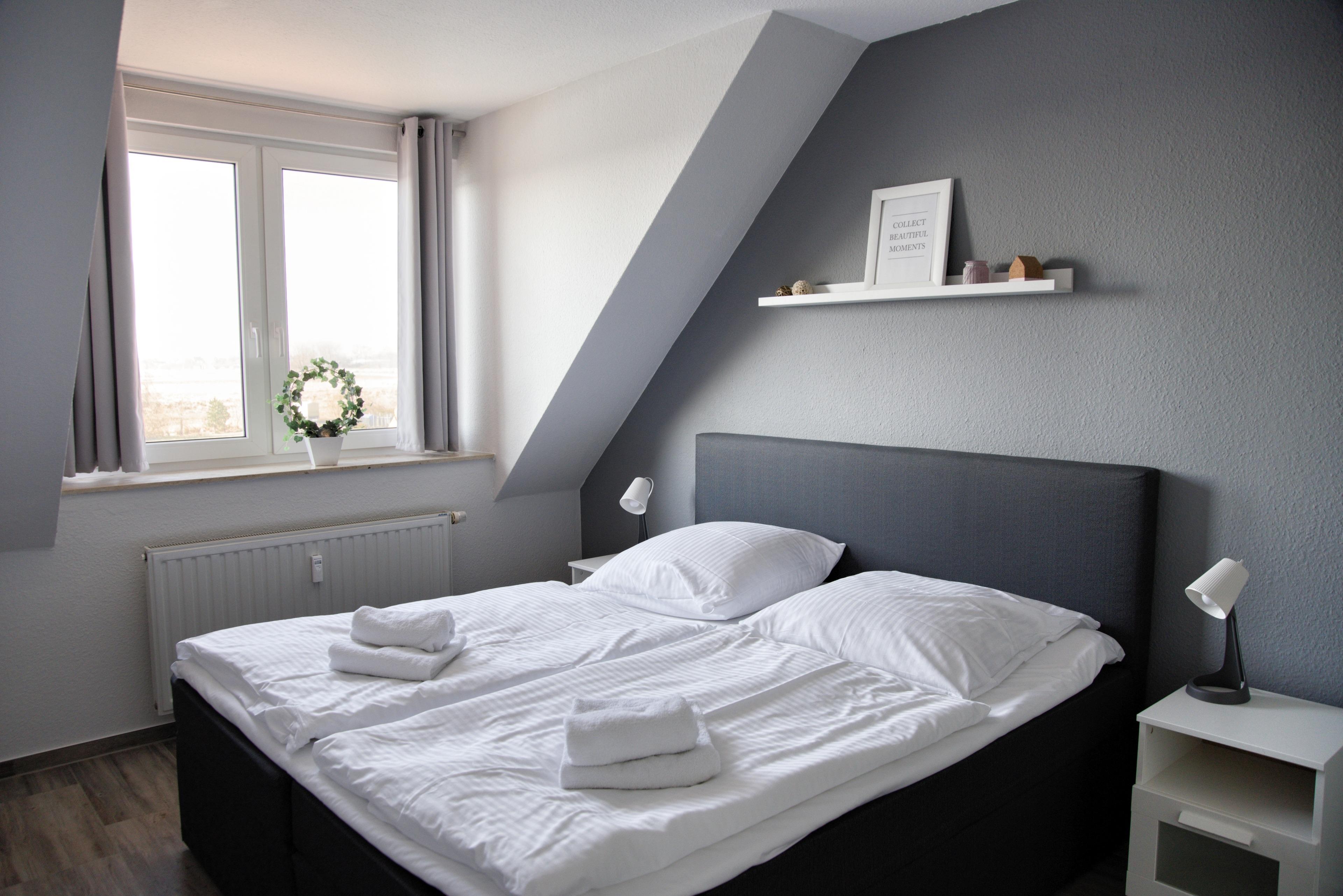 Das Wohnzimmer verfügt über einen großen Esstisch mit sechs Stühlen, ein ausziehbares Schlafsofa mit einem Schlafplatz für zwei Personen und einen Sessel. Multimedial stehen Ihnen ein Flachbildfernseher zur Verfügung. Ihre Ferienwohnung hat einen Kabelanschluss. Auch einige Gesellschaftsspiele warten hier schon auf Sie. Die beiden Schlafzimmer sind identisch groß und annähernd gleich geschnitten. In beiden Schlafzimmern stehen Ihnen ein Doppelbett, Nachttische und jeweils zwei große Kleiderschränke zur Verfügung.