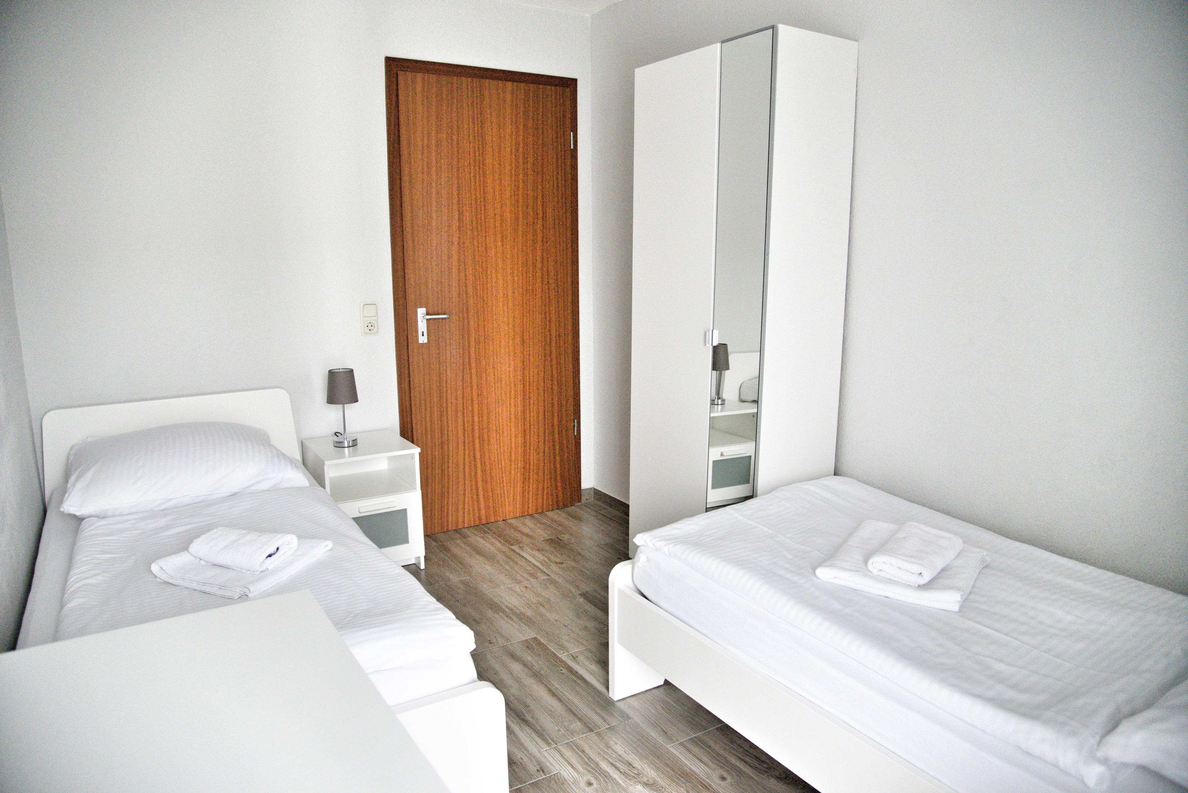 In Ihrem Hauptschlafzimmer befindet sich ein komfortables Boxspringbett. Nachttische, Leselampen und zwei Kleiderschränke komplettieren die Einrichtung für Sie. Im kleinen Schlafzimmer sind zwei Einzelbetten für Sie vorhanden. Ihre Einbauküche ist für Sie voll ausgestattet. Bestandteile sind unter anderem Kochfeld, Backofen, Kaffeemaschine, Mikrowelle, viel Geschirr, eine große Kühl- und Gefrierkombination und weiteres Equipment. Das Badezimmer hält eine Dusche mit Duschkabine, Ablageflächen und einen Fön für Sie bereit. Ihre mitgebrachten Utensilien können Sie hier gut verstauen. Im Flur finden Sie eine Garderobe, einen großen Spiegel und Reinigungsgeräte vor. Das Appartement Neptun liegt im Erdgeschoß des Hauses Störtebeker, im Eingang 3. In unmittelbarer Nähe dieses Appartements befinden sich weitere Ferienappartements unserer Gesellschaft. Eine gemeinsame Anmietung ist hier sehr gut möglich.