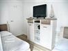Ihr Wohnzimmer verfügt über einen Esstisch mit sechs Stühlen, ein ausziehbares Klappsofa mit einem Schlafplatz für zwei Personen und einen Sessel. Multimedial stehen Ihnen ein großer Flachbildfernseher zur Verfügung. Die Ferienwohnung hat auch einen Kabelanschluss.