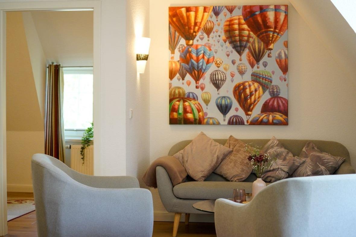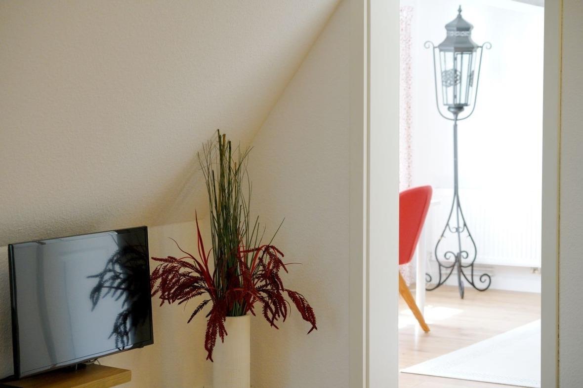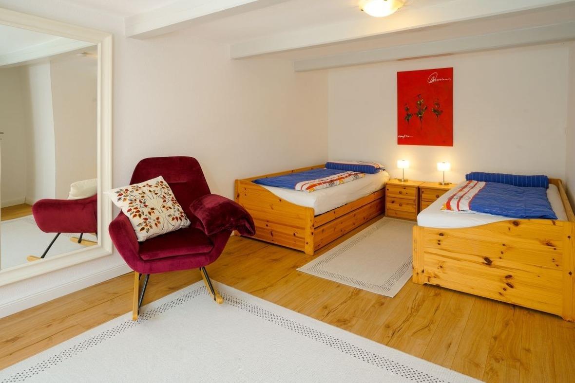 Das Haus wurde vollständig modernisiert, um den heutigen Komfortwünschen zu entsprechen. Dabei war es uns sehr wichtig, den Charme des historischen Gebäudes zu erhalten. Die Wohnung verfügt über ein Wohn/Essbereich mit Kaminofen und einer offenen Küche, einem Bad und den getrennten Schlafzimmern. Das erste Schlafzimmer ist mit einem Boxspring-Doppelbett und begehbarem Kleiderschrank ausgestattet, im Zweiten befinden sich je nach Belegung 2 oder 3 einzelne Betten.