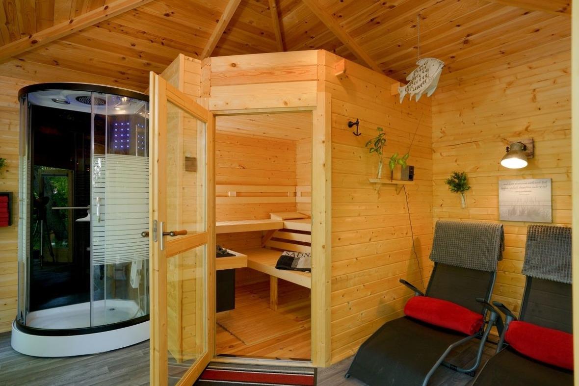 Für gemütliche Nachmittage und Abende, gerade in der kälteren Jahreszeit, bietet sich ein exklusives Saunavergnügen in unserer neuen Gartensauna an. Anschließend entspannen Sie am prasselnden Kaminfeuer (Kaminöfen mit großem Sichtfenster) Ihrer Himmel’s Stuv.