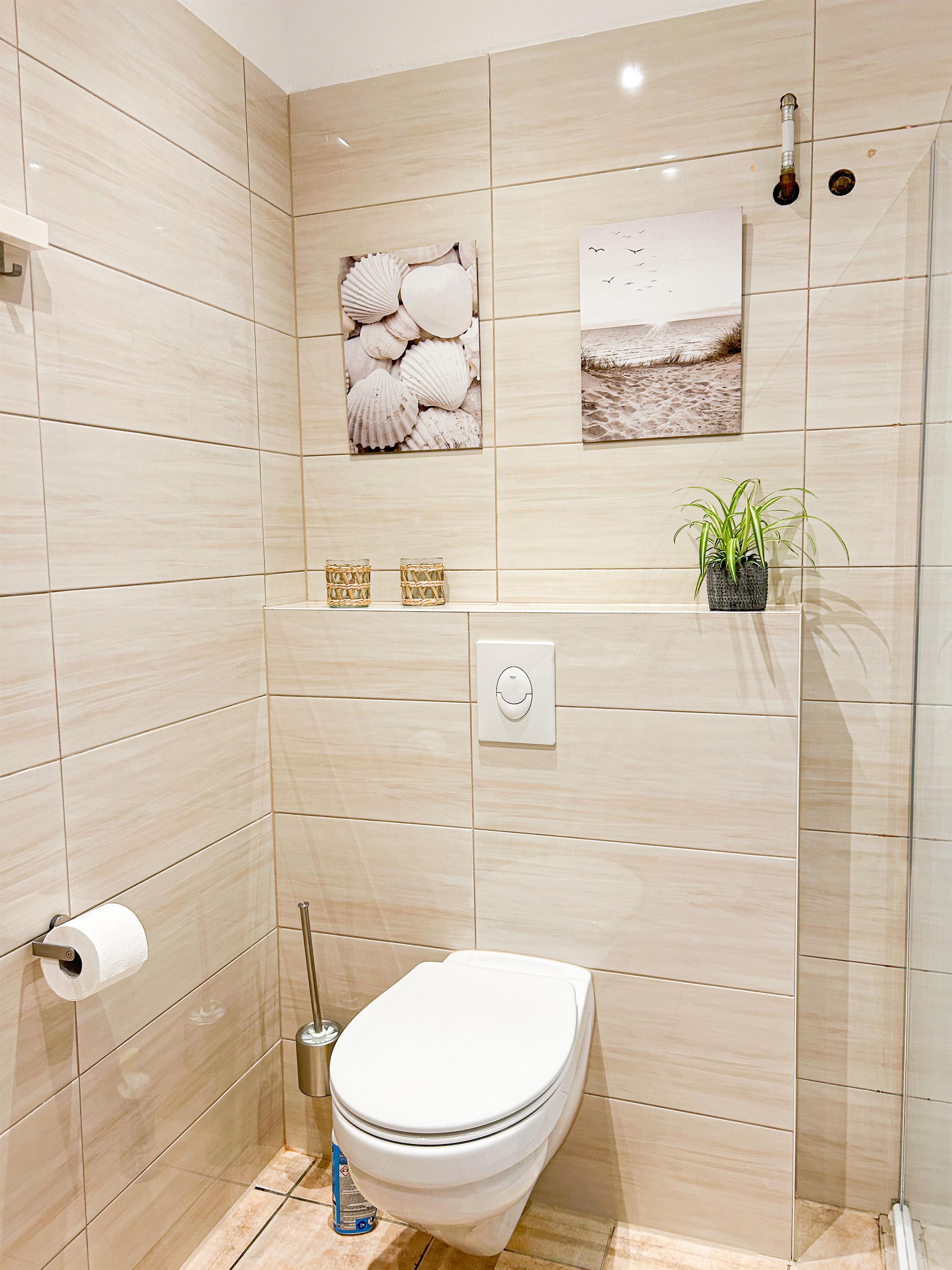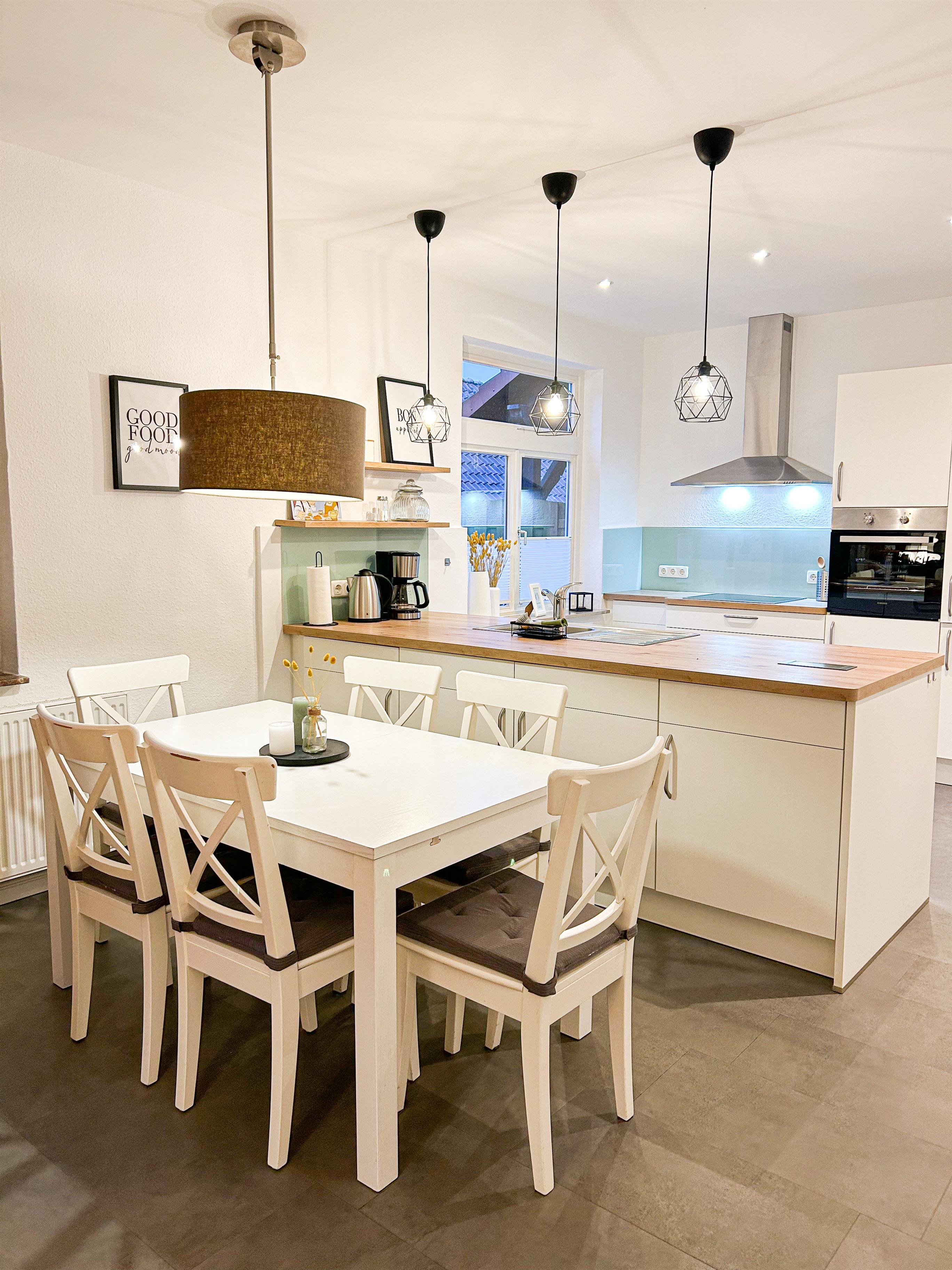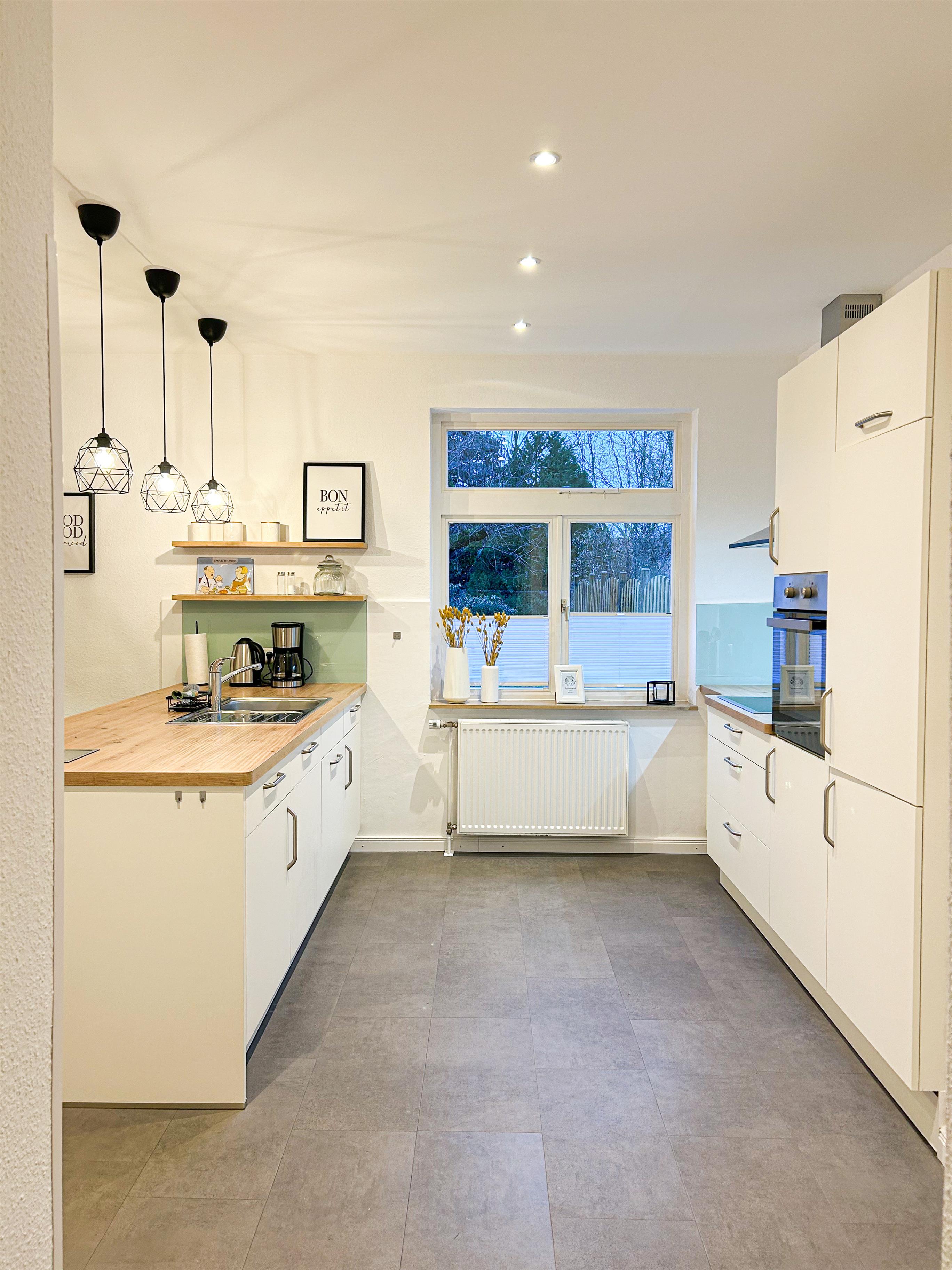 Die Küche ist mit einem Backofen, einer Mirkowelle, einem Geschirrspüler, einem Ceran-Kochfeld, einer Kühl-/Gefrierkombination, einer Filter-Kaffeemaschine, einem Wasserkocher, einer Heißluftfritteuse und einem Toaster ausgestattet.