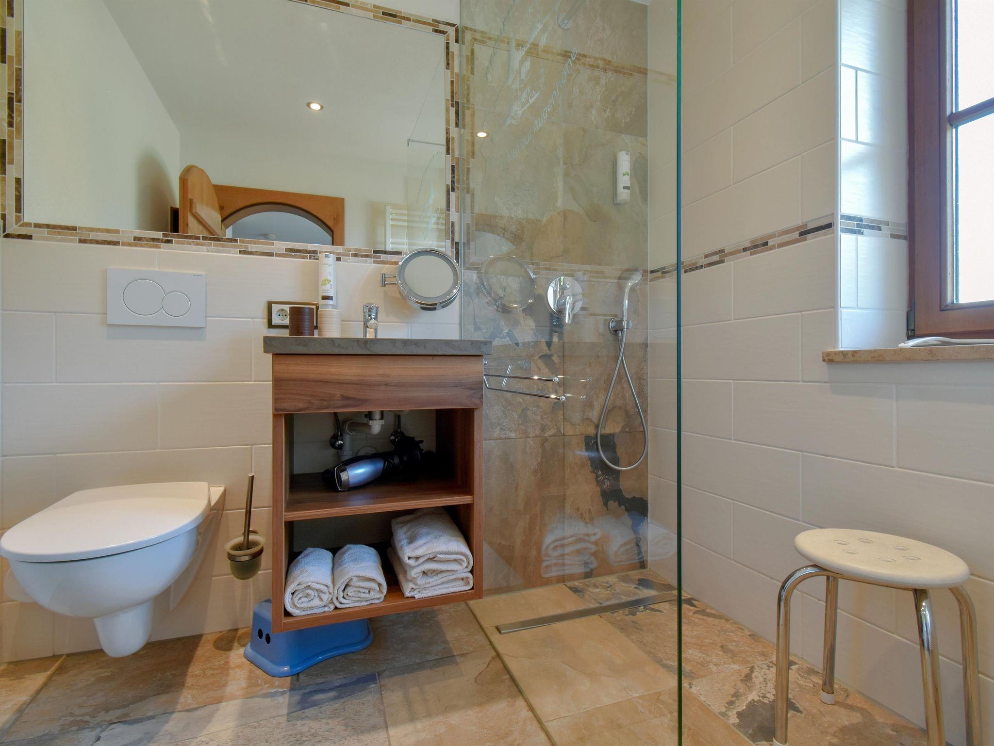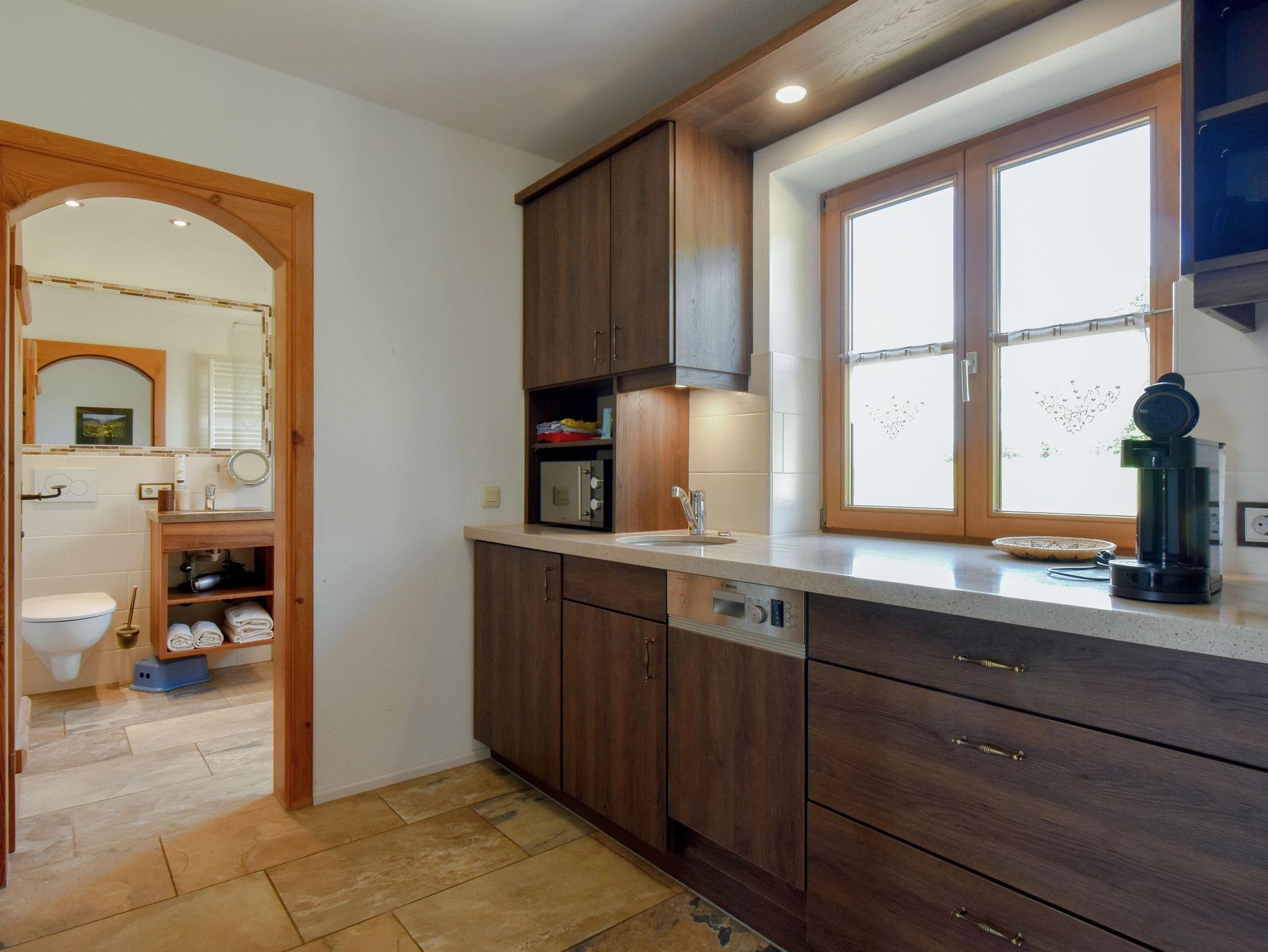 Hochwertig und geschmackvoll eingerichtete Ferienwohnung mit Wohnzimmer, Schlafzimmer, Küche mit Spülmaschine und Backofen,Wasserkocher, Kaffeemaschine und Kühlschrank mit Gefrierfach sowie Mikrowelle, Wellnessbad Du/WC mit Fön, Sat-TV, W-lan, Balkon-Südseite, die Betten sind bezogen, Hand- und Geschirrtücher liegen in den Wohnungen für Sie bereit. Zustellbetten bis 5 Personen möglich.
