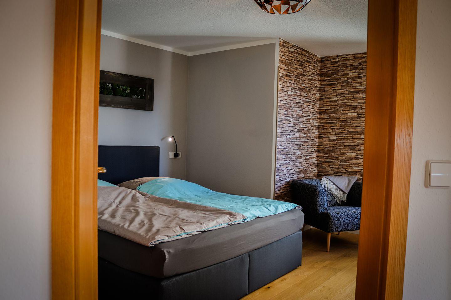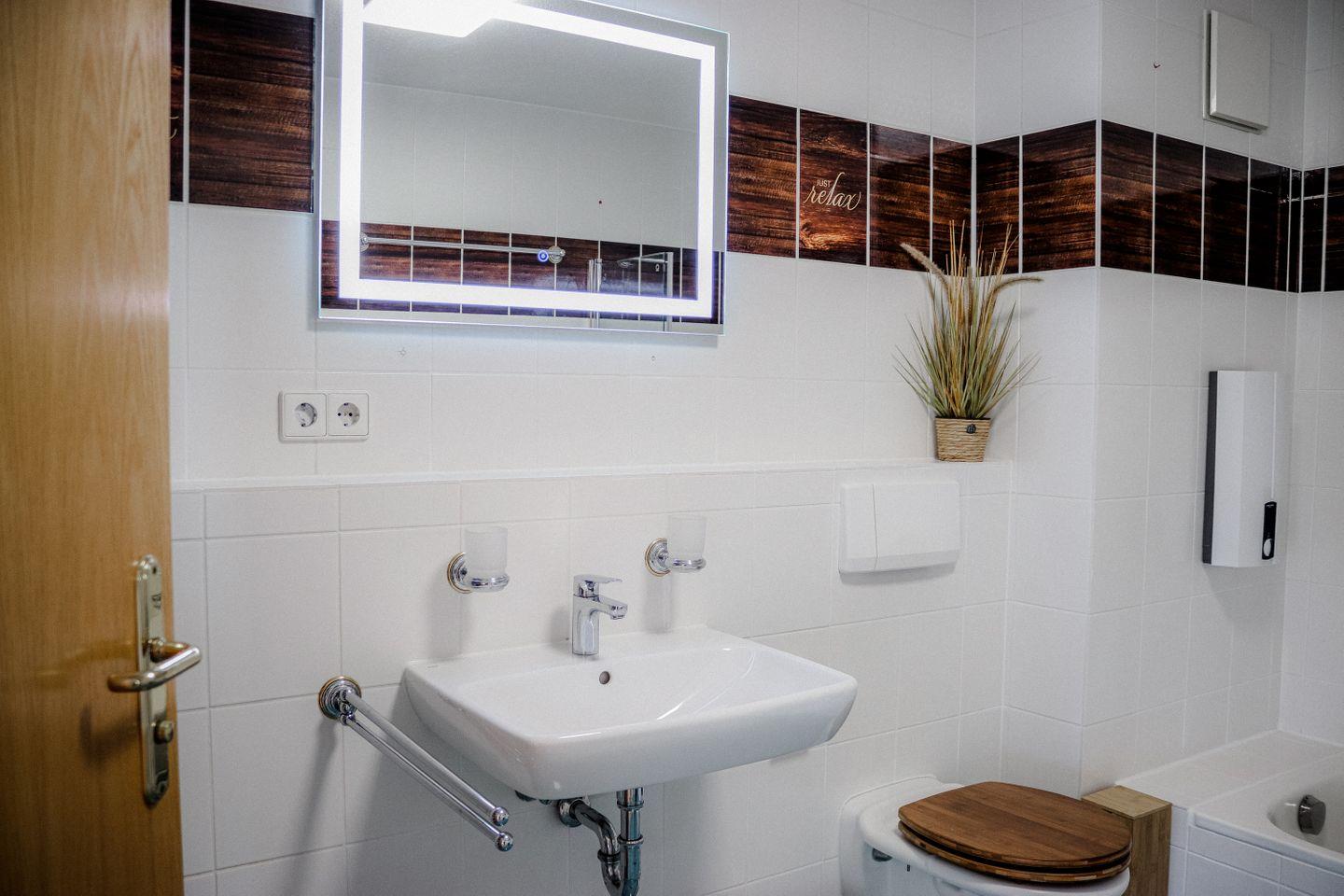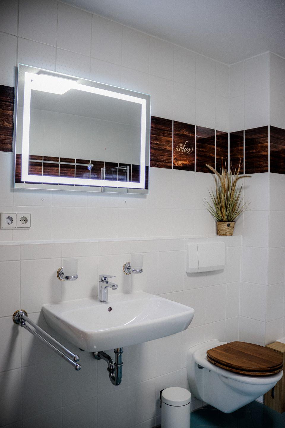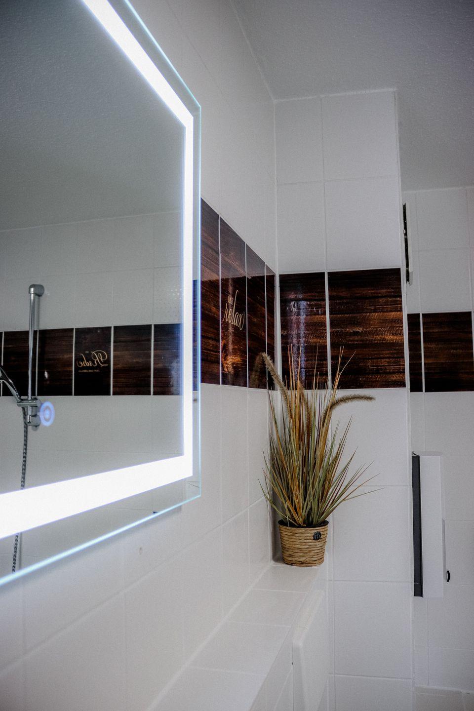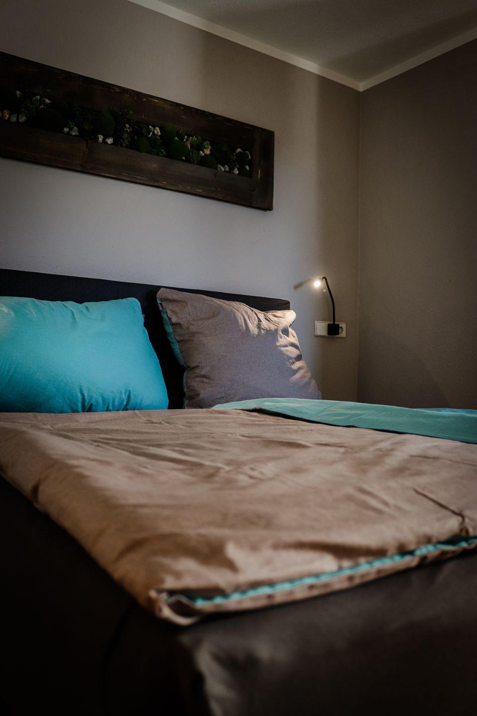 Die 64 m² große Wohnung bietet Platz für bis zu vier Personen und eine moderne, stilvolle Einrichtung mit Liebe zum Detail. Das großzügige Schlafzimmer ist mit einem komfortablen Boxspringbett und einem geräumigen Schrank ausgestattet. Im kombinierten Wohn-/Essbereich mit offener Küche befindet sich ein hochwertiges Lederschlafsofa, das zwei weiteren Personen Platz bietet. Das Badezimmer verfügt über eine Badewanne, einen Waschtisch, eine Toilette und eine Waschmaschine.