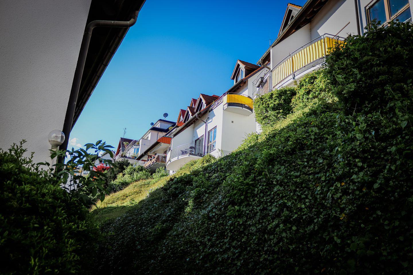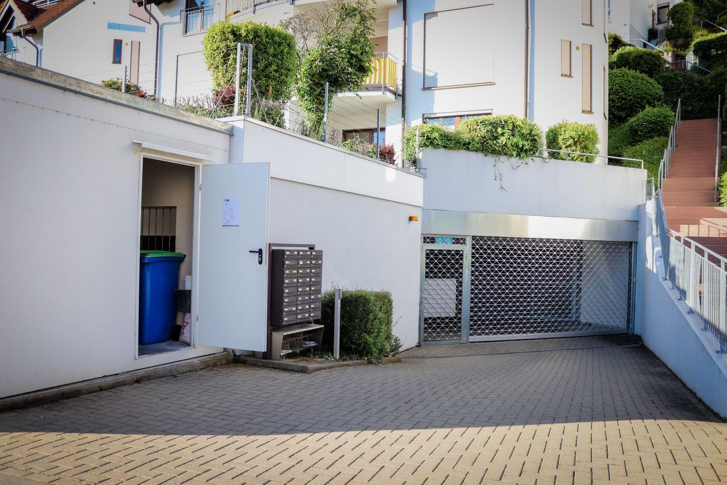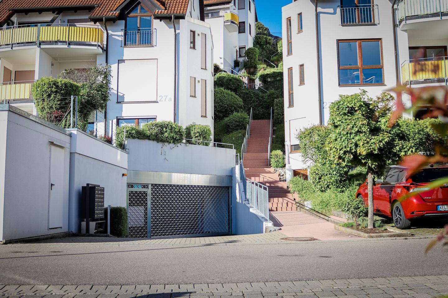 Zur Wohnung gelangen Sie über die Außentreppen: von der Bergstraße etwa 37 Stufen oder von der Garage aus 85 Stufen. Die Wohnung befindet sich hinter der zweiten Tür rechts. Ein Duplex-Parkplatz (oben, Nummer 69) gehört zur Wohnung. Bitte beachten Sie die Maße (siehe Bilder). Die Garage ist über den Waldweg (Hausnummer 27a) erreichbar. Direkt an der Garage befinden sich der Müllraum (rechts) und ein Fahrradkeller (links).