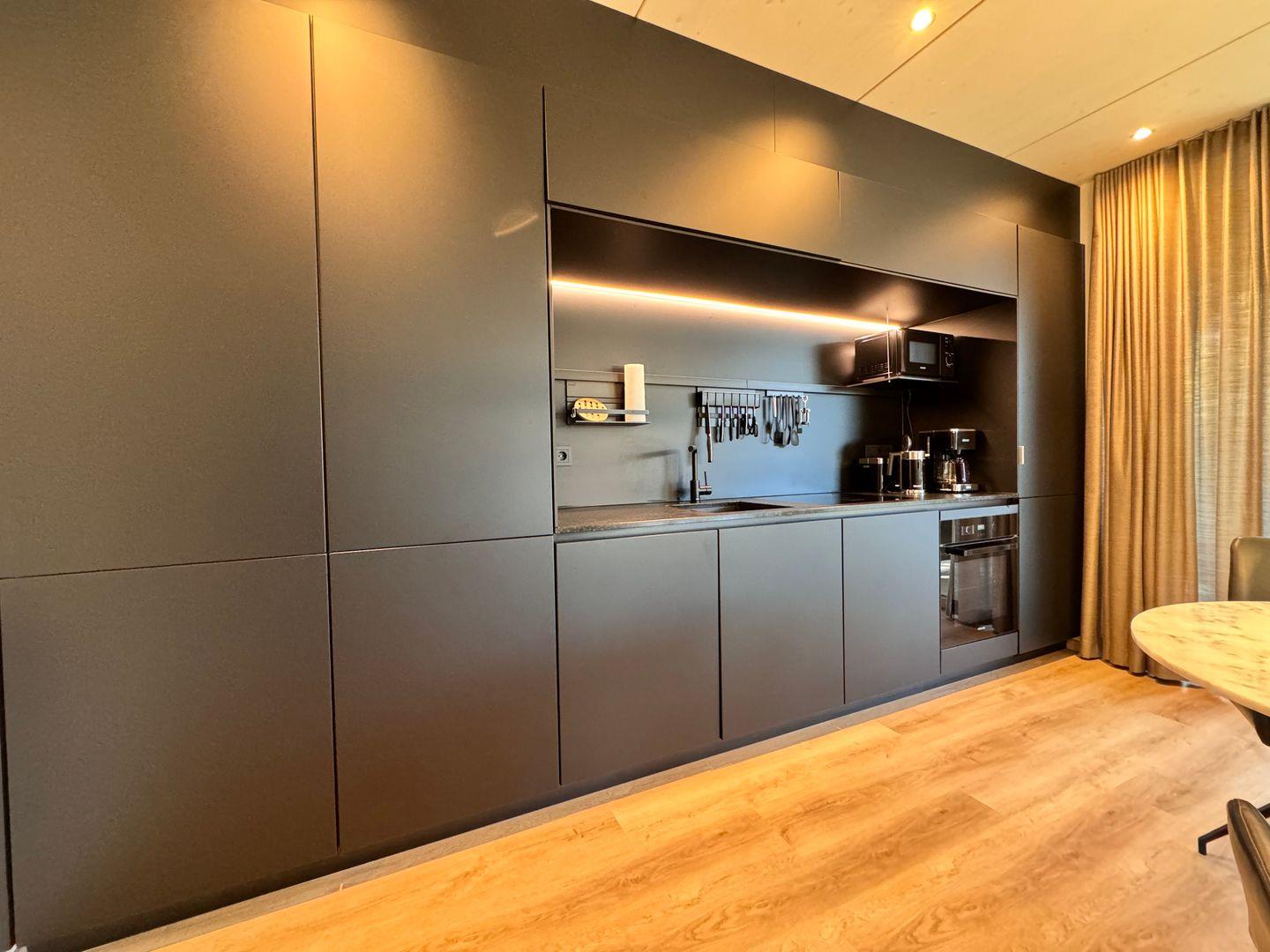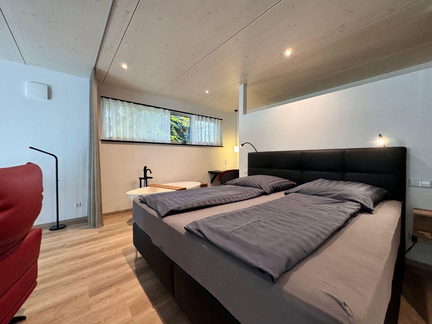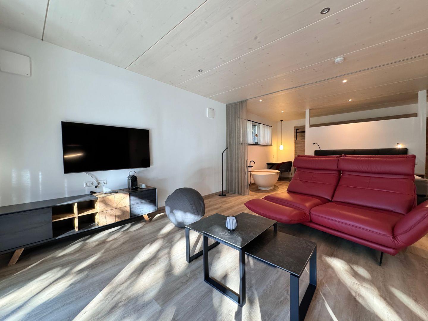Das offene 1-Zimmer-Appartement überzeugt durch geradliniges schlichtes Design sowie ausgesuchte Möbel und Textilien. Die Ausstattung lässt keine Wünsche offen.