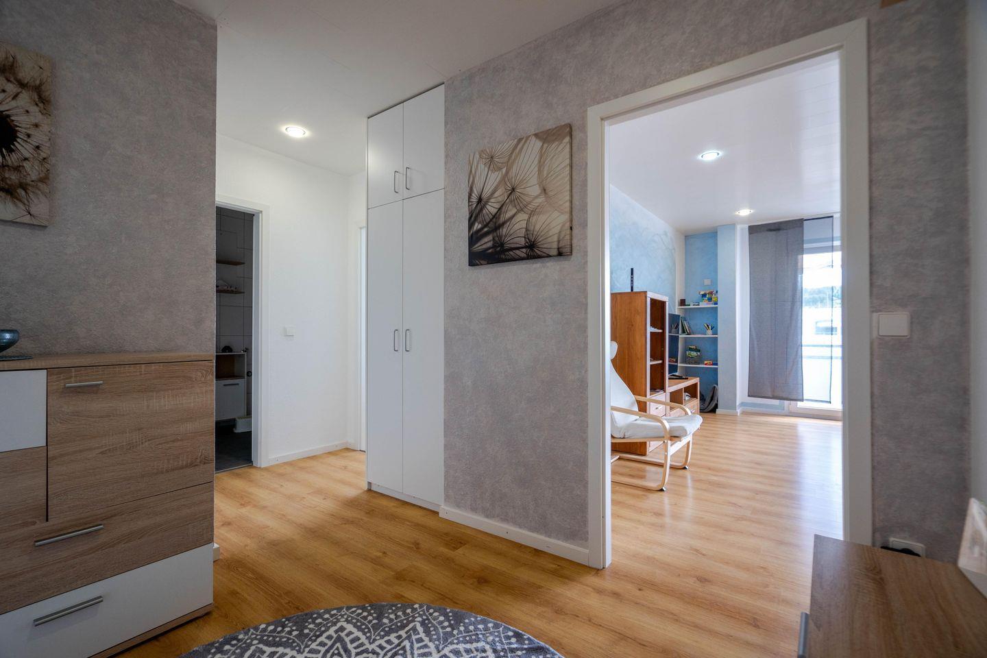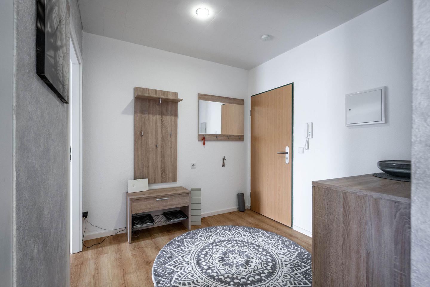Das modern ausgestattete Badezimmer verfügt über eine Dusche mit Wanne, Waschtisch, Spiegel, Kosmetikspiegel sowie Haartrockner. Zusätzlich steht ein Gäste-WC zur Verfügung. Waschmaschine, Bügeleisen und Bügelbrett gewährleisten einen angenehmen Aufenthalt, auch bei längeren Ferien. Die Nutzung der Waschmaschine erfolgt gemeinschaftlich. Für Sicherheit und Wohlbefinden sind Rauchmelder, Feuermelder und Feuerlöscher integriert. Zentrale Heizungs- und Warmwasserversorgung sowie eine Garderobe und ein Schuhschrank runden das Angebot ab.