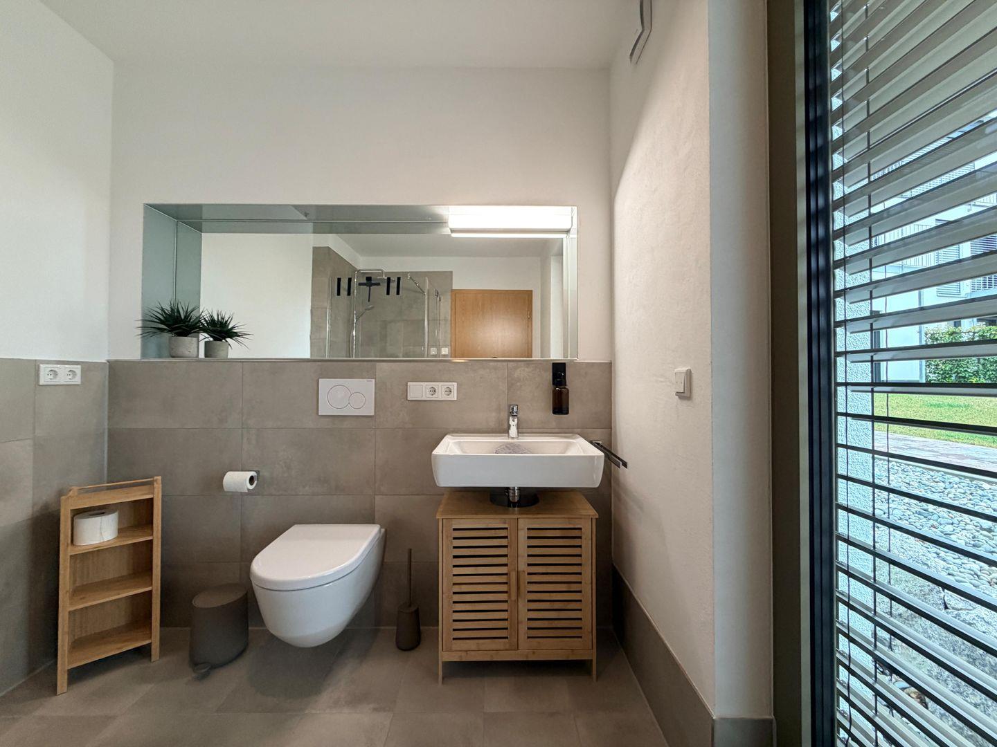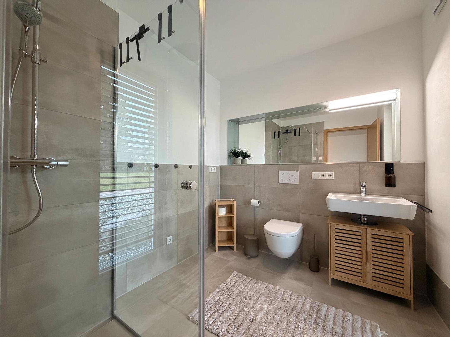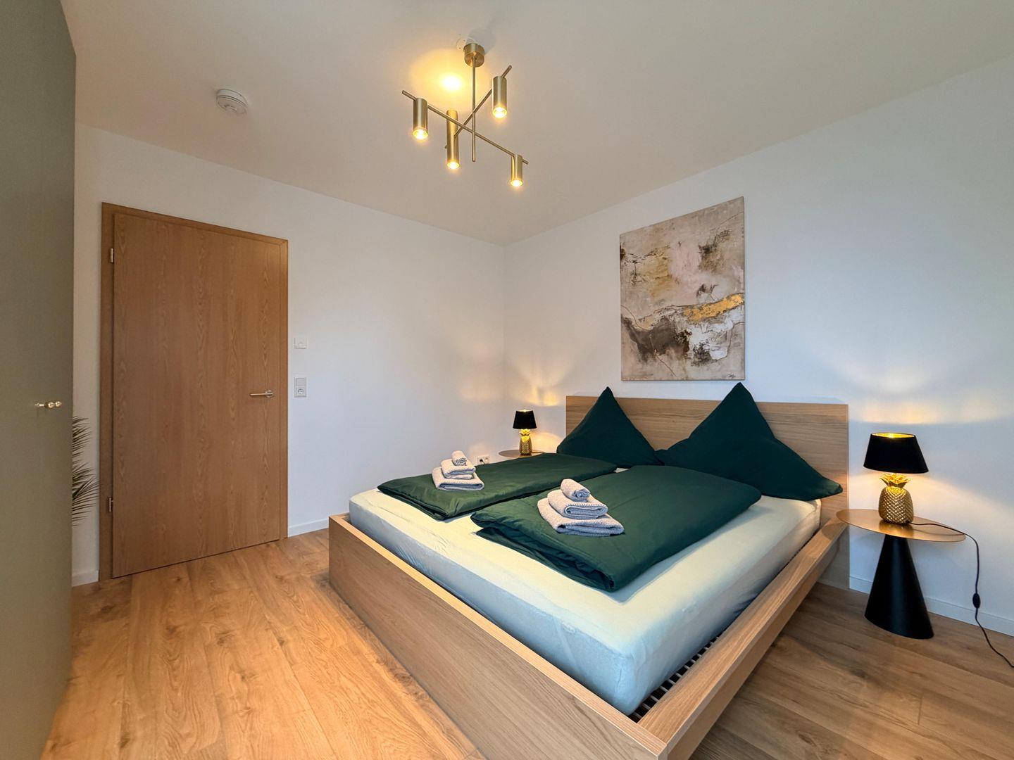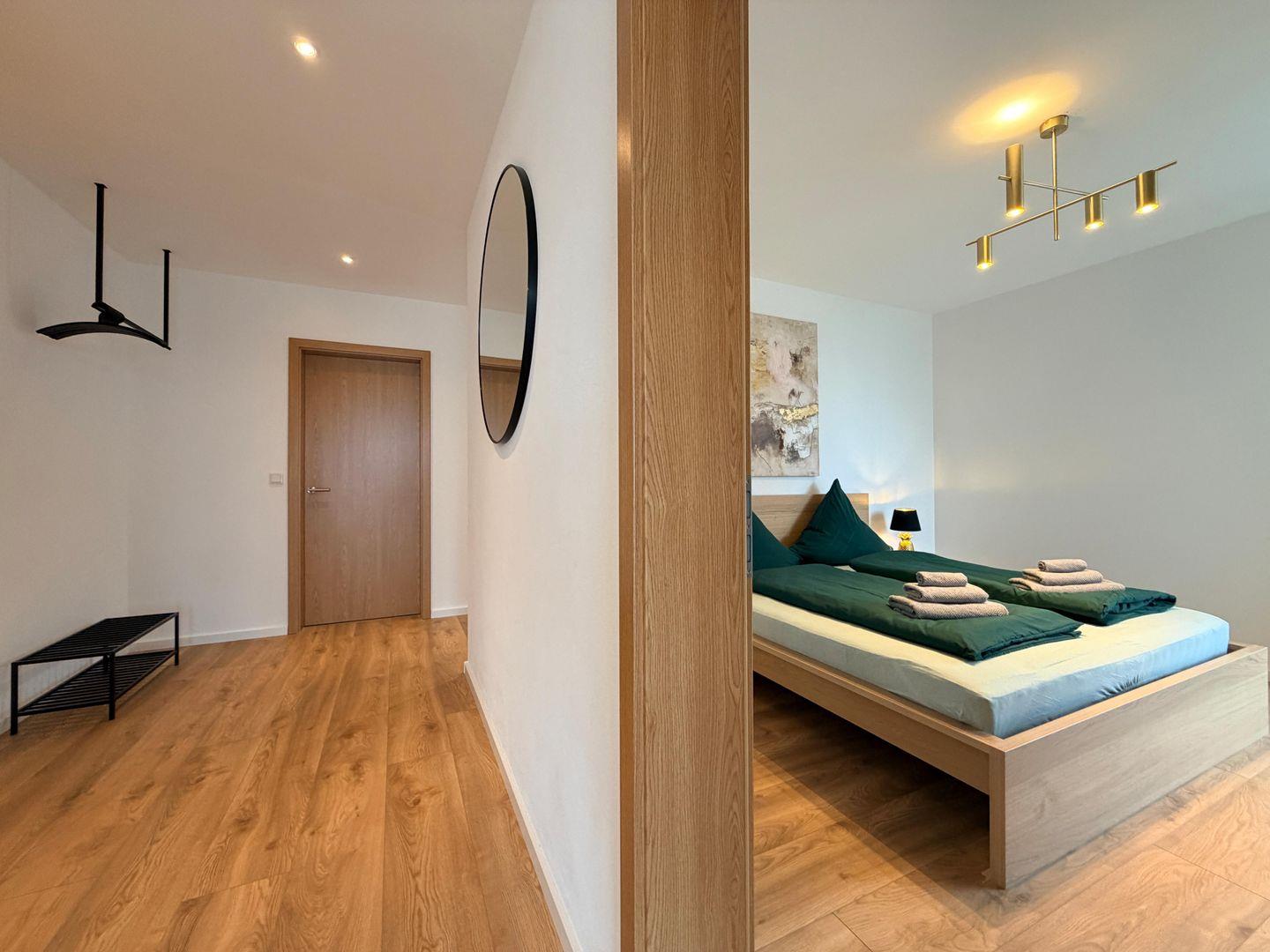 Die Wohnung verfügt über zwei komfortable Schlafzimmer sowie ein stilvolles Badezimmer mit bodengleicher Dusche. Hochwertige Materialien, Fußbodenheizung und ein durchdachtes Einrichtungskonzept sorgen für ein luxuriöses und gleichzeitig entspanntes Wohngefühl.