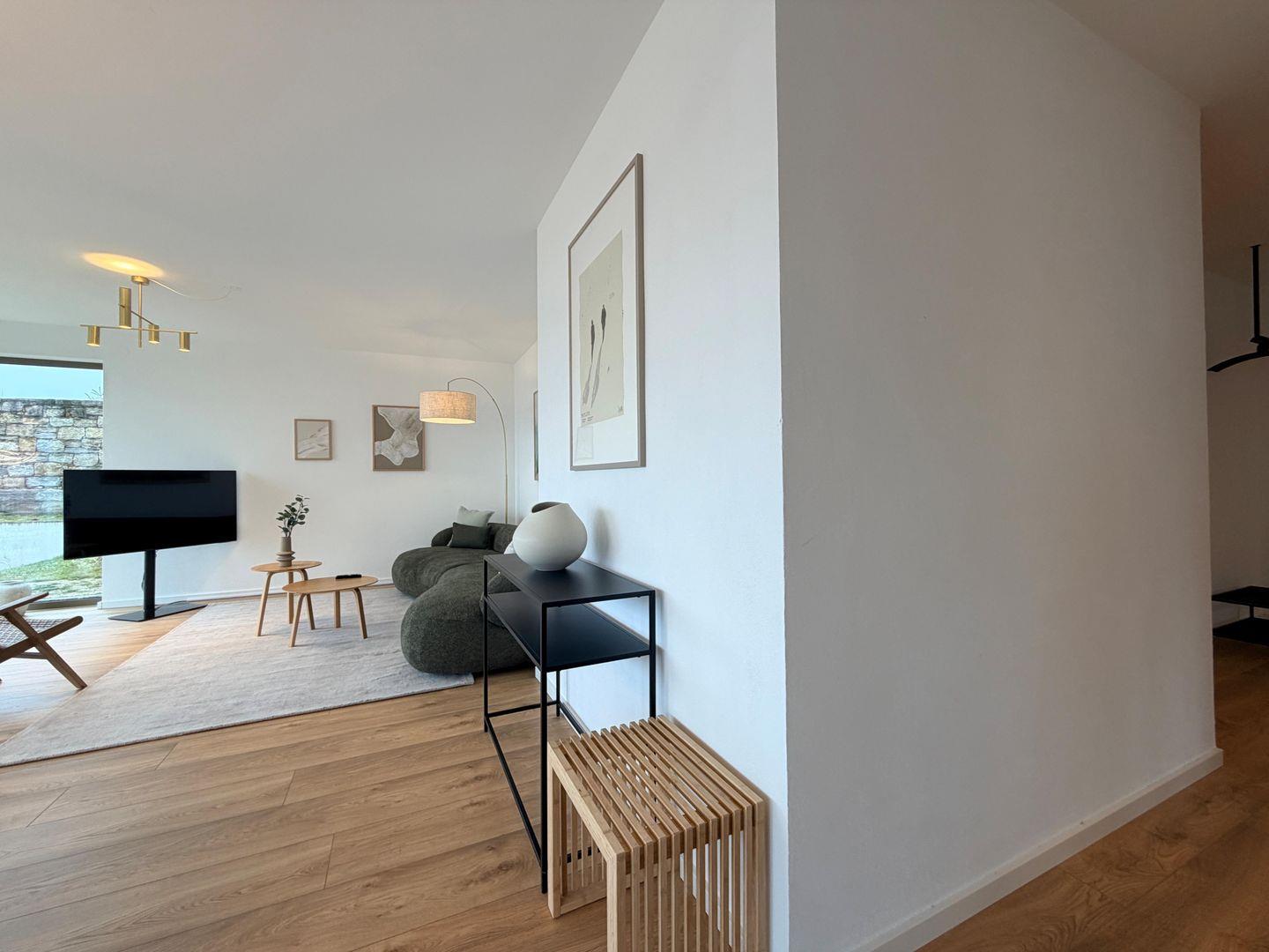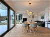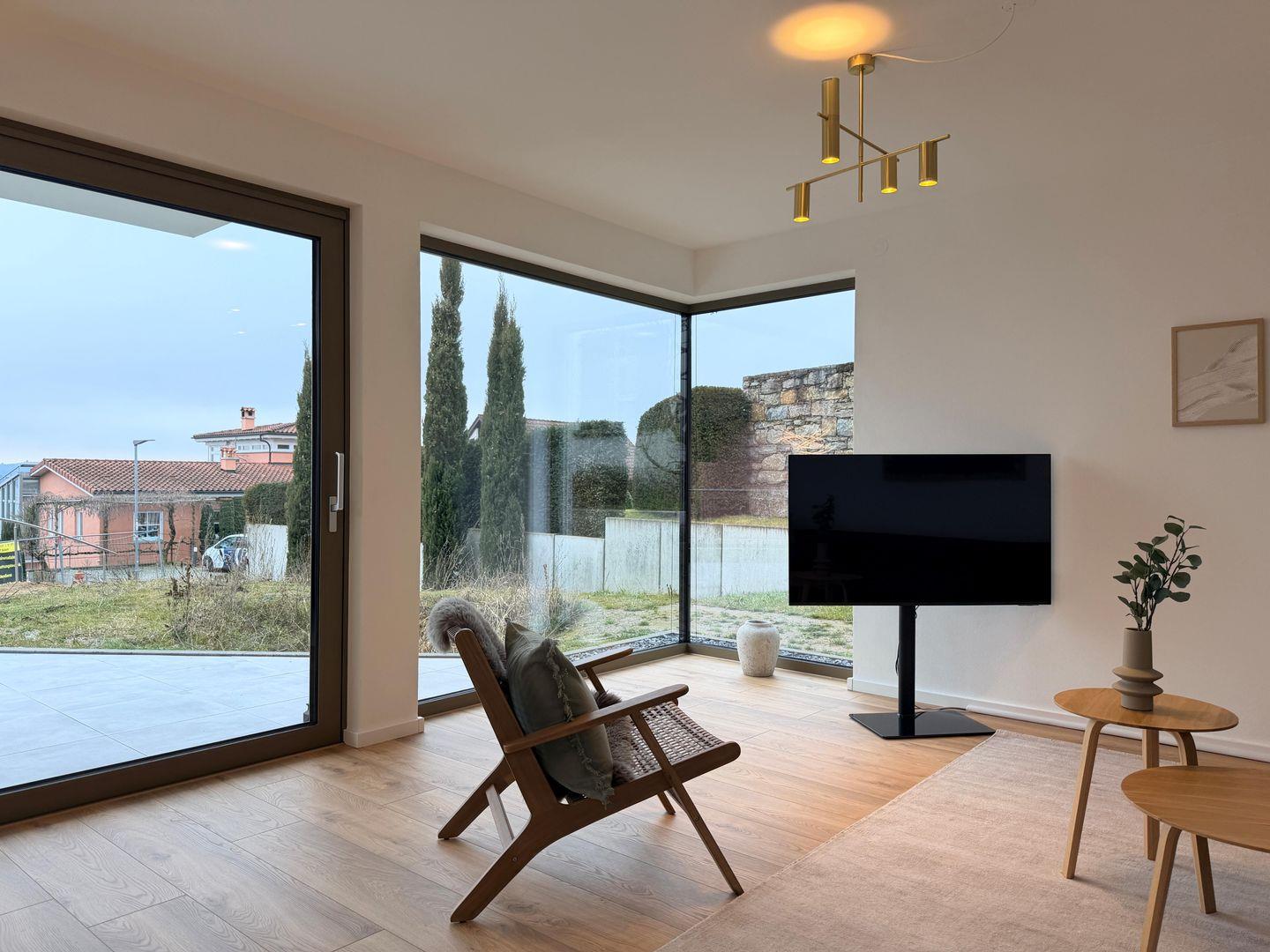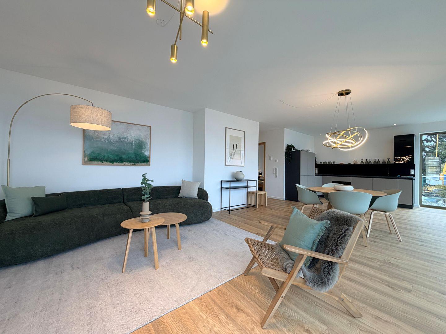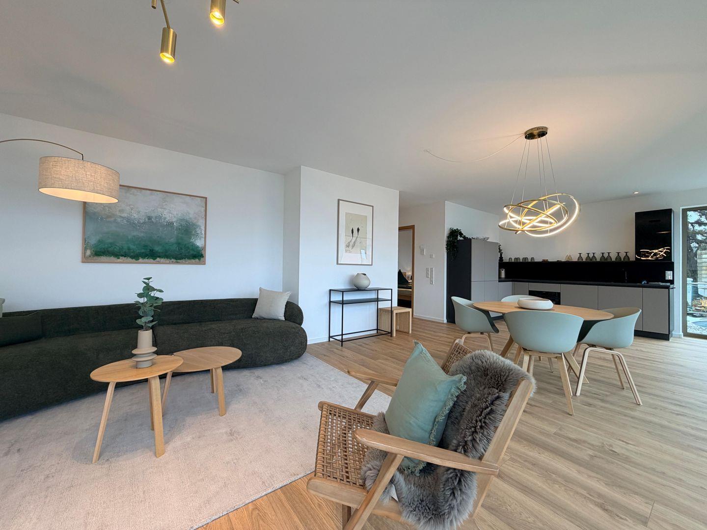 Der offen gestaltete Wohn- und Essbereich mit bodentiefen Fenstern sorgt für viel Licht und eine besonders angenehme Wohnatmosphäre. Die moderne Küche ist vollständig ausgestattet und fügt sich harmonisch in den Wohnbereich ein – perfekt für gemeinsame Abende nach einem Tag am See.