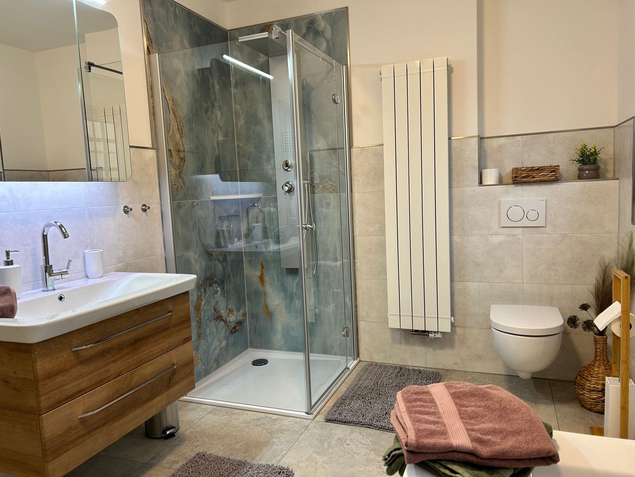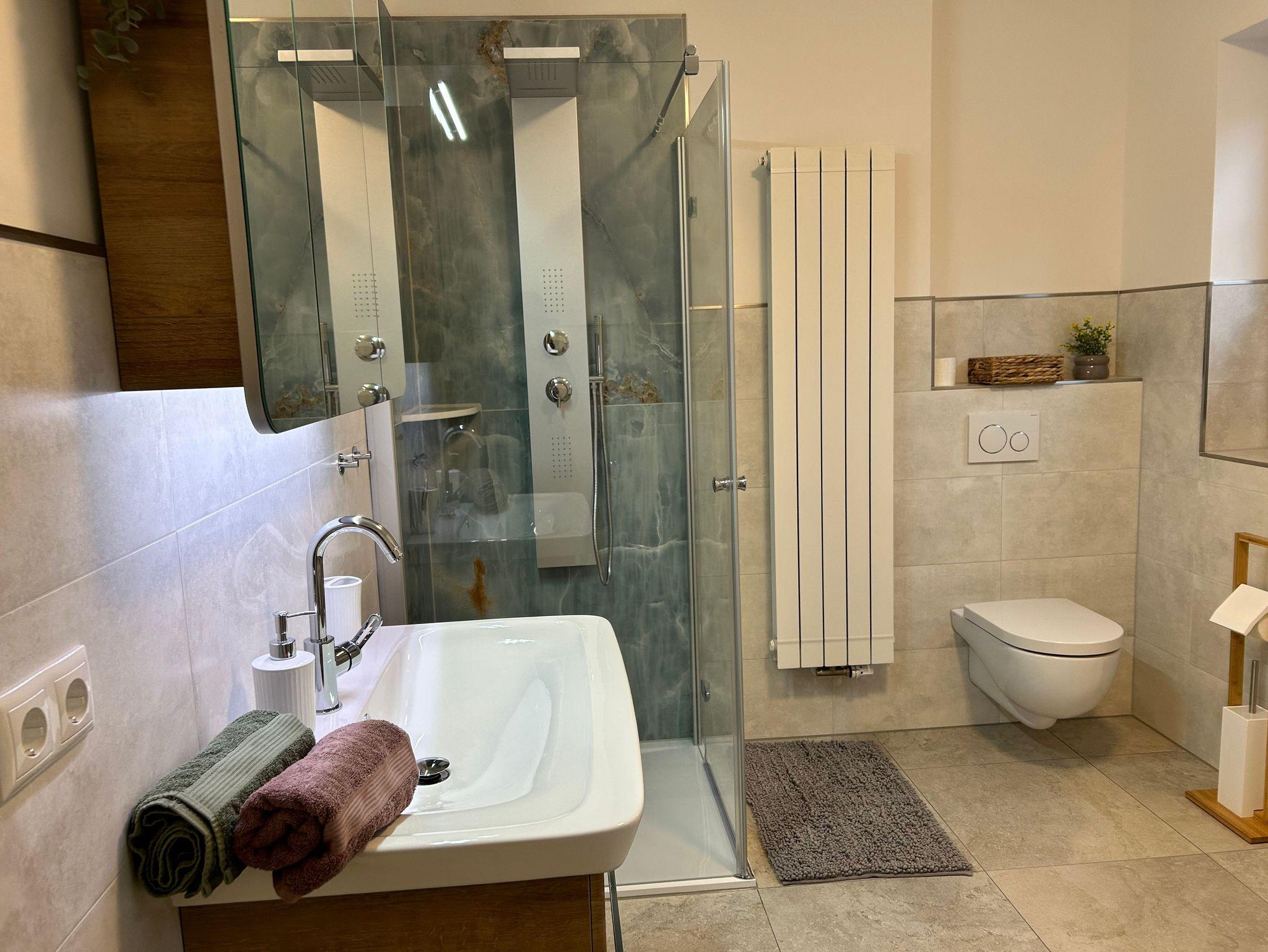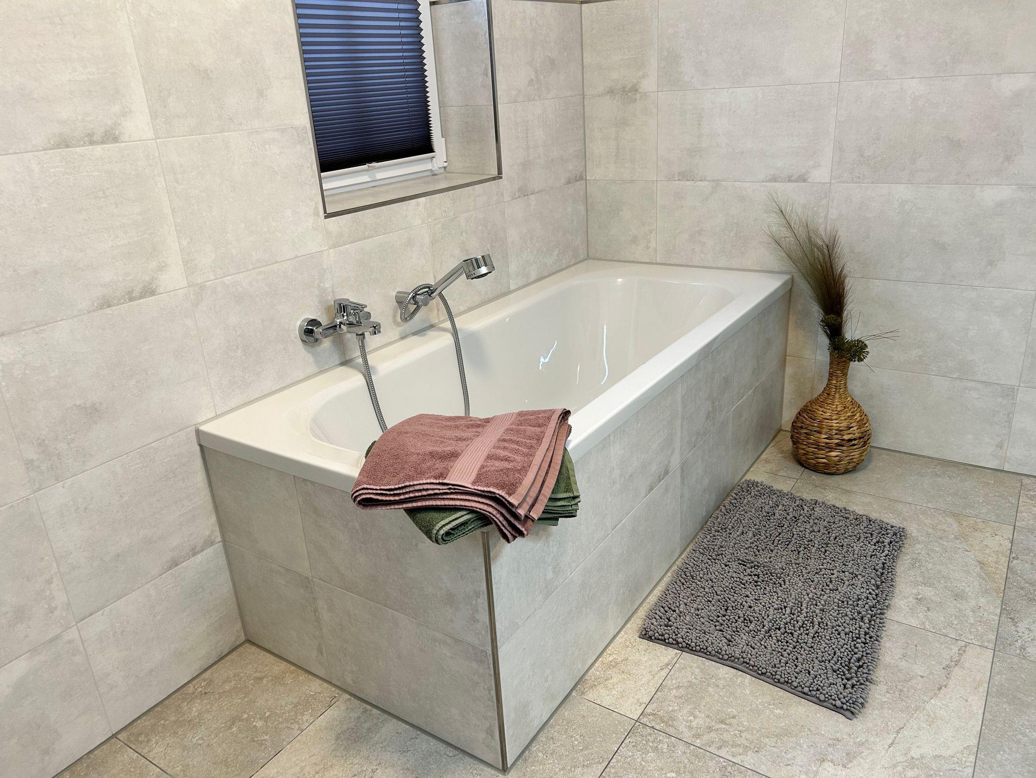 • 1 Badezimmer mit ebenerdiger Dusche, Badewanne, Toilette, Waschmaschine, Haartrockner, Handtücher