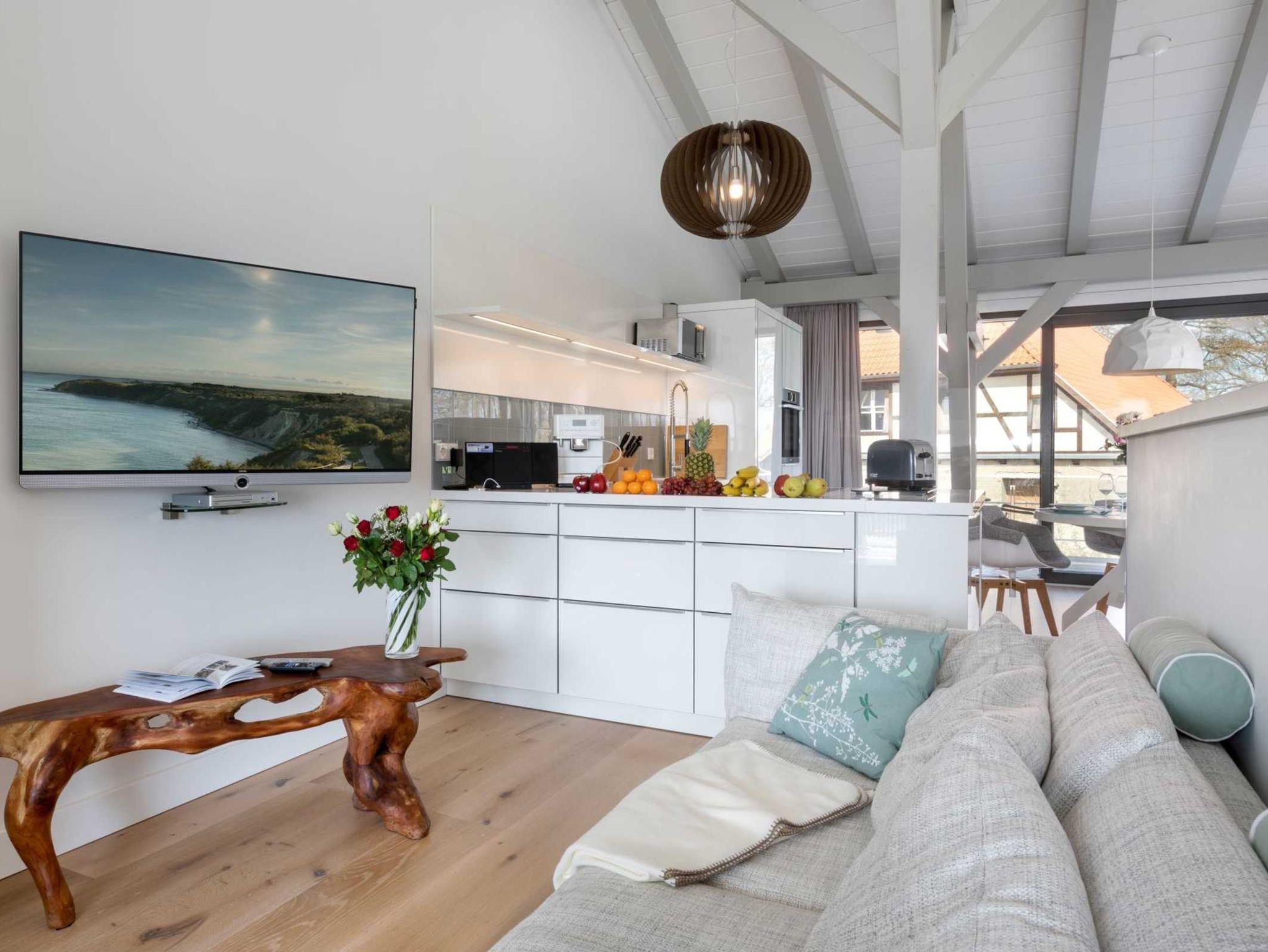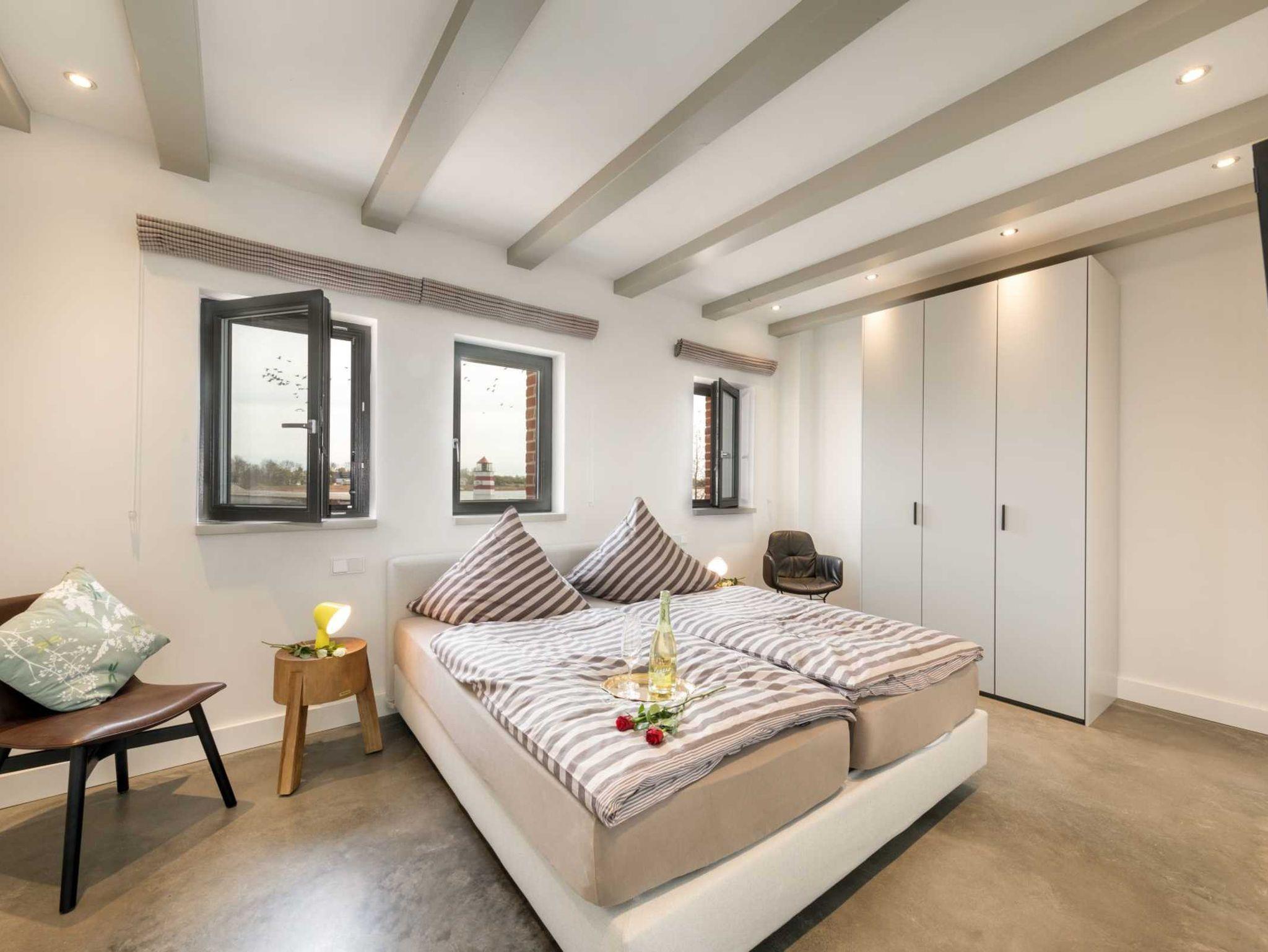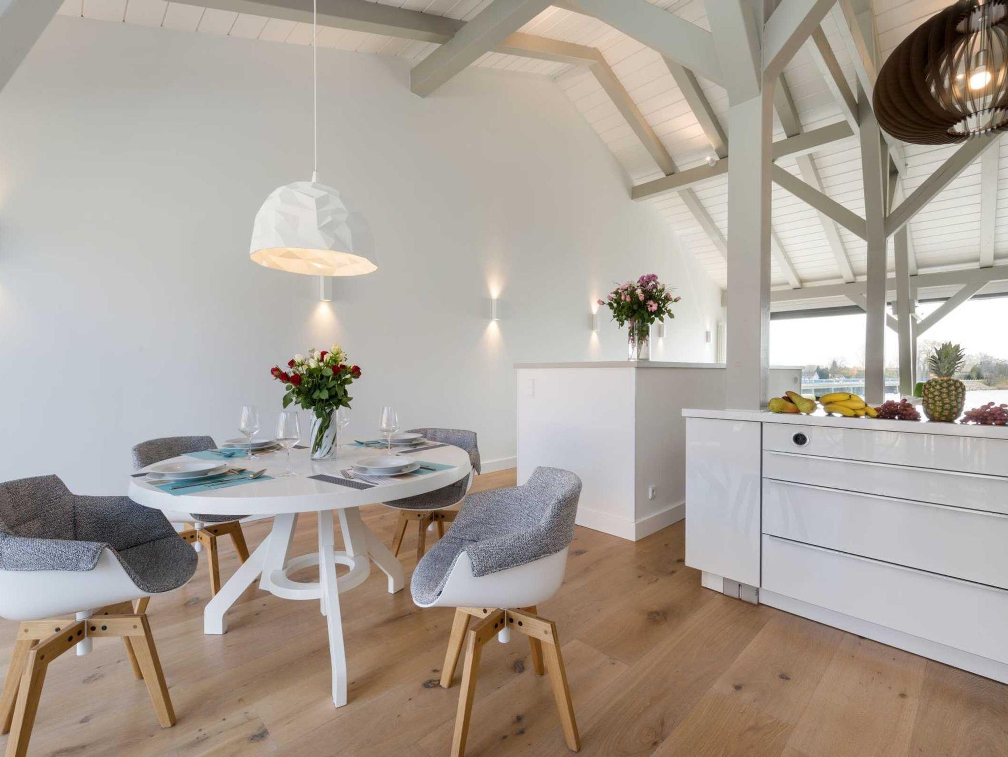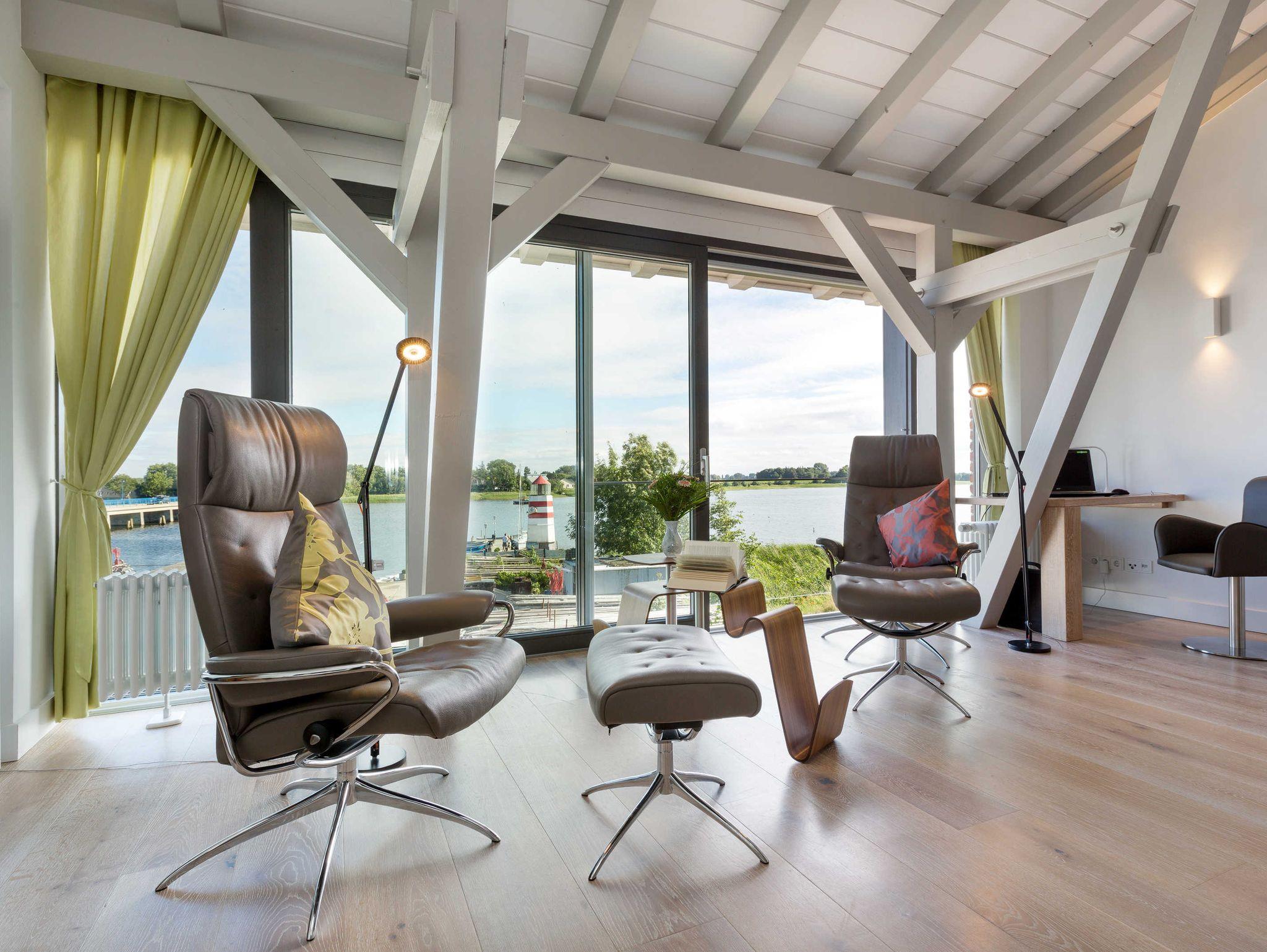 Vor allem aber hat die Aussicht vom Wohnzimmer aus ihren Reiz, denn dort kann man seinen Blick über den Ausläufer der Ostsee schweifen lassen. Der Balkon auf der Westseite lädt darüber hinaus dazu ein, die Sonnenstrahlen ganz entspannt zu genießen.