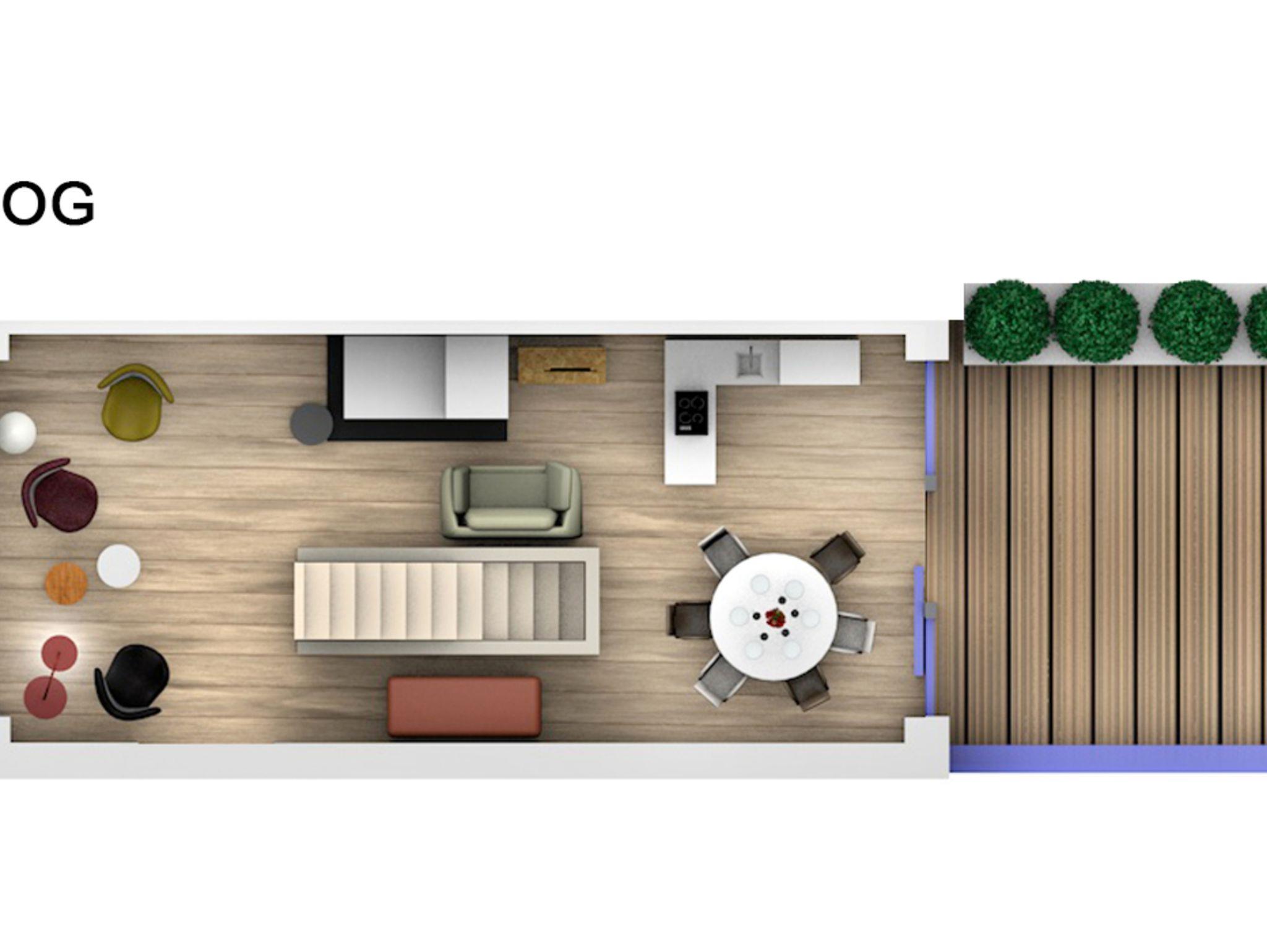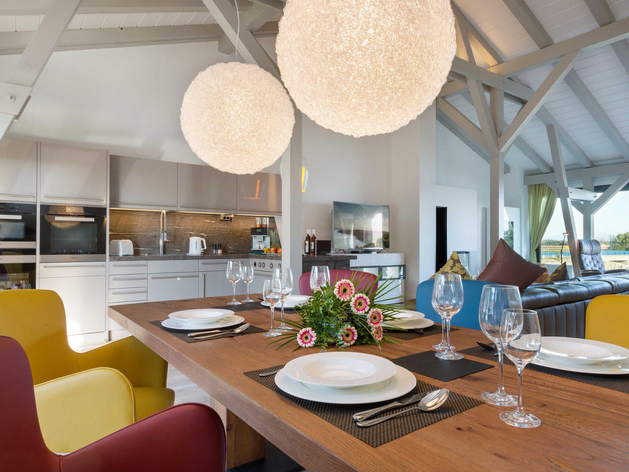 Während sich der großzügige Schlafbereich im Erdgeschoss befindet, beeindruckt der Wohnbereich im Obergeschoss mit bis zu vier Meter hohen Decken. Das luxuriöse Interieur wird durch die komplett ausgestattete Küche, drei HDTV-Fernseher, eine HiFi-Anlage, Designermöbel und natürlich einen Internetzugang per WLAN abgerundet.