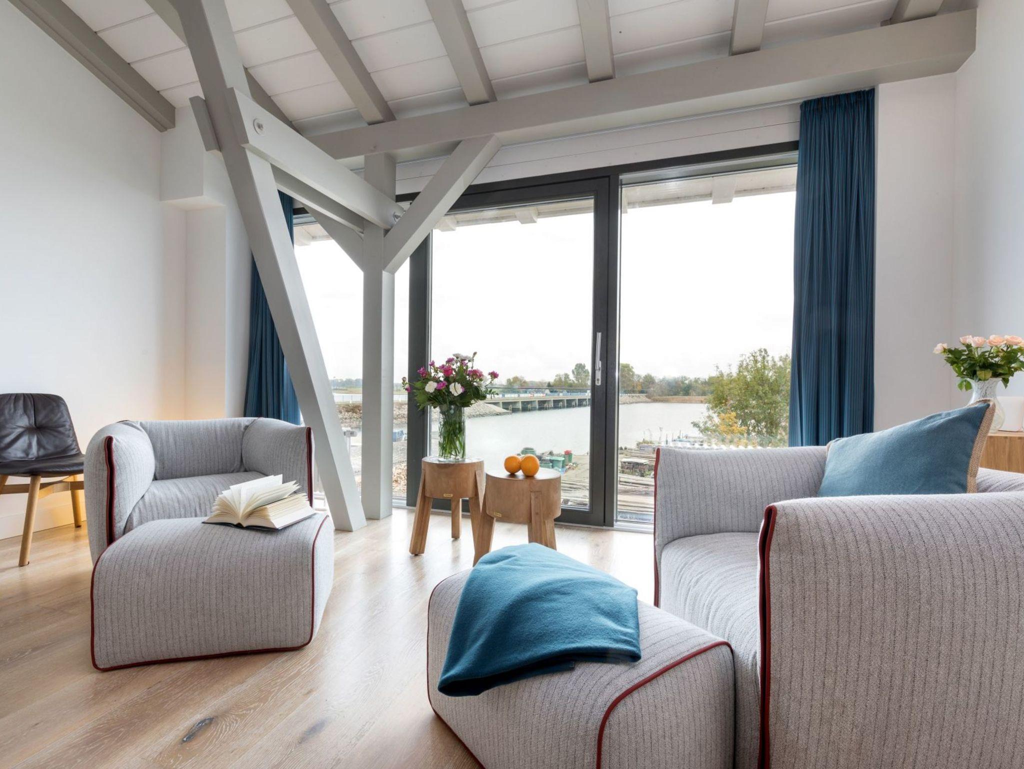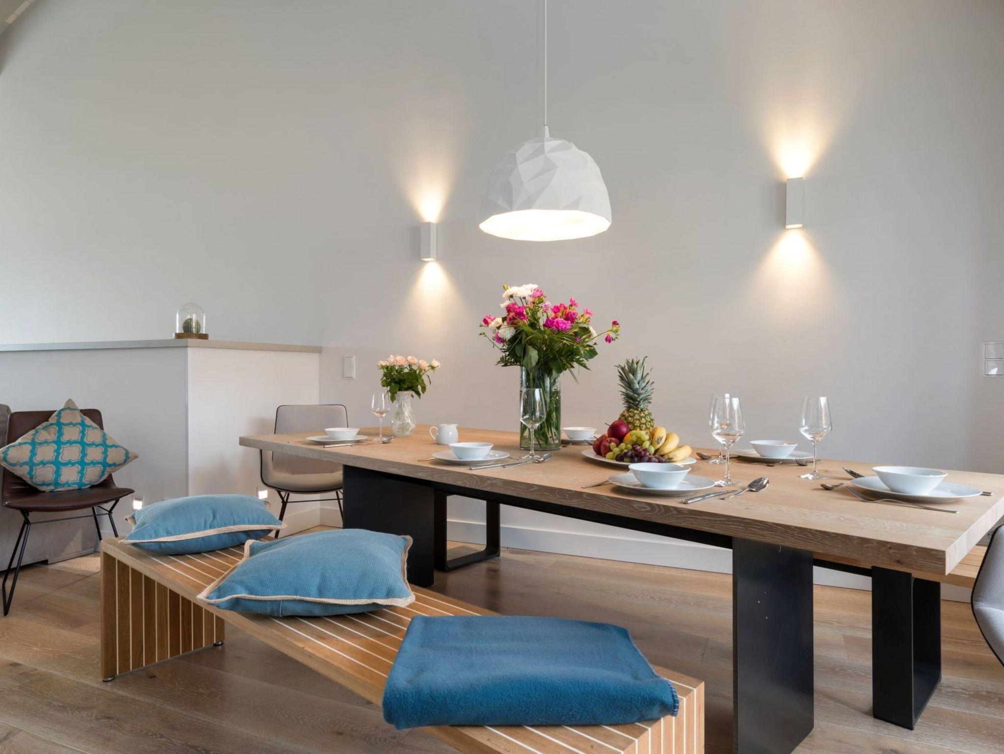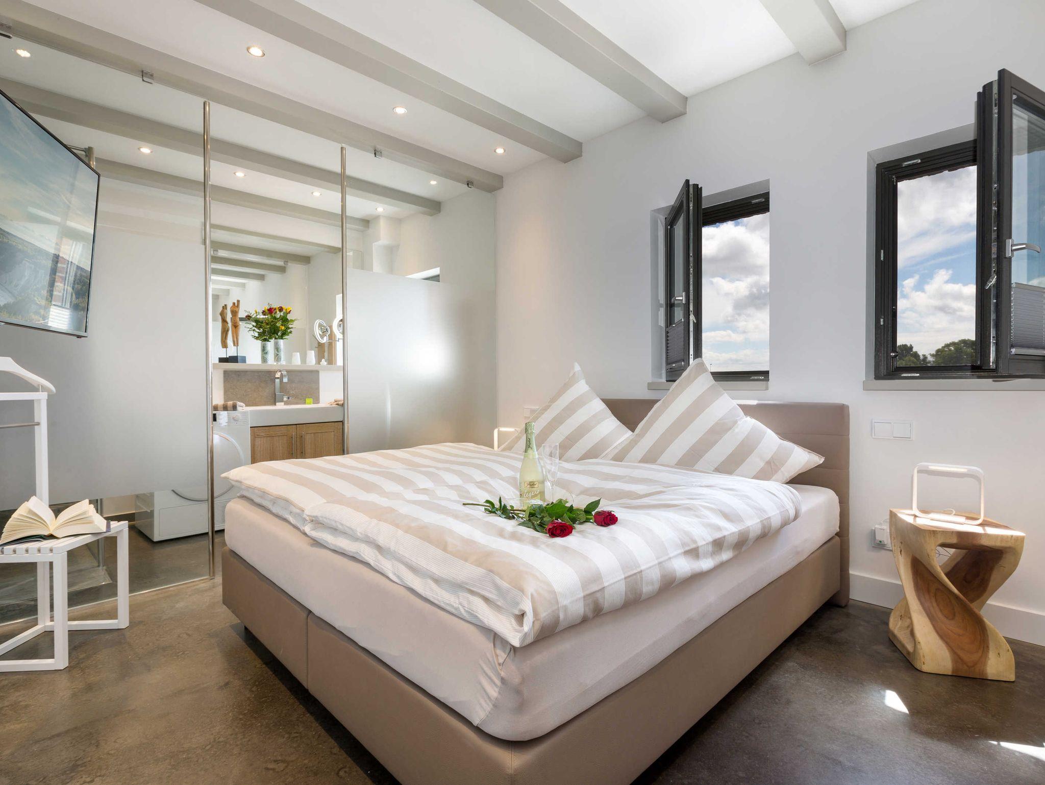 Während sich der großzügige Schlafbereich im Erdgeschoss befindet, beeindruckt der Wohnbereich im Obergeschoss mit bis zu vier Meter hohen Decken. Das luxuriöse Interieur wird durch die komplett ausgestattete Küche, drei HDTV-Fernseher, eine HiFi-Anlage, Designermöbel und natürlich einen Internetzugang per WLAN abgerundet.