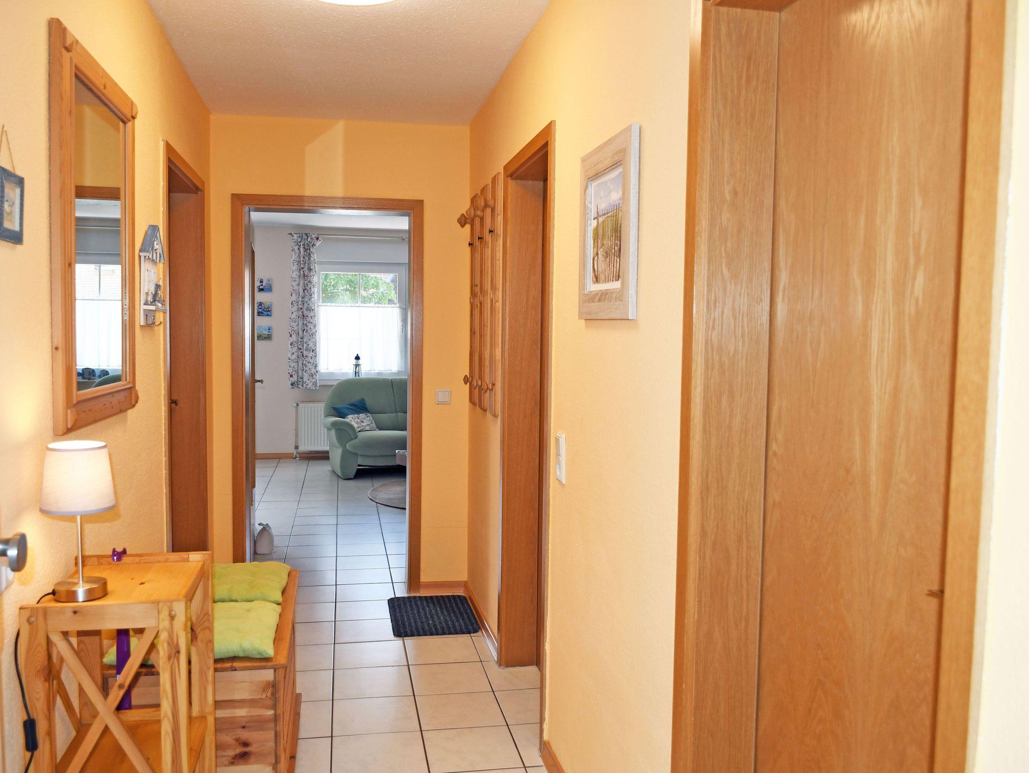 Unsere Ferienwohnung mit Terrasse und Strandkorb ist ca. 70 qm groß, hat Platz für maximal 4 Erwachsene sowie ein Kind bis 3 Jahre im Kinderreisebett und wurde sehr liebevoll und modern eingerichtet. Über einen Flur im Erdgeschoss gelangt man in die Wohnung.