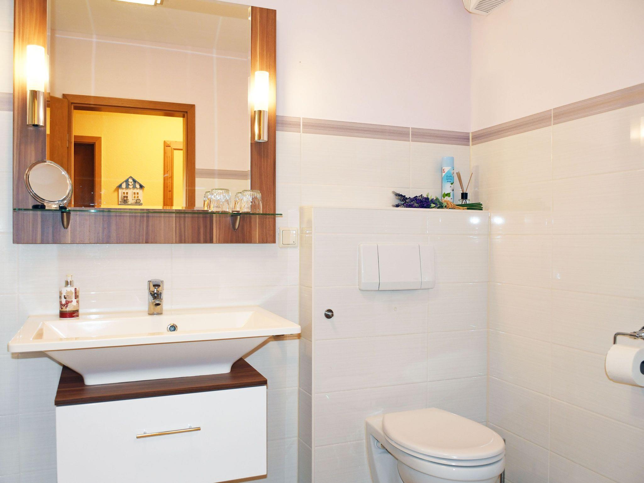 Das große Bad ist mit Dusche, WC und Waschtisch sowie Handtuchtrockner ausgestattet.