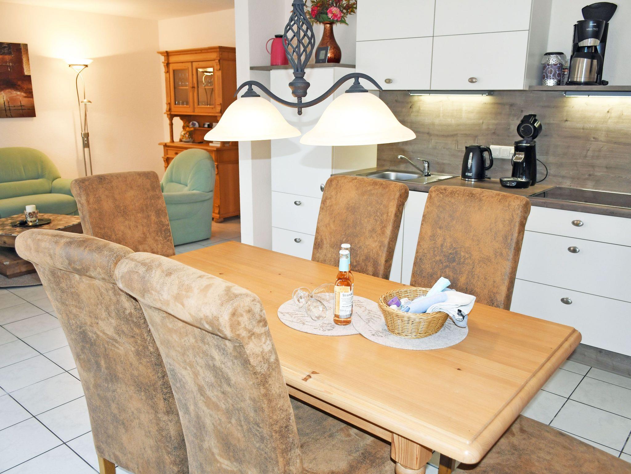 In dem großzügigen Wohnraum befinden sich eine Sitzcouch mit Tisch und Sessel, Leselampe und Flachbild-TV. Hier steht auch ein großer Esstisch mit Stühlen. Die Küchenzeile im Wohnbereich ist mit einem Herd, Spülmaschine, Wasserkocher, Kaffeemaschine, Toaster und Kühlschrank mit Gefrierfach komplett ausgestattet.