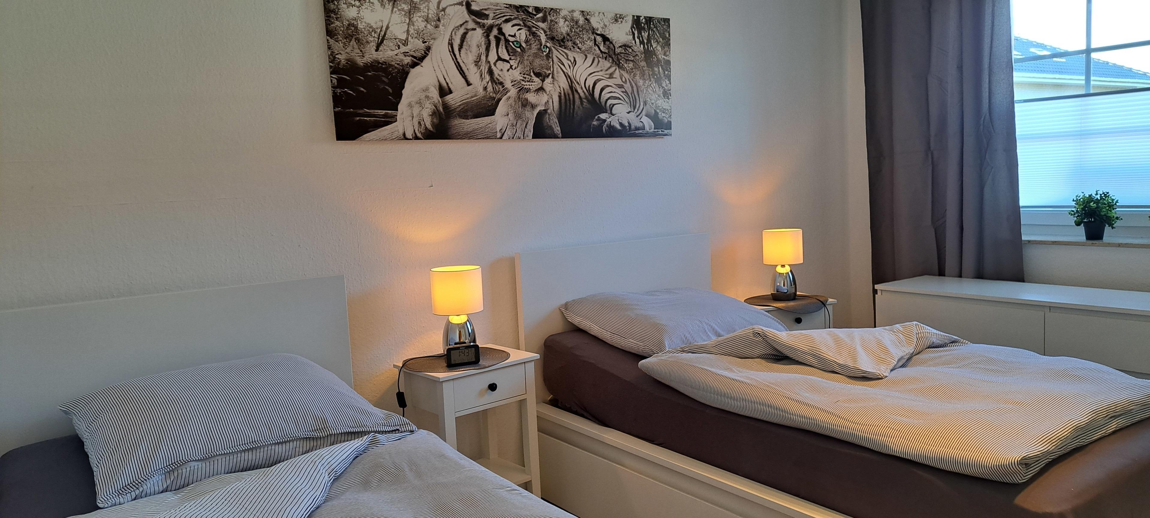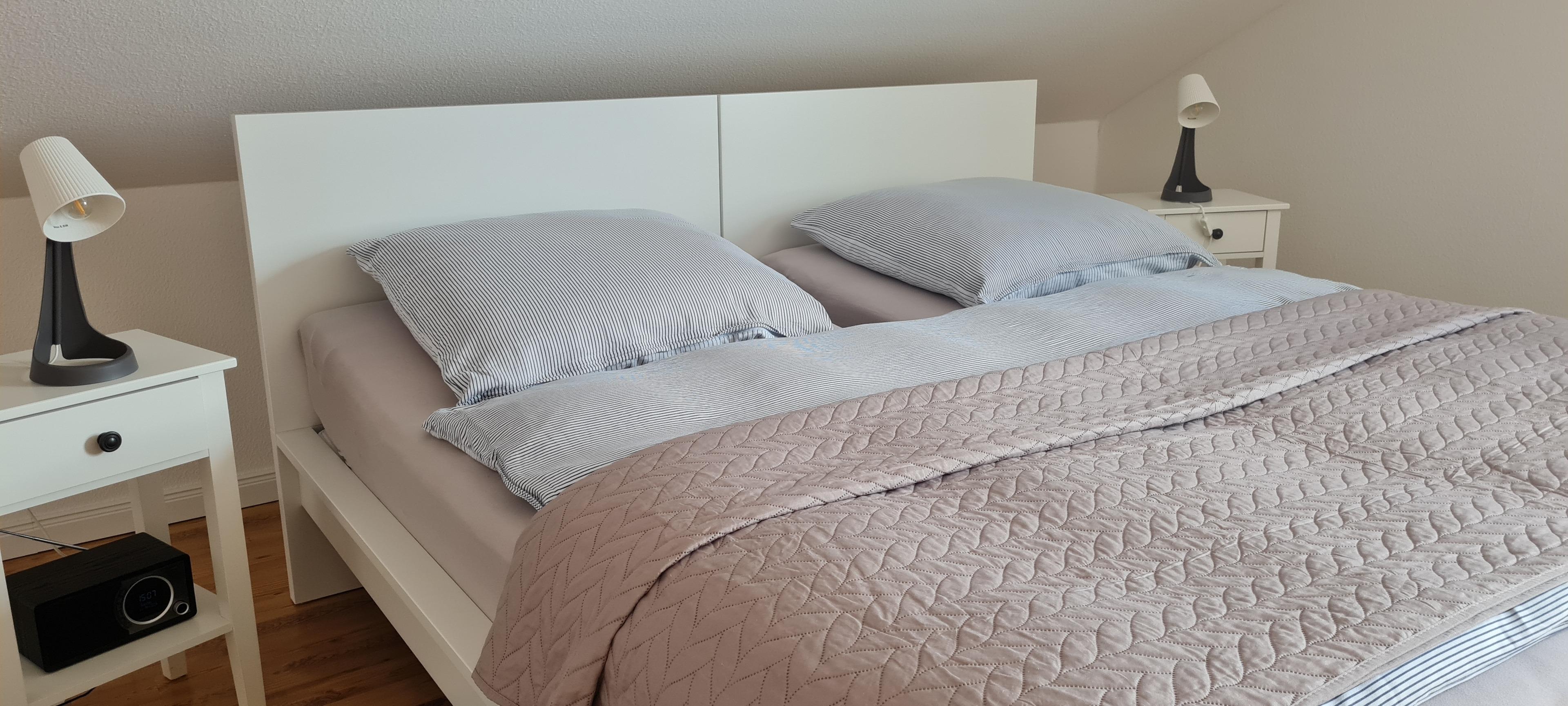 Die Aufteilung im Obergeschoss ist 1 Schlafzimmer mit Doppelbett 200×200 cm und 1 Schlafzimmer mit 2 Einzelbetten je 100×200 cm sowie 1 Bad .
