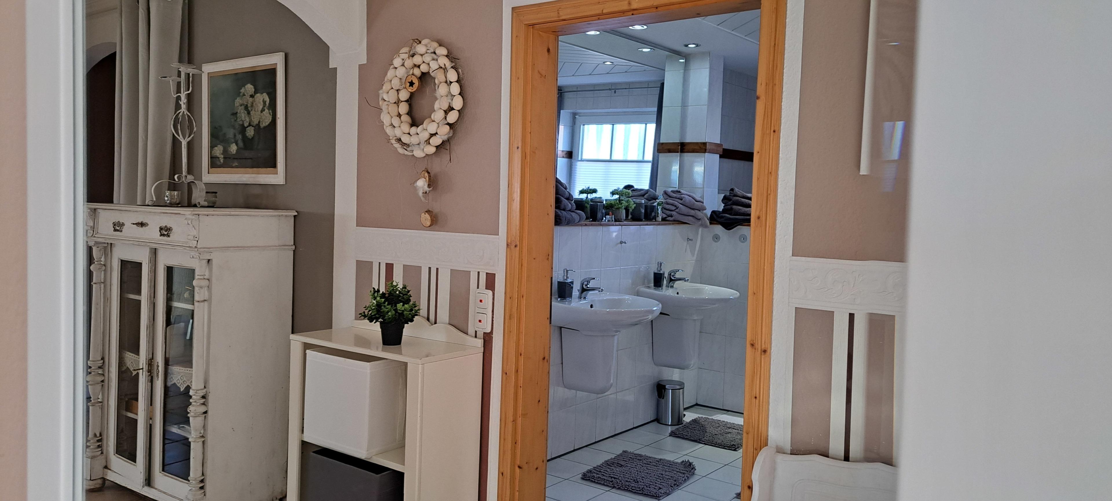 Das Bad hat eine Größe von 18 m² und ist mit 2 Waschbecken sowie 1 ebenerdige Dusche und 1 WC ausgestattet.