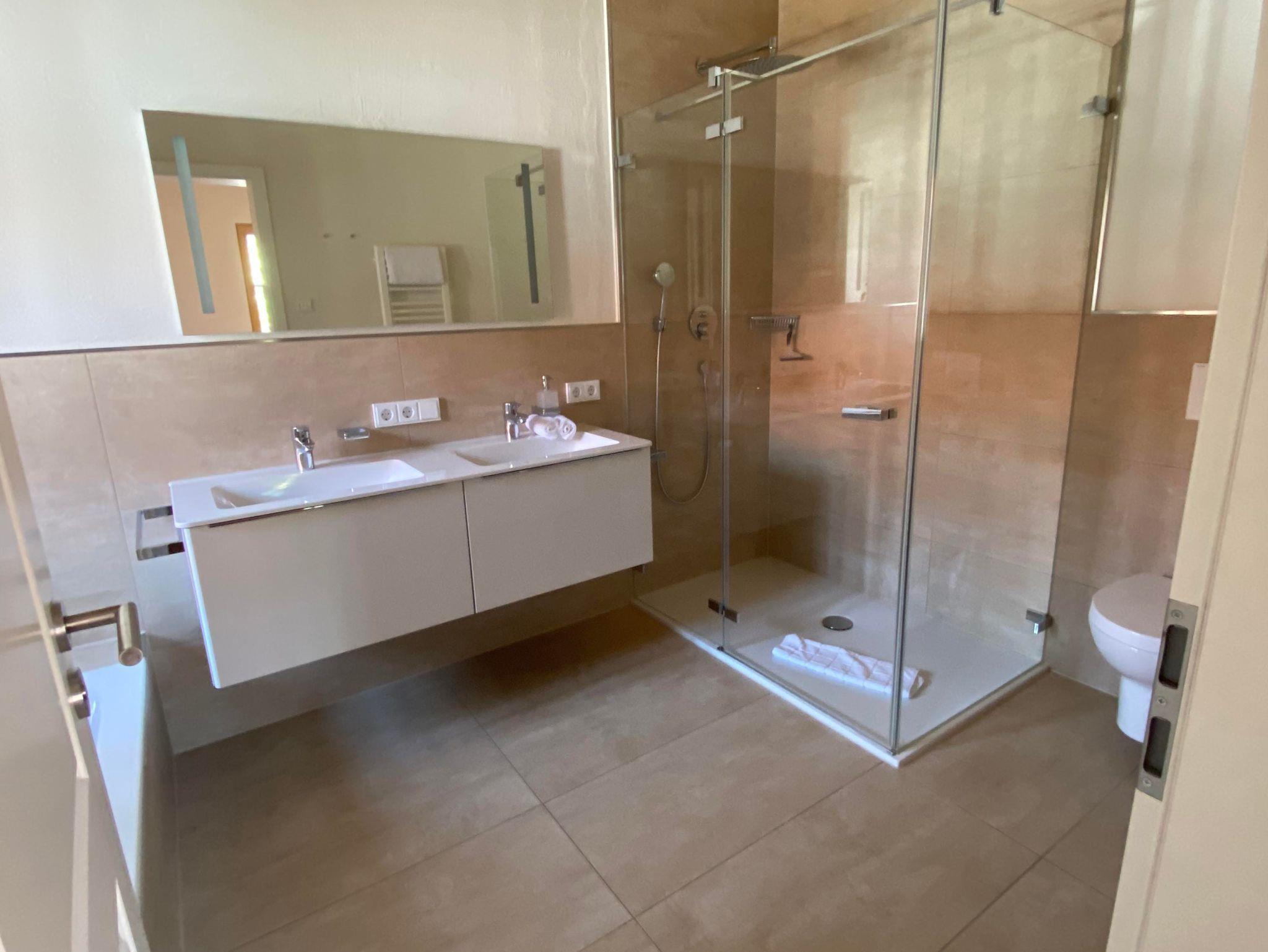 Diese Ferienwohnung für 3-9 Personen verfügt über ein zentral in der Wohnung gelegenen Wohnbereich mit integrierter Küche mit Essbereich und drei separaten Schlafzimmern. Sie verfügt über eine Küche mit Kühlschrank, Spülmaschine, Ceran-Herd, Wasserkocher, Toaster und Kaffeevollautomat, sowie zwei Bädern mit Dusche und WC, zudem im Hauptbad über eine Badewanne. Vom Küchen- oder Wohnbereich, sowie vom Hauptschlafzimmer gelangen Sie auf die 60qm Sonnenterrasse.