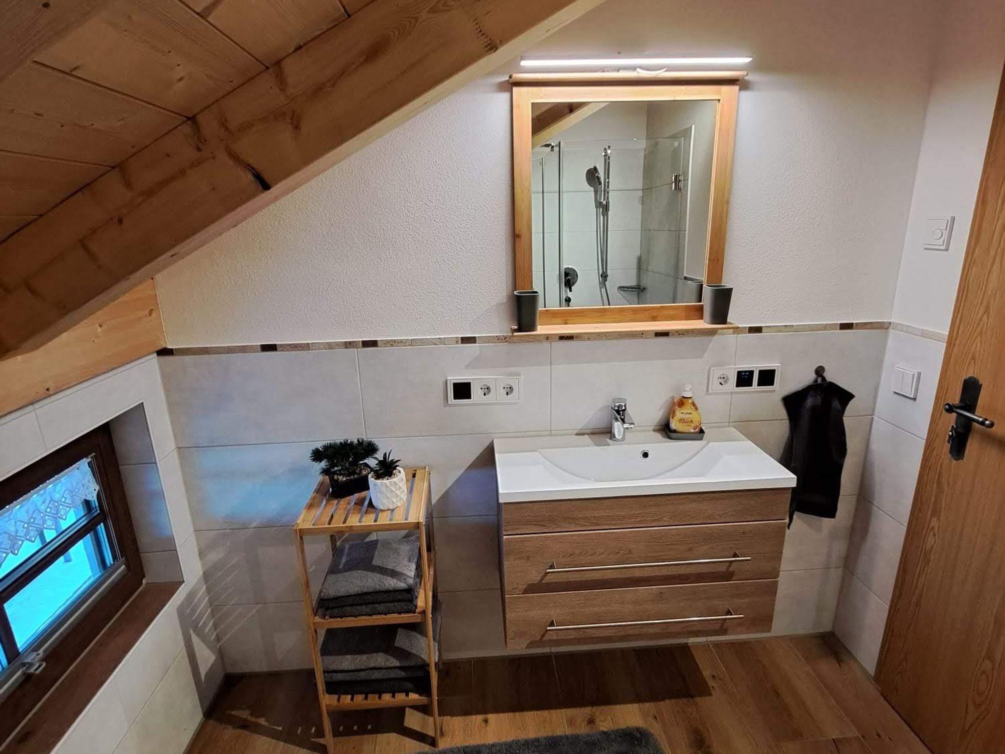 Über eine Treppe gelangen Sie in die ca. 60 m² große Ferienwohnung im Dachgeschoss. Diese bietet Platz für 2-4 Personen.