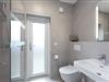 Gleichzeitig befindet sich im Erdgeschoss eine Garderobe mit Sitzbank, Garderobenständer, Spiegel und das Gäste WC mit einer bodengleichen Dusche, WC und Waschtisch, hier ist das Besondere, dass Sie durch die eingebaute Außentür gleich in den offenen Bereich nach draußen gelangen und dort die Außendusche und die Sauna nutzen können.