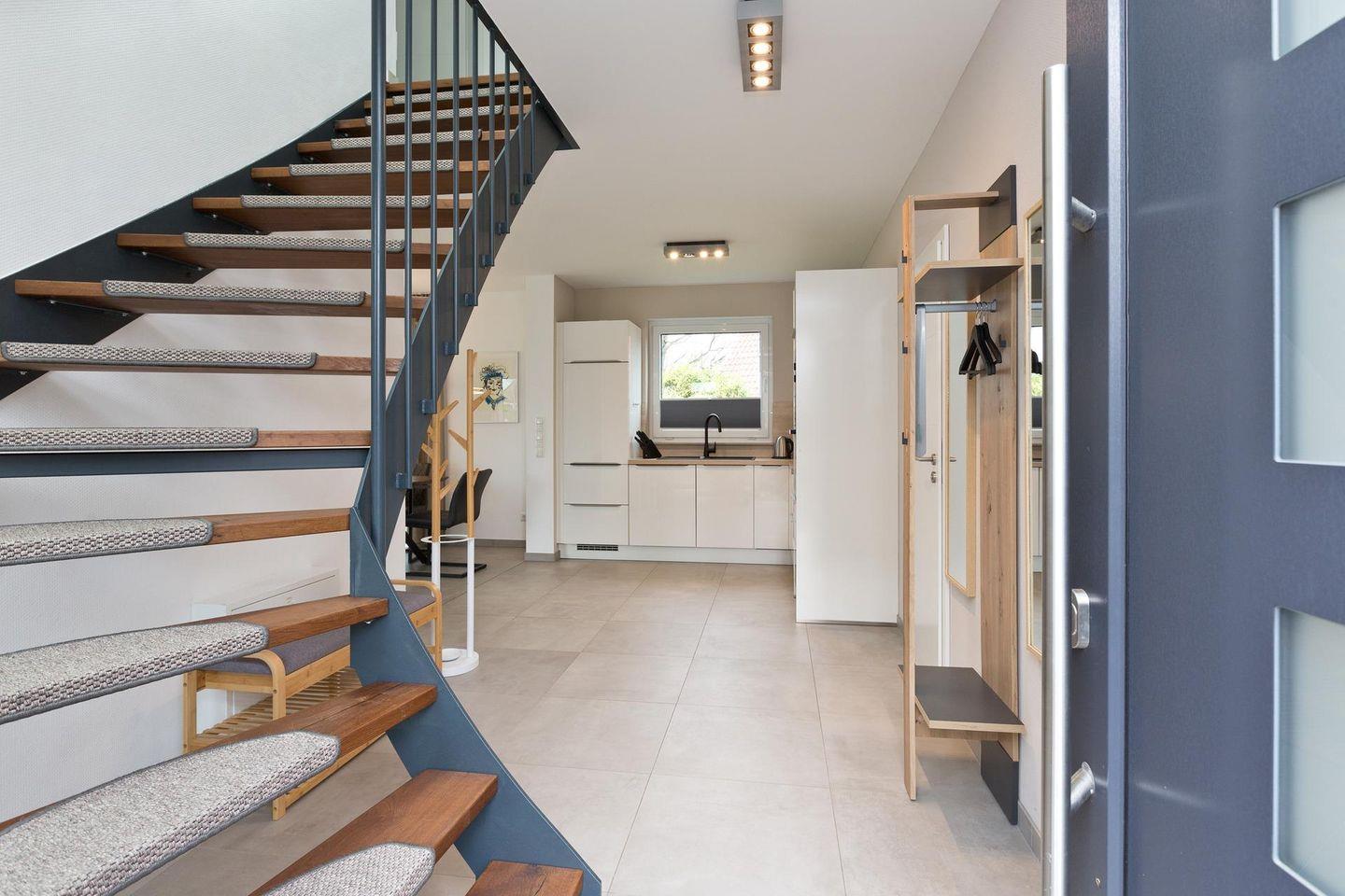 Große bodentiefe Fensterelemente öffnen den kompletten Wohnbereich in den Garten. Das Haus bietet neben der Fußbodenheizung auch eine Kühlung für alle Räume an. Zusätzlich sind alle Räume mit eine integrierter Wohnraumbelüftung versehen die ein fantastisches Raumklima erzeugt.