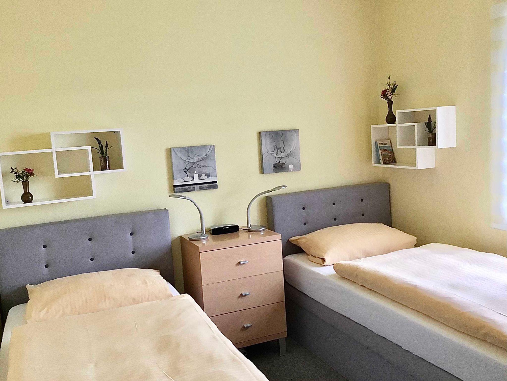 Schlafzimmer 2 mit 2 Boxspringbetten, Nachttisch/Beleuchtung, Kleiderschrank, Kleiderablage, Stuhl