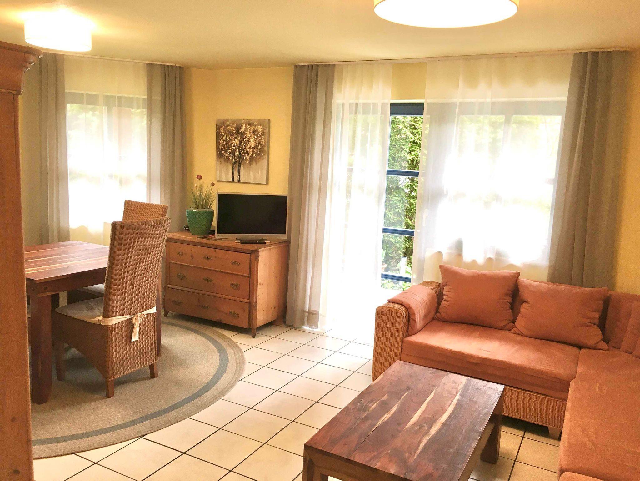 Diese Ferienwohnung im Parterre mit Terasse verfügt auf 69 m² über 2 Schlafräume (4 Betten) sowie eine Schlafcouch im Wohnbereich, Dusche, WC, Fön, Flachbild-TV, Stereoanlage/CD, DVD und WLAN. Die separate Küche ist sehr gut ausgestattet mit Kühlschrank,Geschirrspüler, Cerankochfeld, Backofen, Mikro, Kaffeemaschine, Toster. Dusche/WC mit Waschmaschine. Die Wohnung hat Südausrichtung und ist für bis zu 5 Personen geeignet.