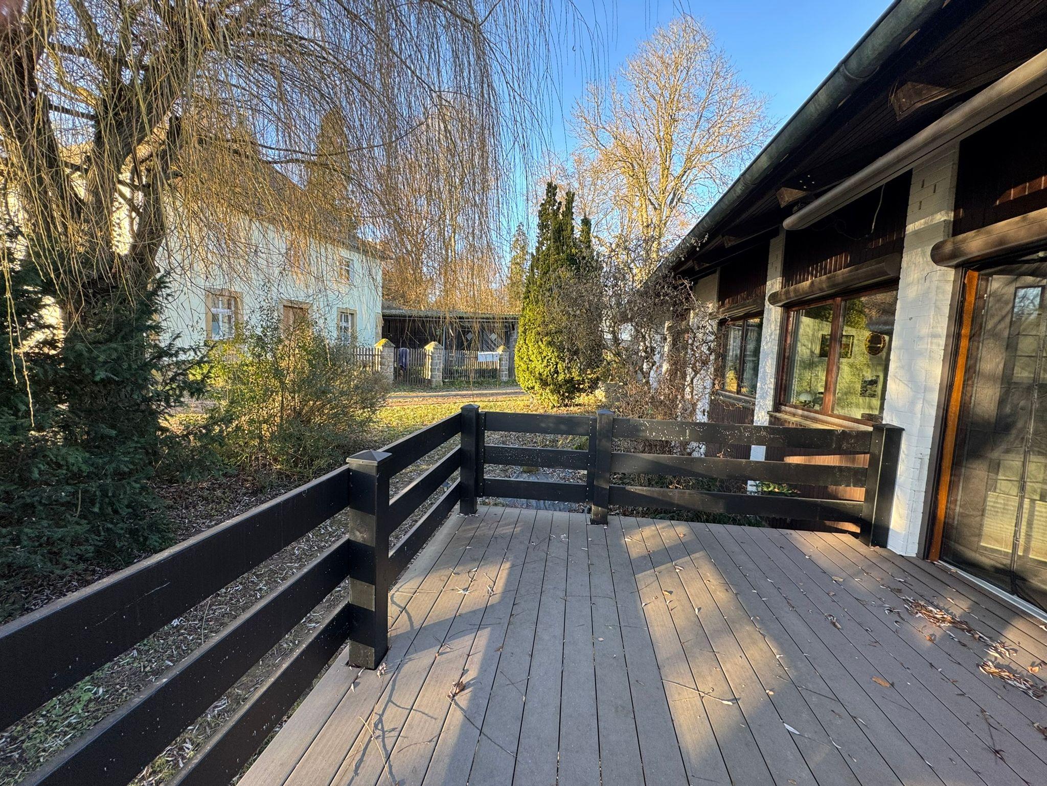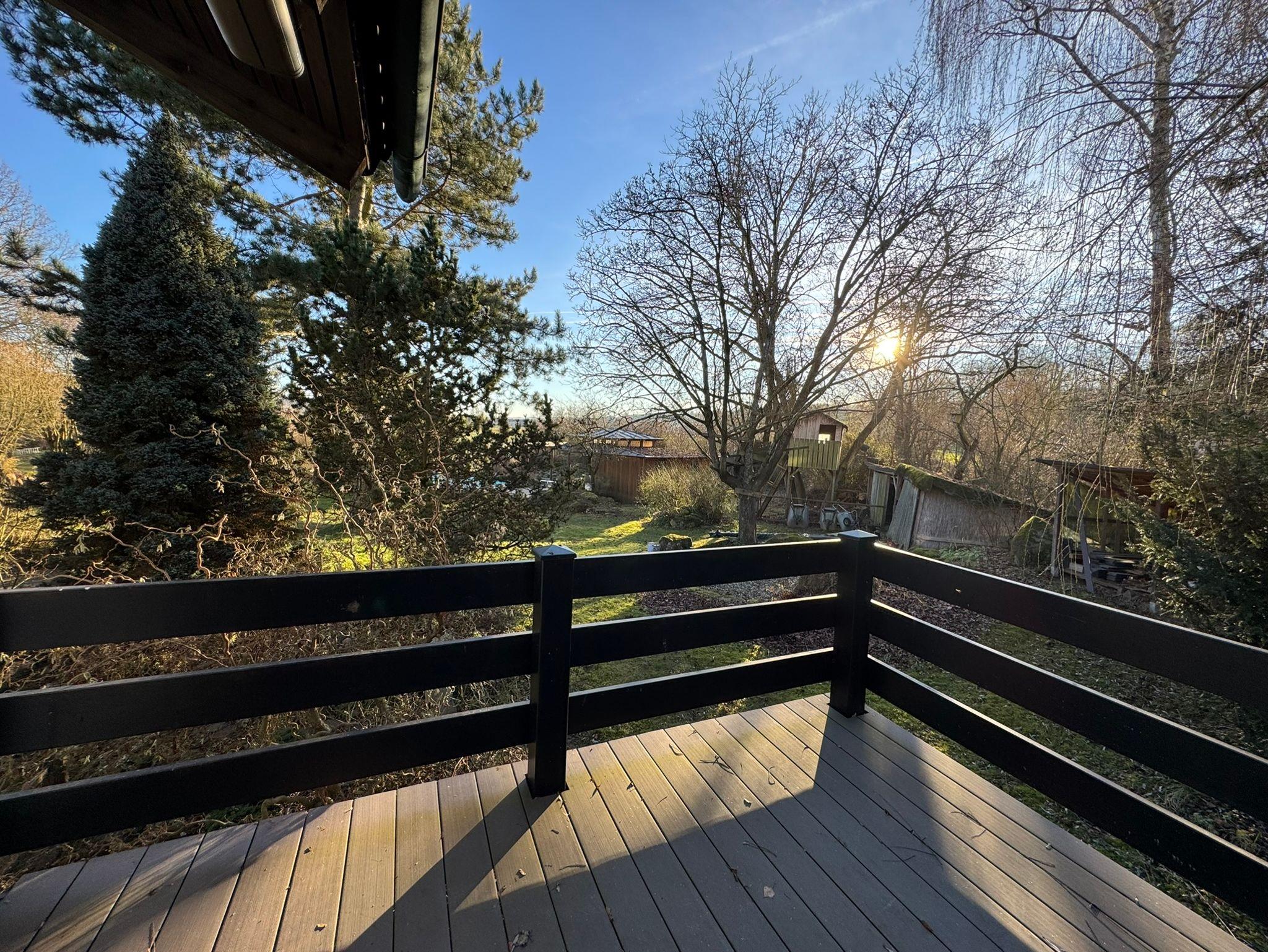 Das Highlight der Wohnung ist die große, erhöht liegende Holzterrasse inklusive Geländer außen herum, welche sich in unseren üppigen, weitläufigen Garten hinein erstreckt. Hier sind auch wir in unserer Freizeit anzutreffen. Unser grüner Rückzugsort wurde 2025 vom Landesbund für Vogelschutz als Vogelfreundlicher Garten ausgezeichnet. Geschützt von Birke, Kiefer und der üppigen Weide lässt es sich wunderbar abschalten. (Elektrisch ausfahrbare Marquise vorhanden).