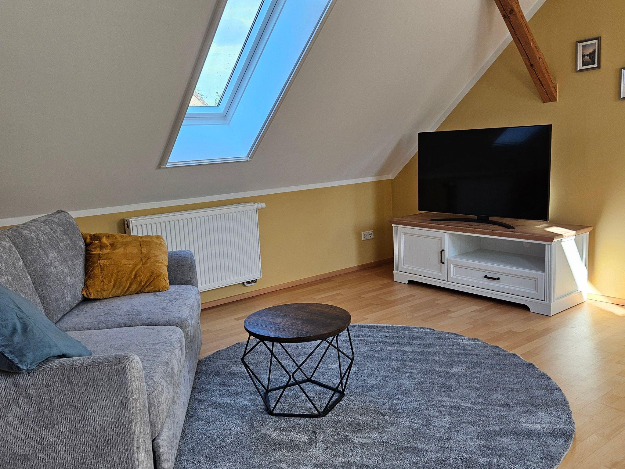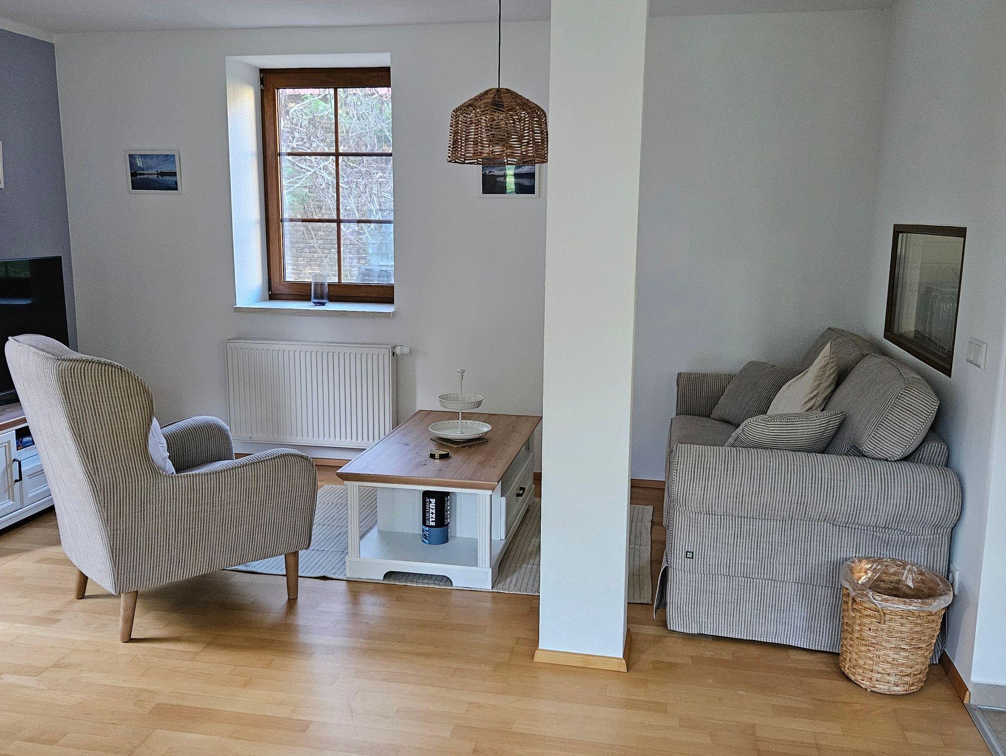 Ferienhaus über zwei Etagen mit zwei Schlafzimmer, offene Wohnküche, große möblierte Terrasse, Duschbad, Gäste-WC, Galerie mit Schreibtisch und Kaminofen