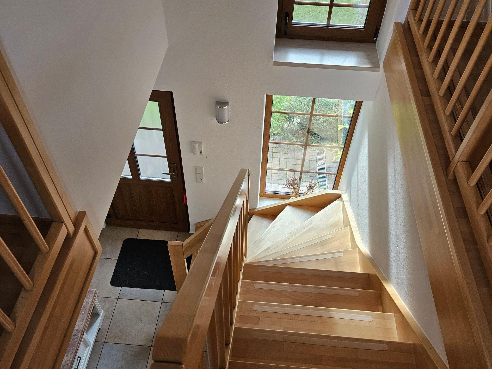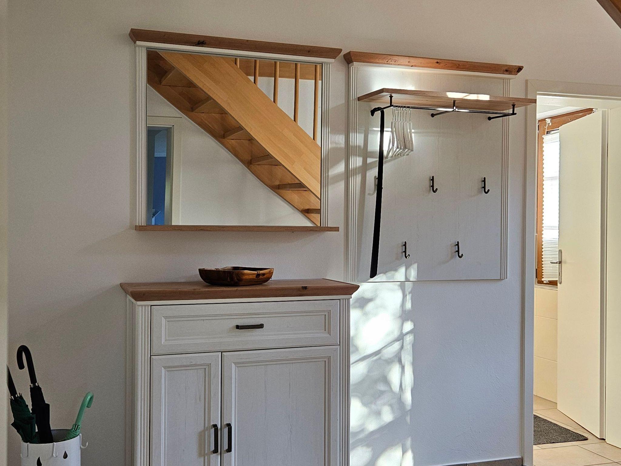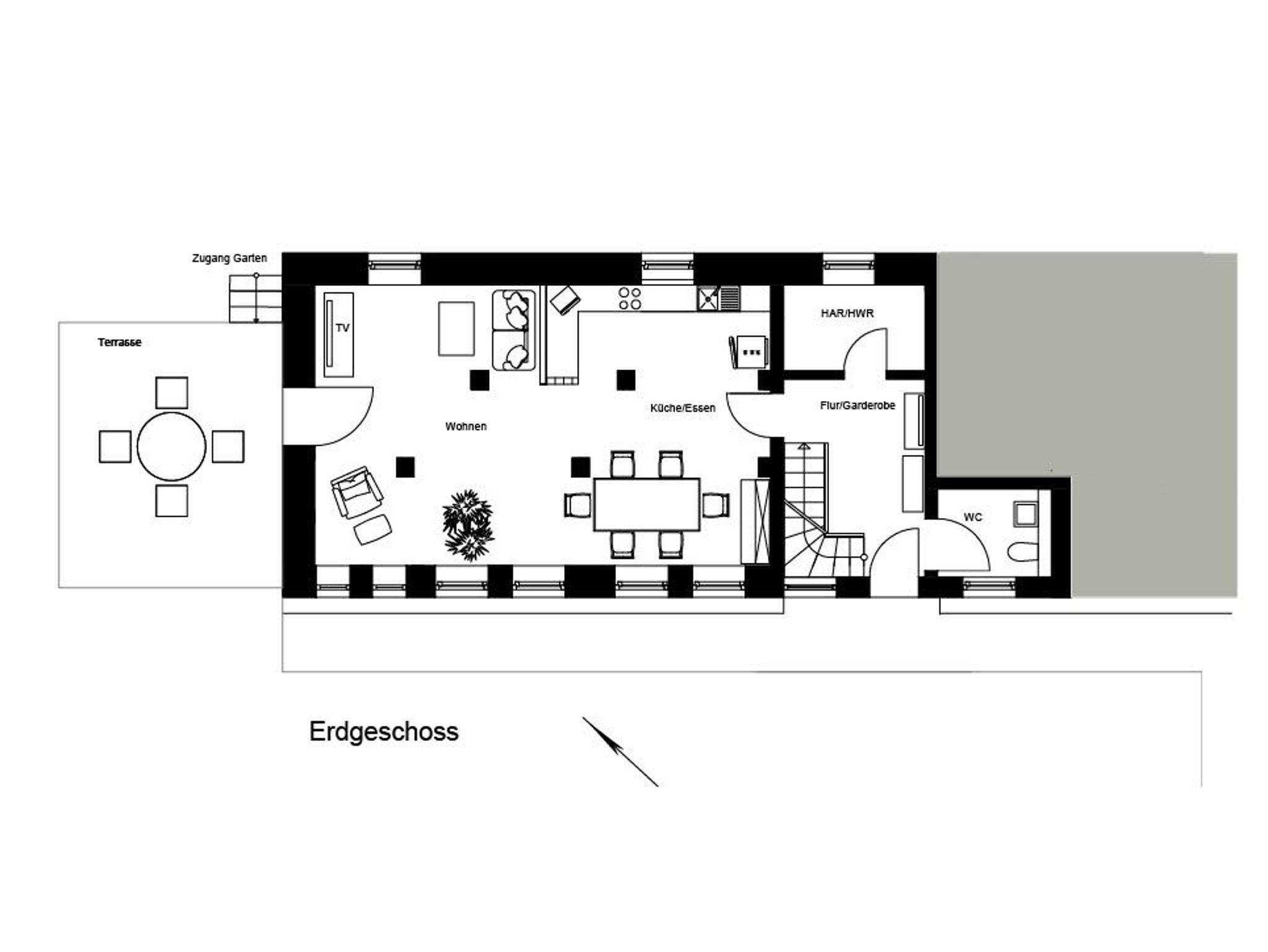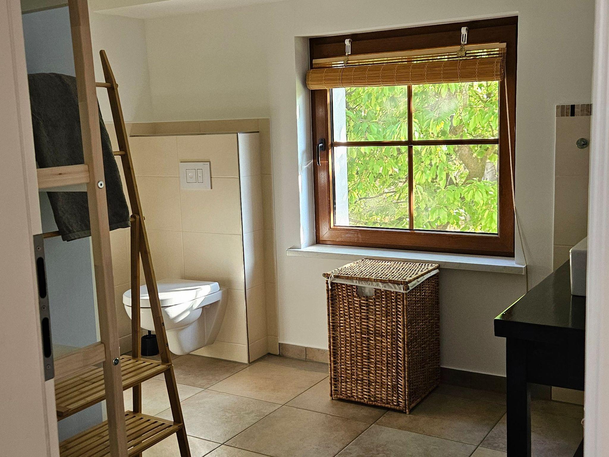 Das Haus verfügt über ein Duschbad im Obergeschoss sowie ein Gäste-WC im Erdgeschoss. Am Wohnbereich angeschlossen ist eine große Terrasse, von der man in den Garten gelangt. Dort kann der Sonnenuntergang an der Feuerstelle bei einem Glas Wein genossen werden.
