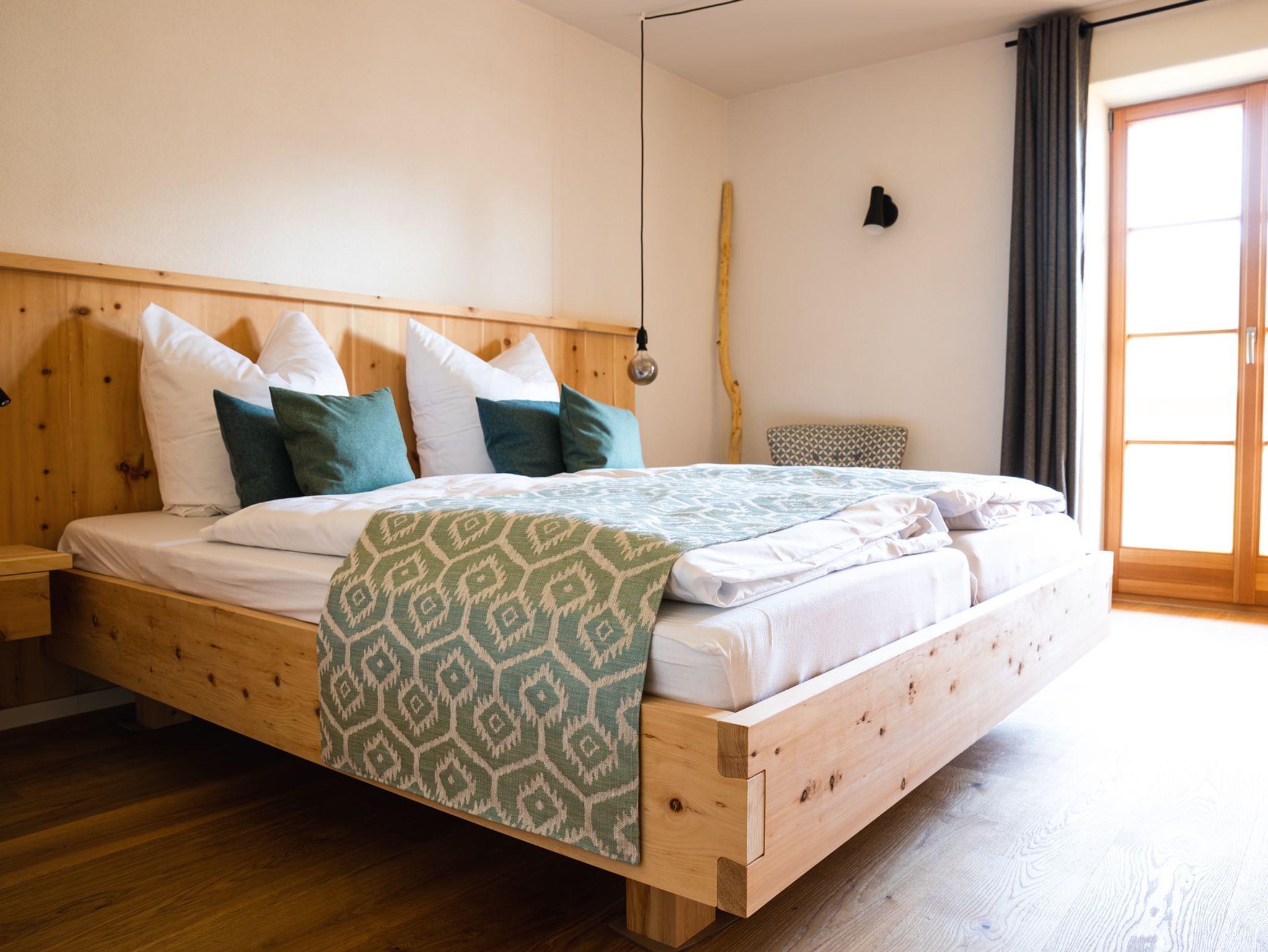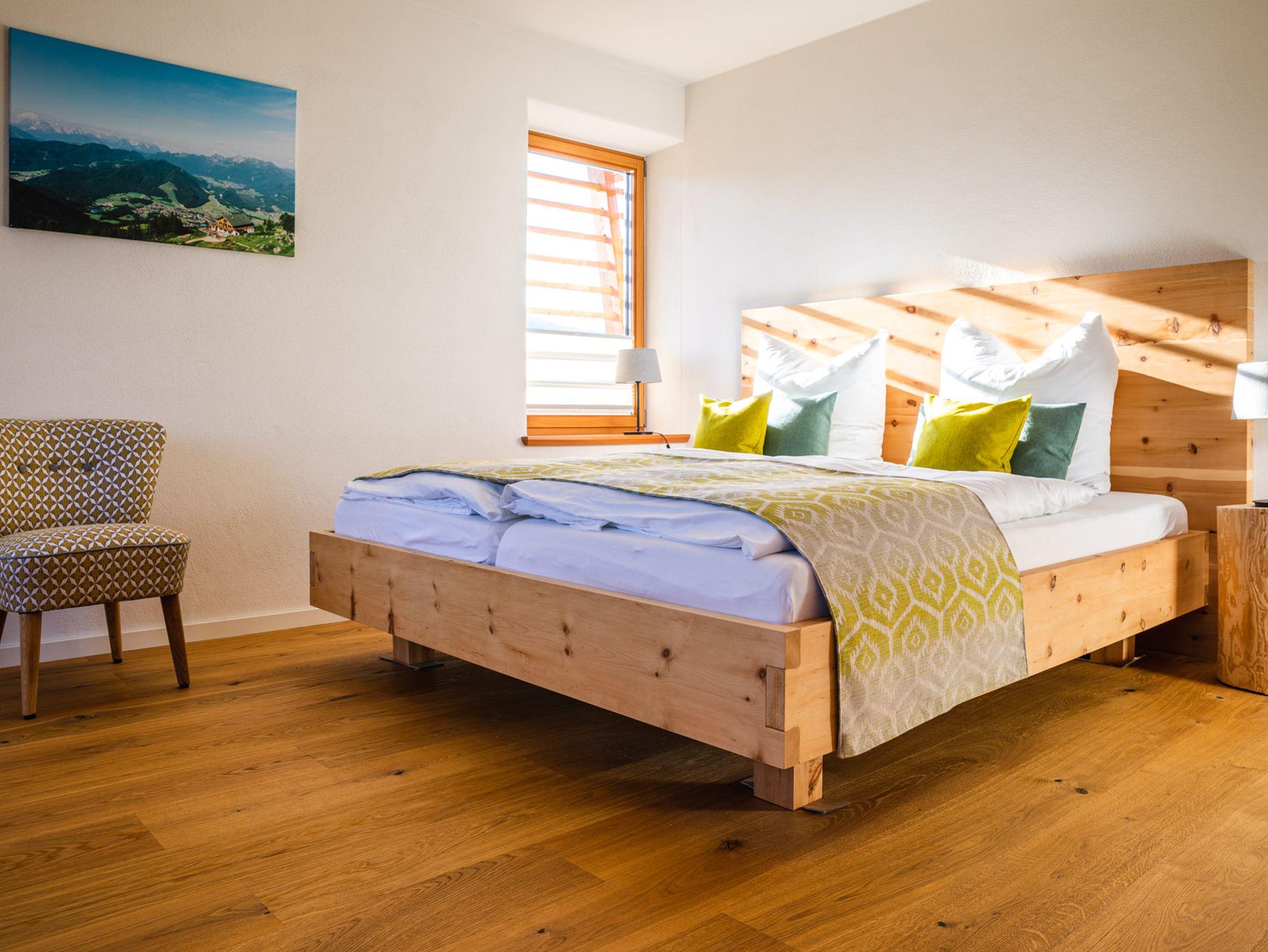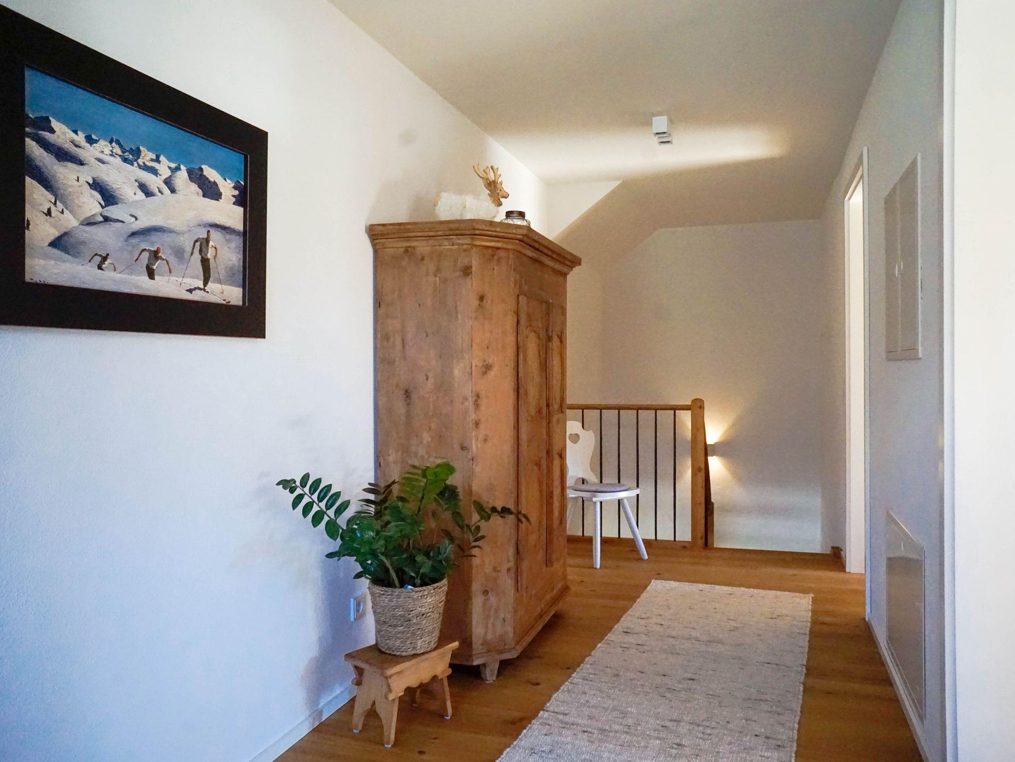 Im Obergeschoss befinden sich die beiden Schlafzimmer jeweils mit Zugang nach Süden zum Balkon aus Lärchenholz. Die Schlafzimmer sind mit Zirbenholzbetten ausgestattet. Die Ätherischen Öle der Zirbe sorgen für einen angenehmen Schlaf. Das Badezimmer/WC mit großzügiger Dusche, einer Badewanne und doppeltem Waschtisch befindet sich ebenfalls im Obergeschoss. Der breite Flur endet an einem G´flack /Lesesofa vor der Fensterfläche mit Aussicht auf die Berge. Der perfekte Platz zum entspannen!