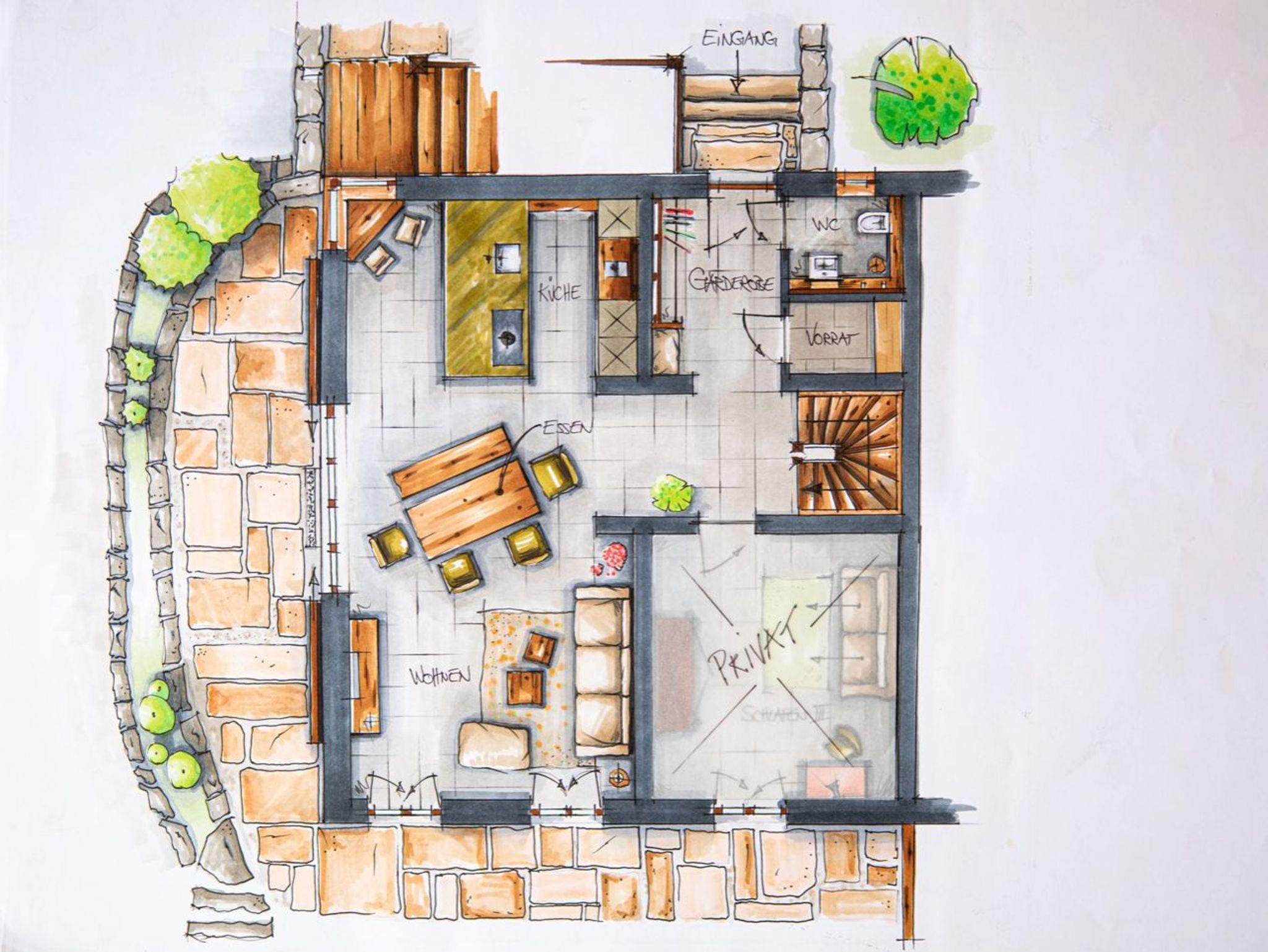 Ein Ferienhaus im Stil eines Bauernanwesens. Holz und Naturmaterialien prägen den Charakter. Im Erdgeschoss erwartet Sie nach der Garderobe ein großzügiger und moderner Wohn- und Küchenbereich. Ein Gäste-WC und ein kleiner Raum mit Reinigungsutensilien.