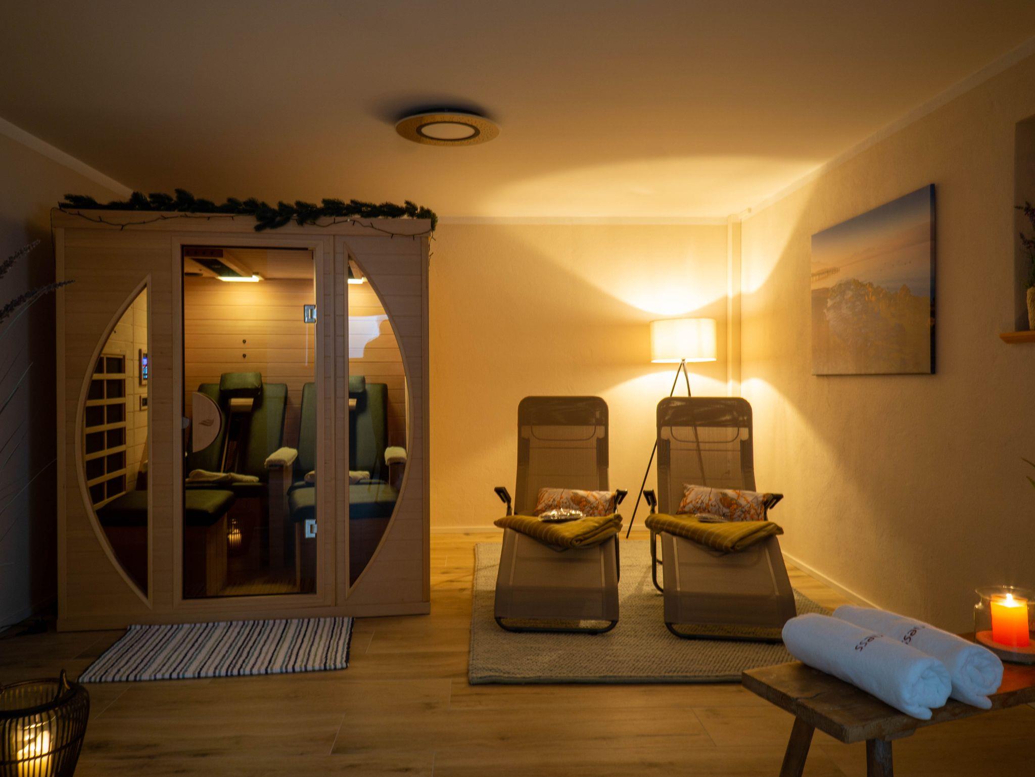 Im Untergeschoss haben wir für Sie einen schönen Raum mit moderner Infrarot-Sauna und einem gemütlichen Liegebereich geschaffen. Duftöl, Saunatücher- und Schuhe sind vorhanden.