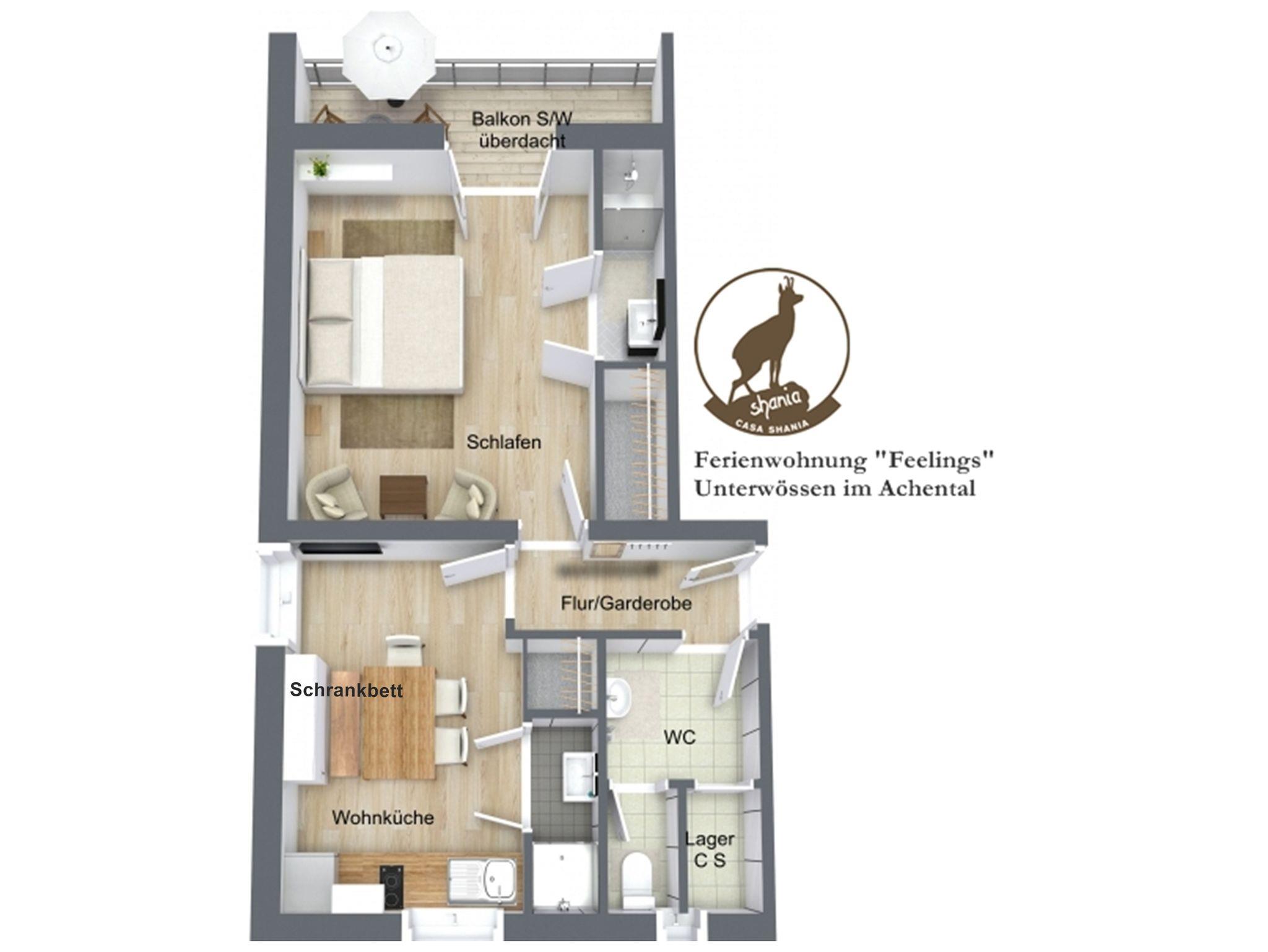 Unsere Ferienwohnung „Feelings“ verfügt über zwei helle separate Räume, Flur und WC. Sie ist grundsätzlich ausgelegt für 1-2 Gäste. Ein großes Schlafzimmer mit einem Boxspring- Doppelbett, eingebauter Dusche und Waschtisch. Zwei Lounge-Sessel mit kleinem Beistelltisch wurden zu einer kleinen Sitzgruppe arrangiert und laden zum Ausruhen ein. Vom Schlafzimmer treten sie auch hinaus auf den überdachten Balkon mit traumhafter Aussicht. In der gemütlichen Wohnküche finden sie die Küchenzeile, eine Sitzgruppe und einen großen Flat-TV.