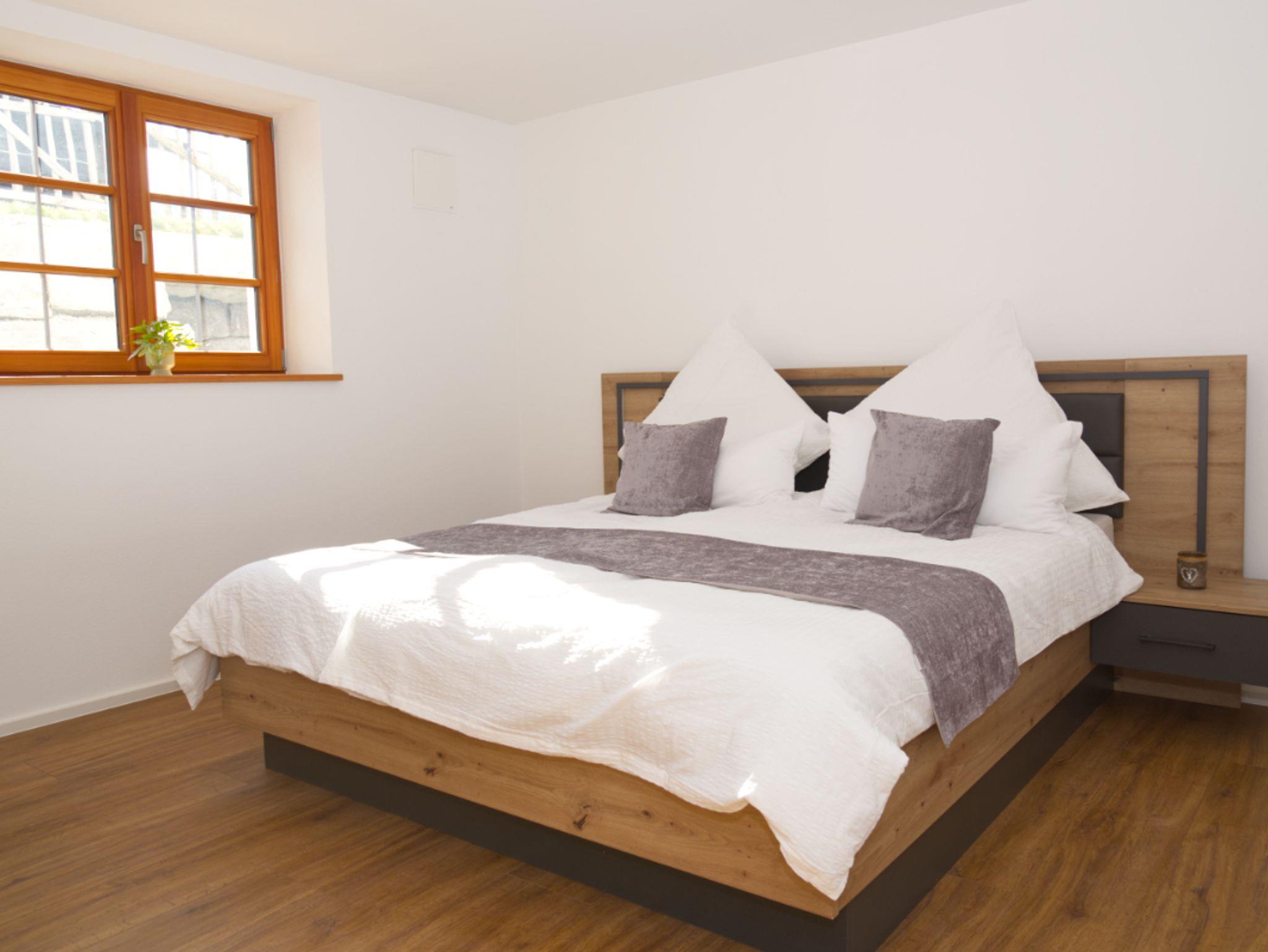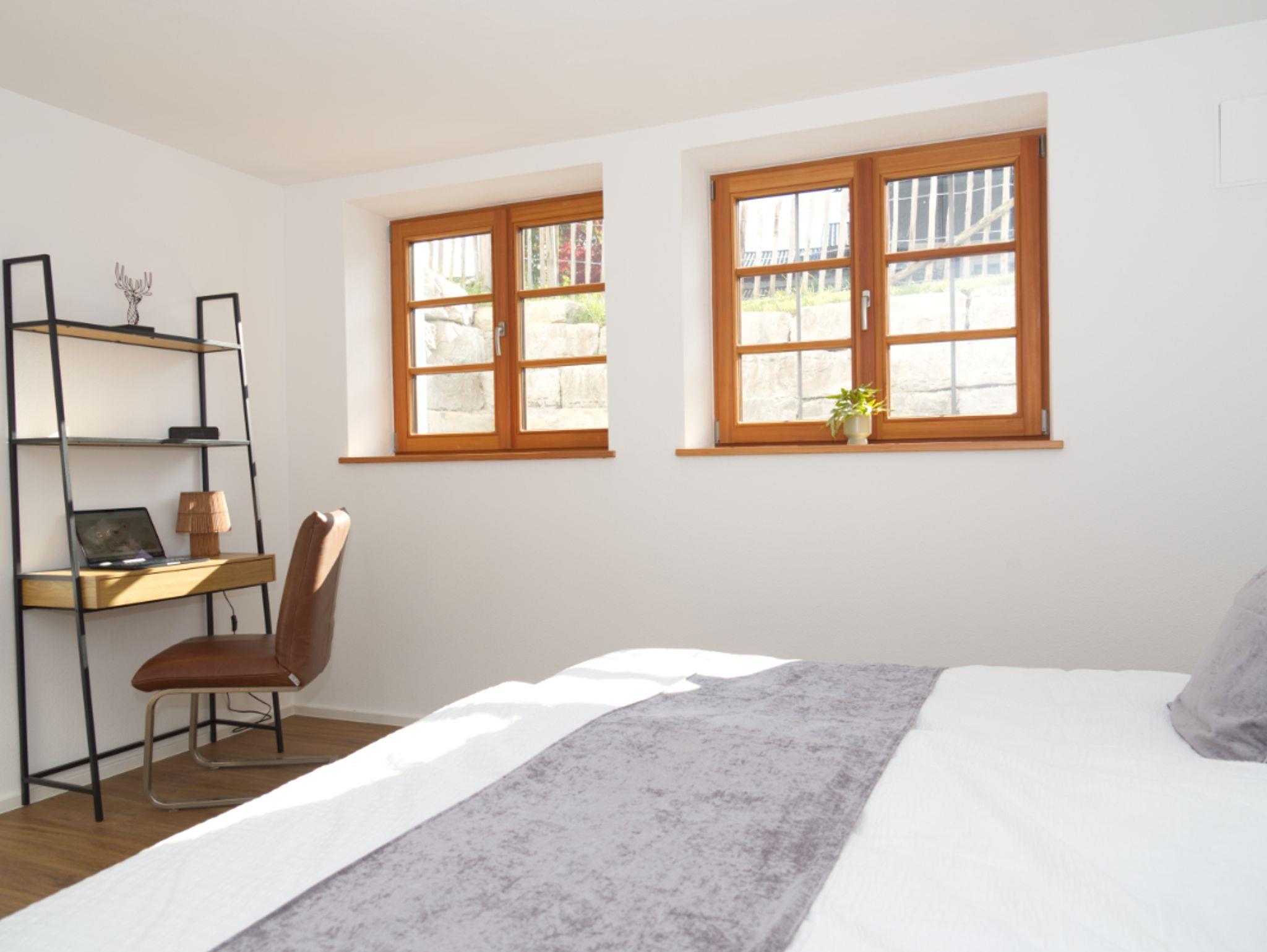 Schlafzimmer 1: Ein ruhiges Zimmer mit einem bequemen Doppelbett und ausreichend Stauraum sowie einem ruhigen Arbeitsplatz.