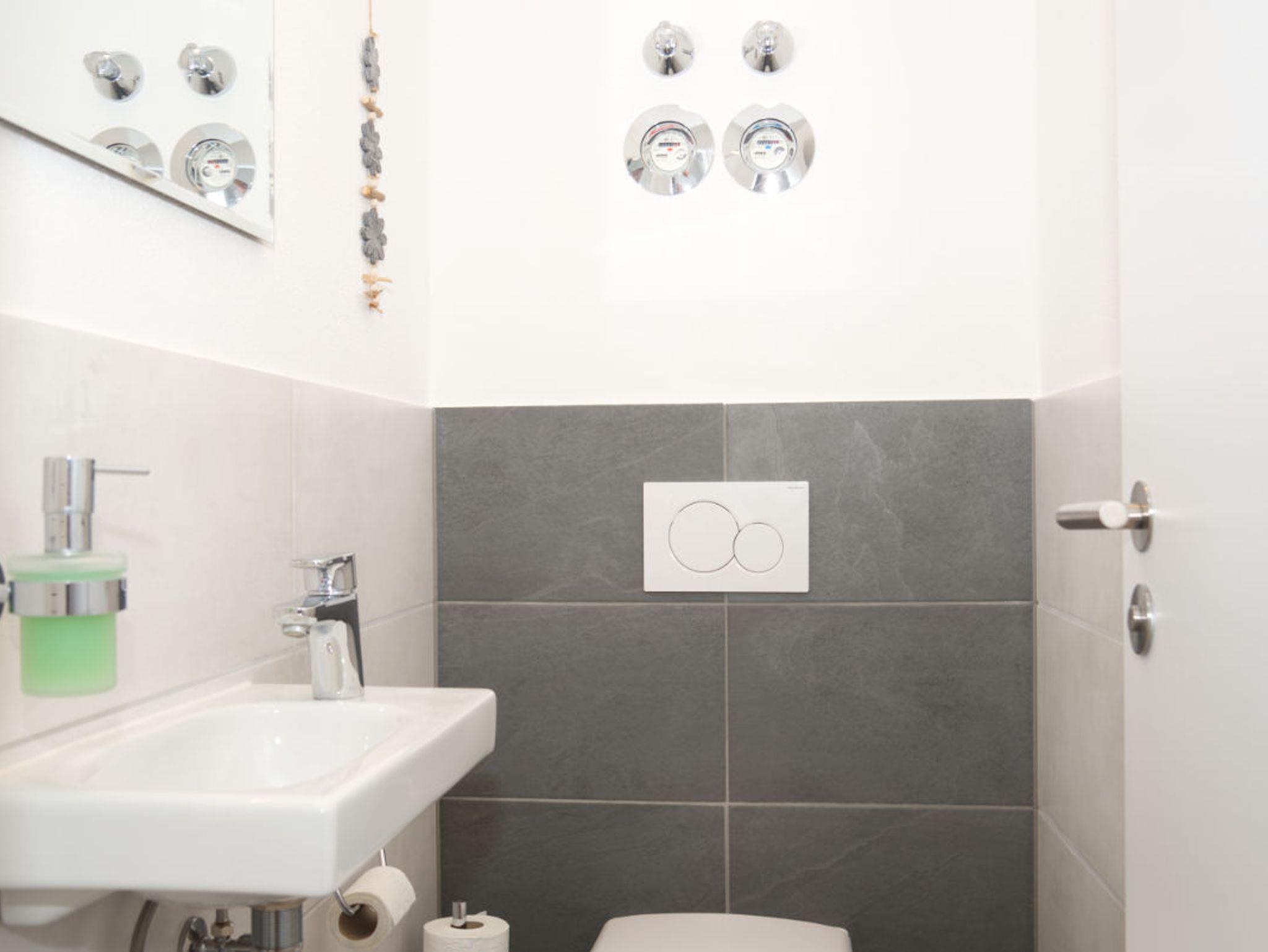 Badezimmer: Ein modernes und sauberes Bad mit Dusche, separatem WC und Föhn.