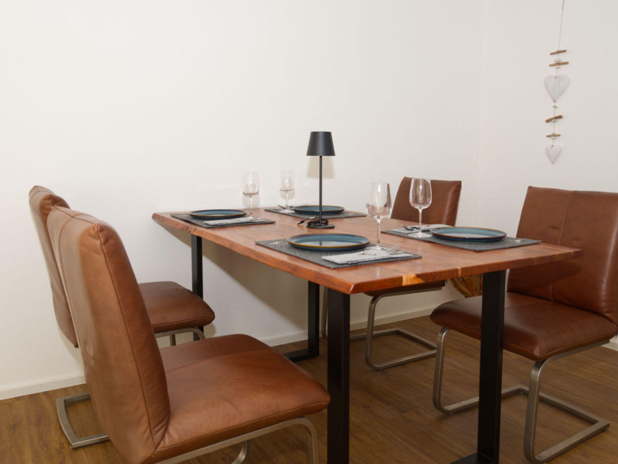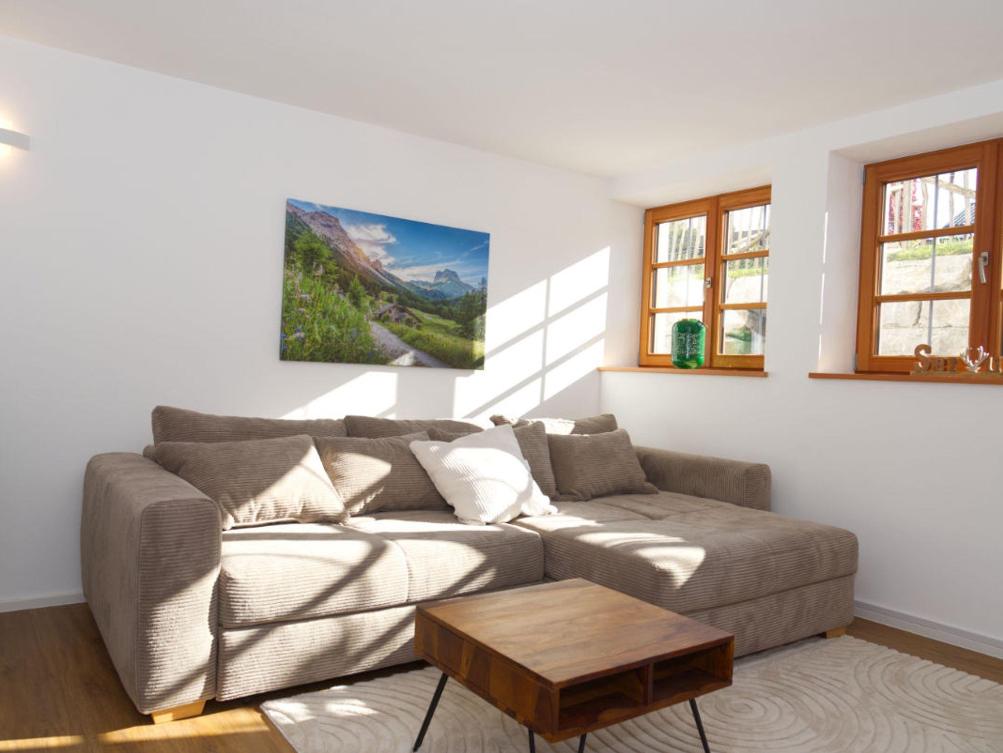 Wohnzimmer: Ein heller und komfortabler Bereich mit gemütlicher Sitzecke (Schlaffunktion mit einer Liegefläche von ca. 153 x 245 cm und Federkernpolsterung), einem Smart-TV und einem Esstisch für gemeinsame Mahlzeiten.