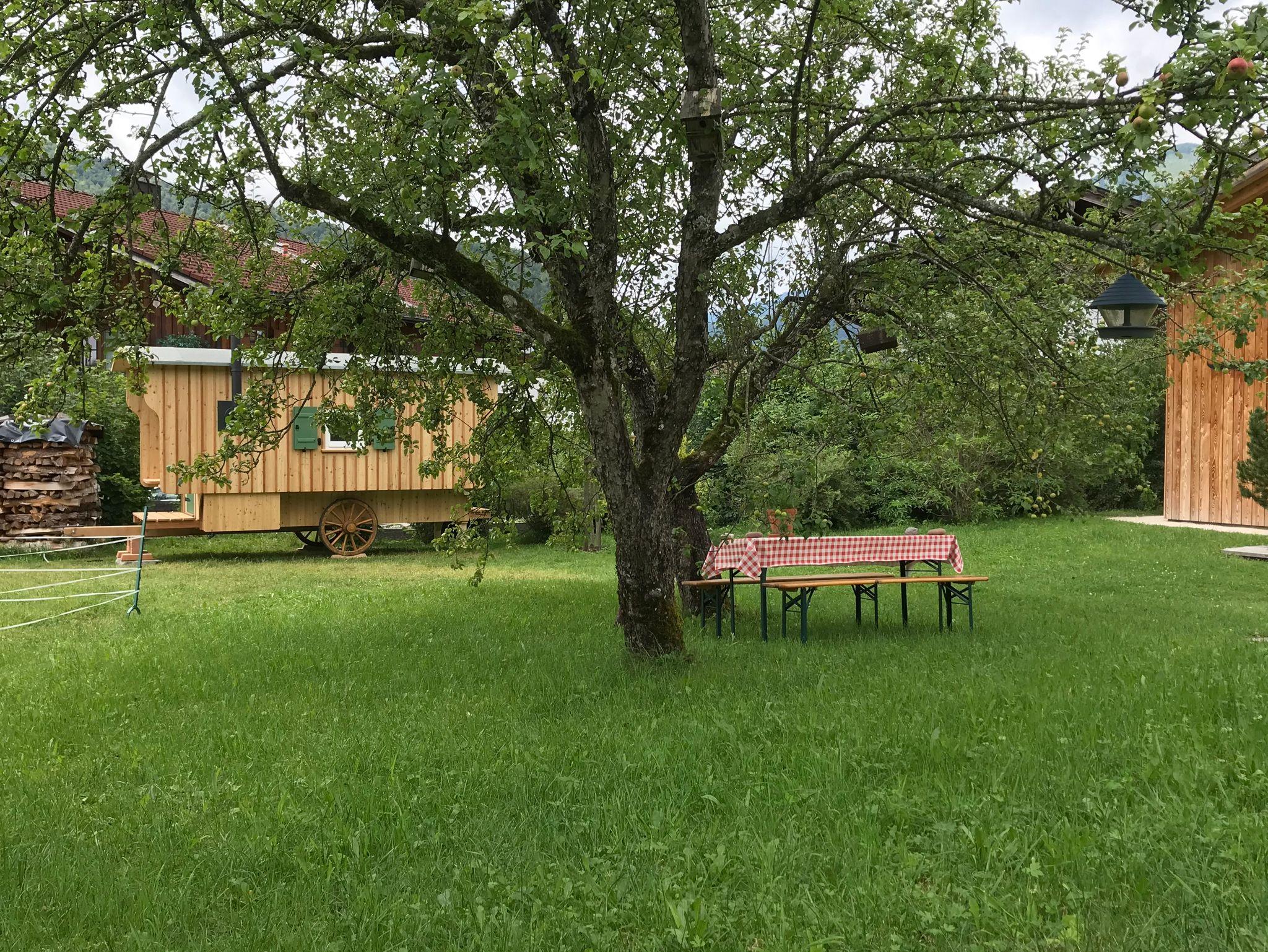 Unsere moderne Interpretation einer Berghütte: Ein freistehendes massives Holz-Chalet auf der weitläufigen Streuobstwiese eines denkmalgeschützten Bauernanwesens. Das Highlight ist ein 3,20 m breites Bett, das Eltern mit Kleinkindern als Familienbett genauso zu schätzen wissen wie Paare, die das Hüttenlager-Feeling genießen. Liebevoll und perfekt im Detail, luxuriös in der Ausstattung, durchdacht in der Funktion. Überdachter Carport, abschließbarer Fahrradraum, E-Ladestation für PKWs, freies WLAN, Grillplatz, Waschmaschinenraum, Hofladen, Hühner, Katzen, Bienen, Rosen, Kräuter- und Beerengarten, Apfelbäume, die Wiese bis zum Bach ... einfach perfekter und entspannter Urlaub.