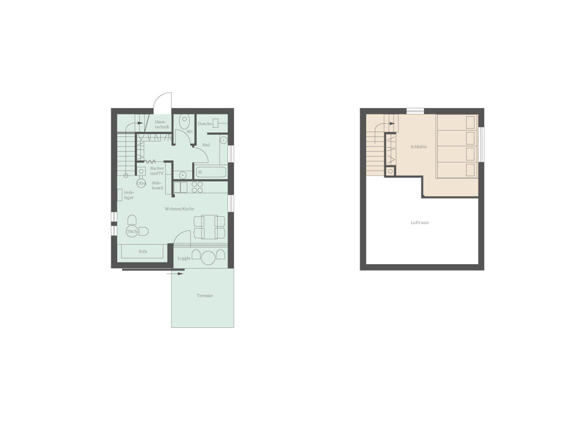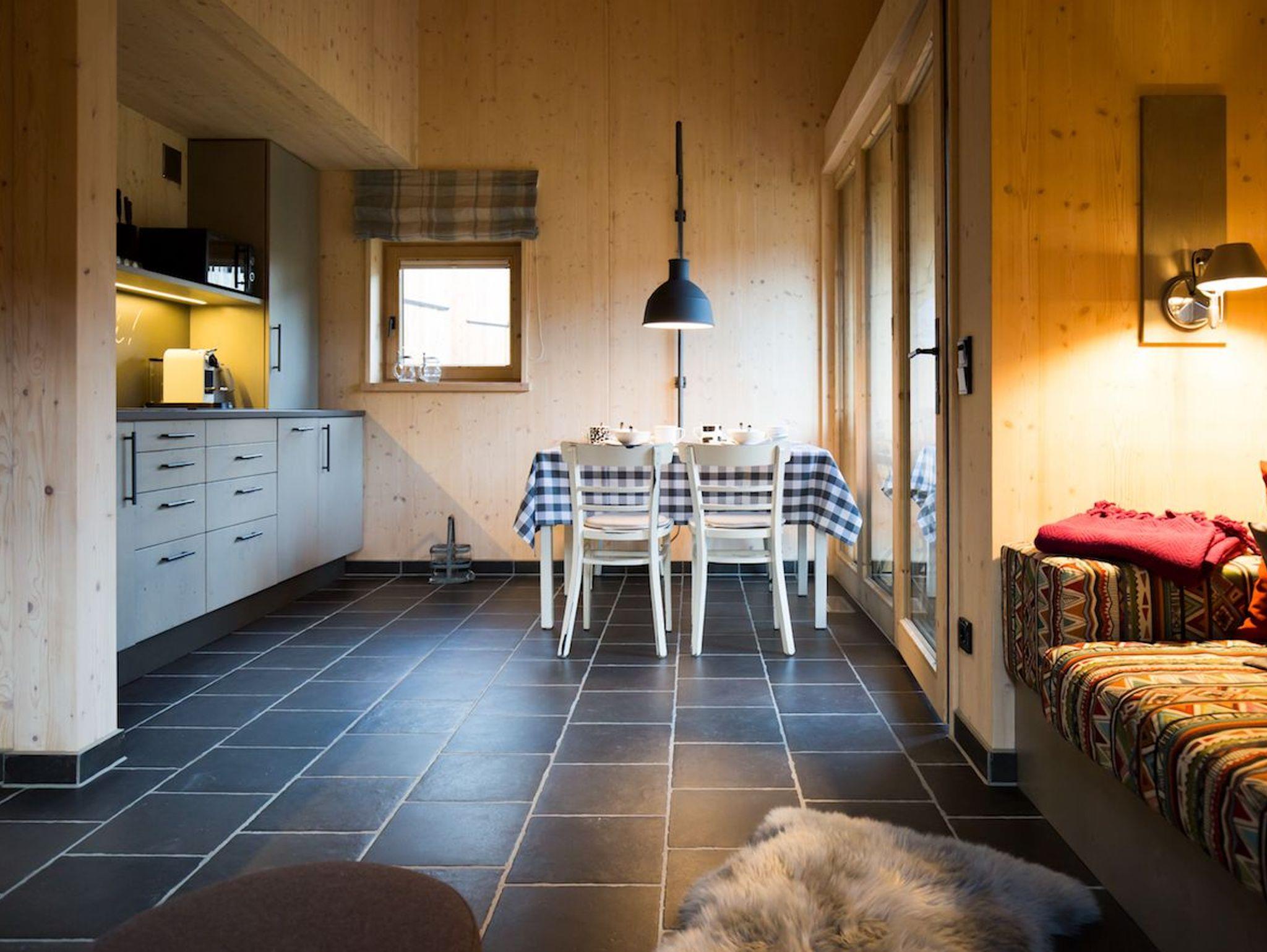 Lohei - Chalets im Chiemgau, Chalet Hollerhäusl, ganzes Haus, 50 qm für 2-4 Personen, Wohnbereich mit Kochecke und Galerie