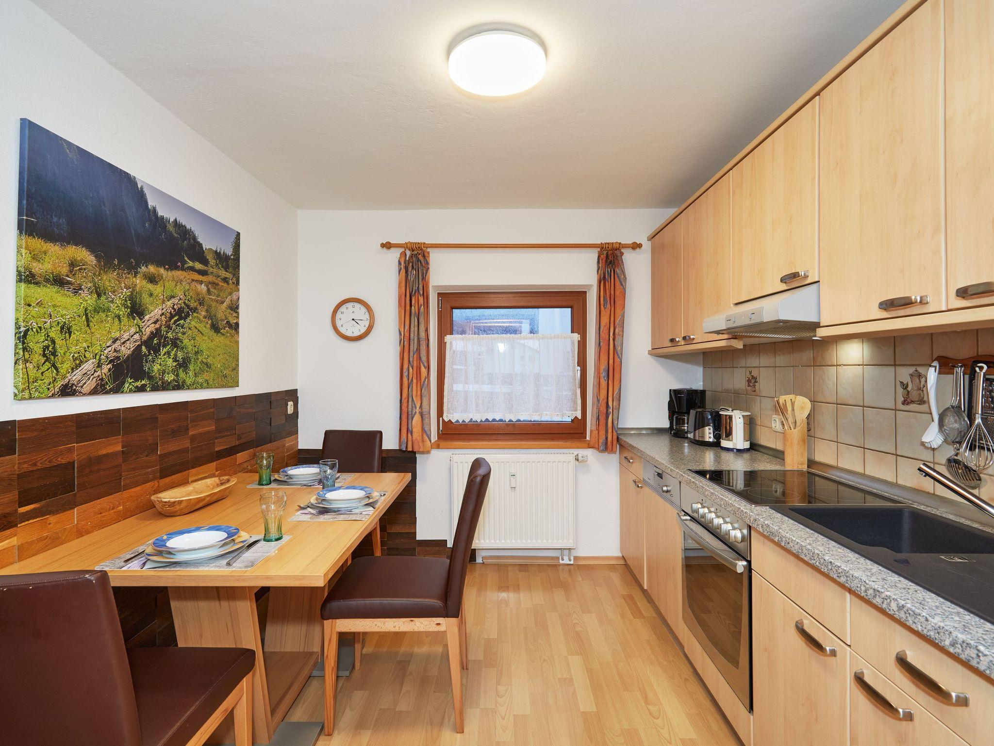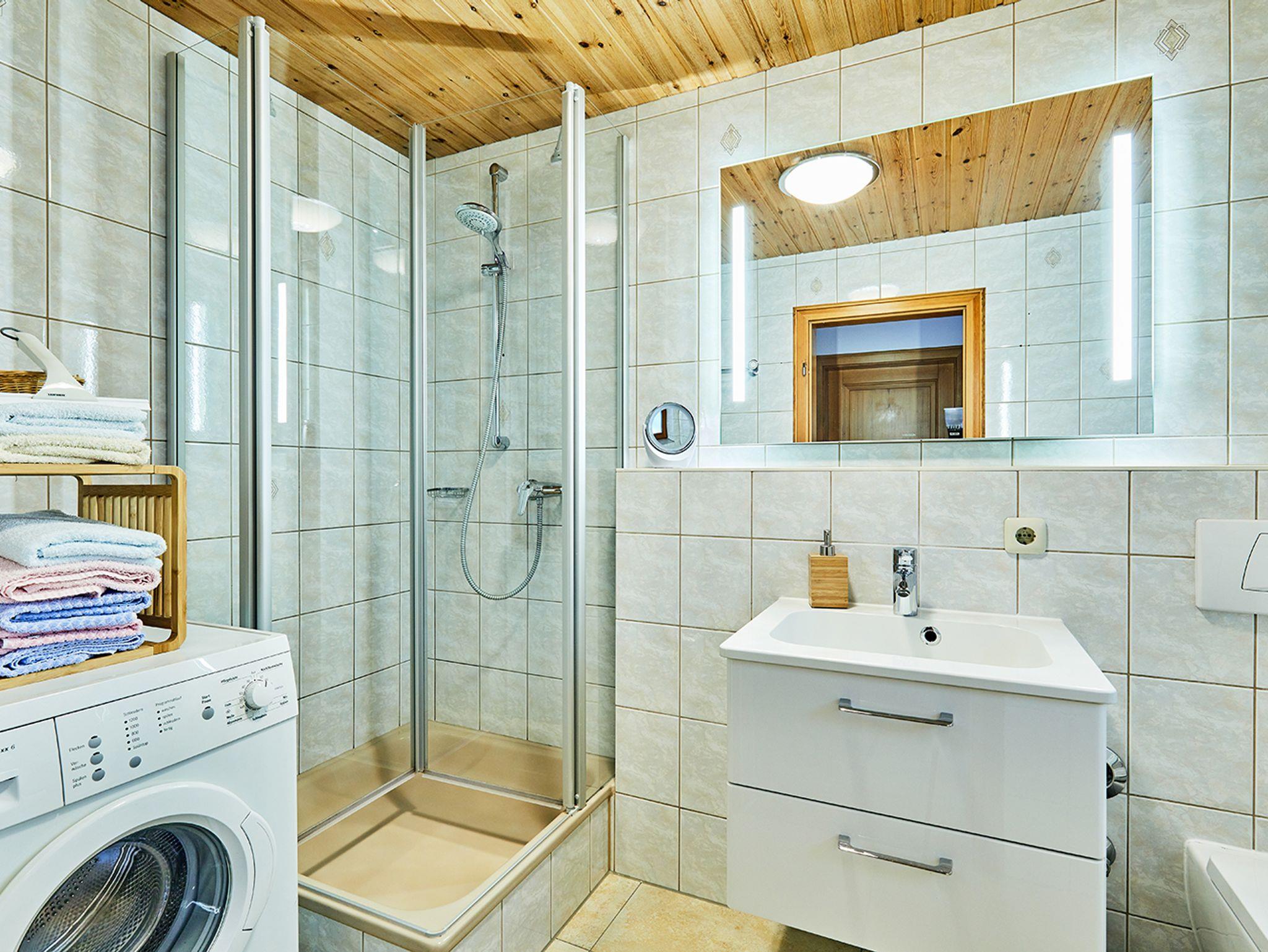 Erdgeschoss Ferienwohnung Wanderlust für 2 - 4 Gäste, modern und rustikal gehalten, Wohnzimmer mit TV, Schlafzimmer für 4 Personen, Bad mit Dusche, Waschmaschine und WC, gut ausgestattete Küche mit Essbereich, Mikrowelle, Spülmaschine, absperrbarer Raum für Fahrräder, Skier, Schlitten.