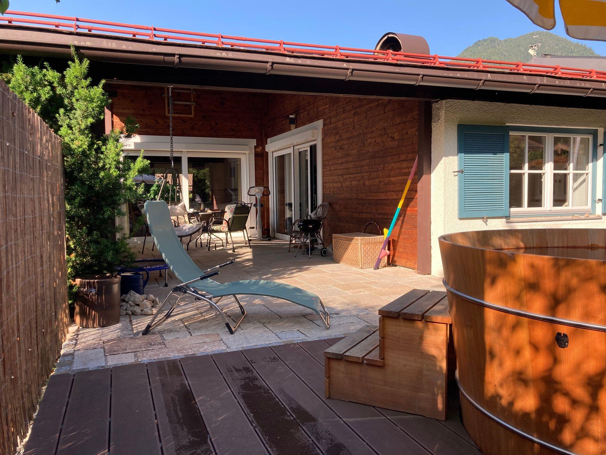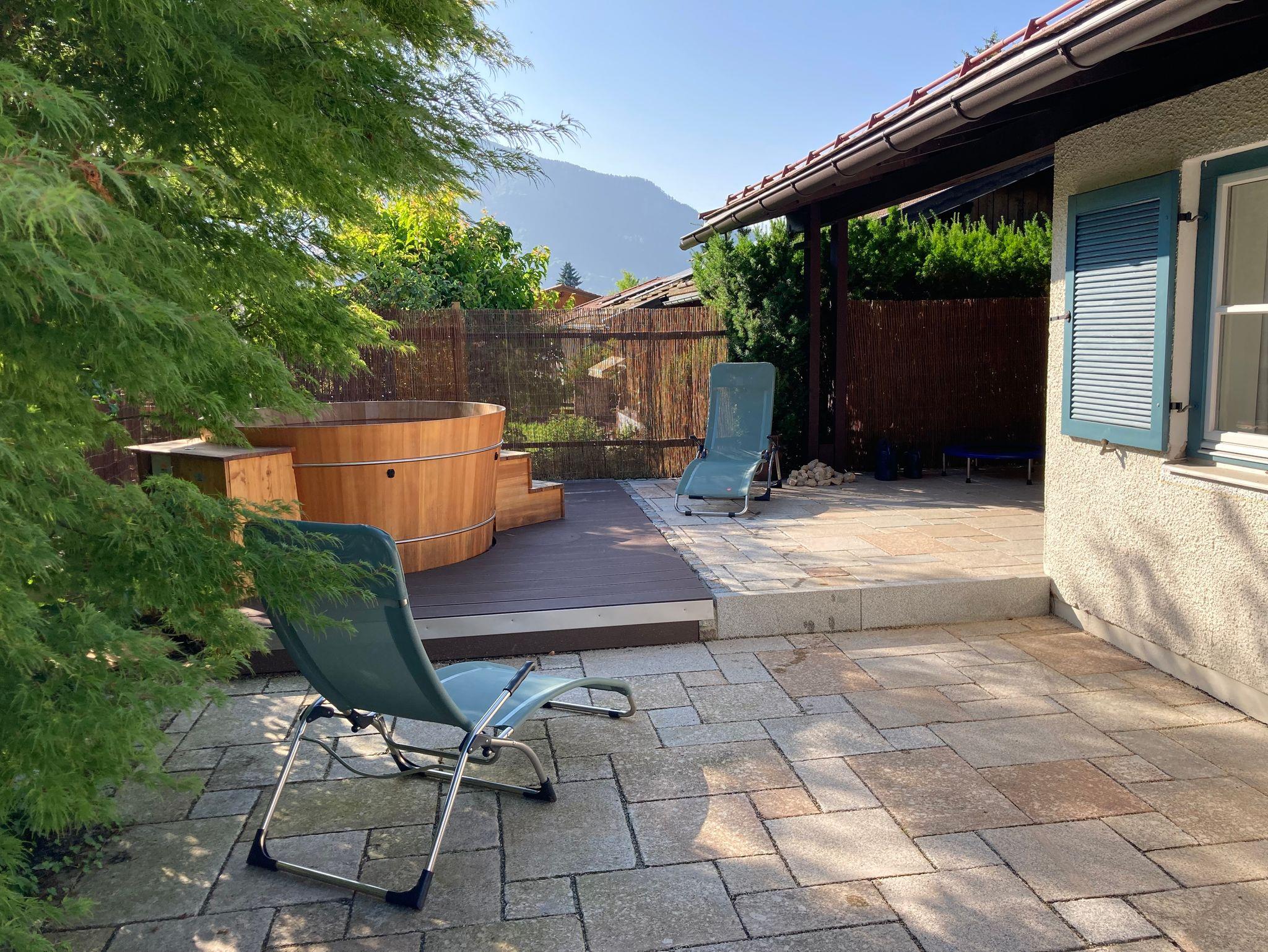 In der wärmeren Jahreszeit sorgt unser hölzerner Badezuber für Frische. Er steht auf der Südterrasse und bis zu 6 Personen können ihn gleichzeitig nutzen. Wir verwenden zur Reinigung des Badewassers eine vollautomatische Dosieranlage, um dem Wasser nur die unbedingt benötigte Menge an Chlor beimischen zu müssen.