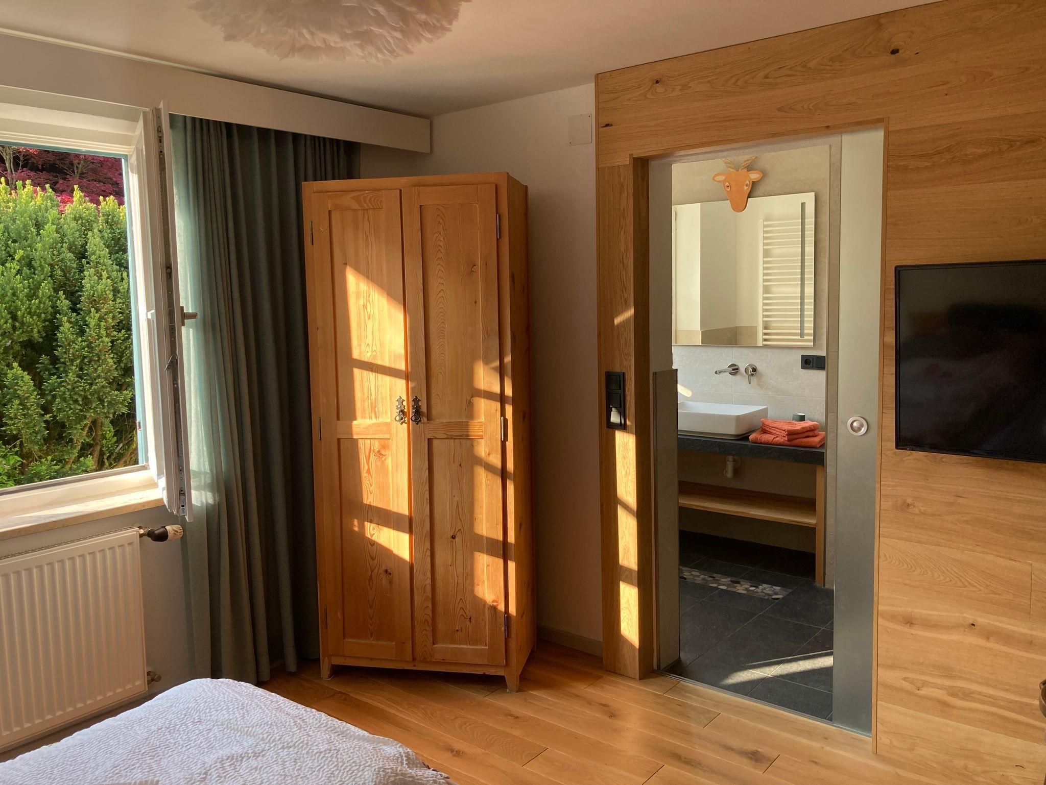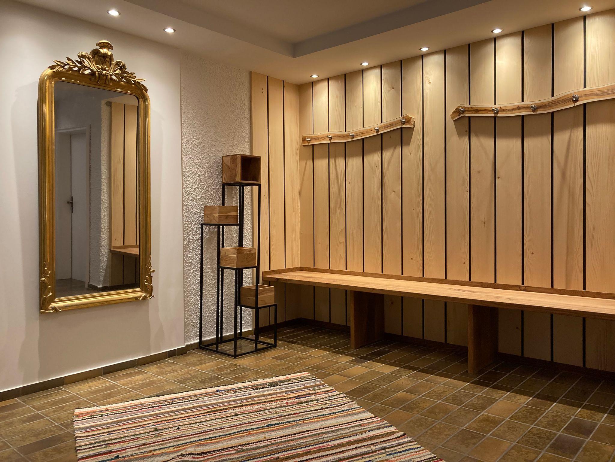 Bines Ferienwohnung ist mit 190 m² sehr großzügig geschnitten. Die große Garderobe bietet viel Platz und Bewegungsfreiheit. Die Wohnung selbst erreicht man von dort über eine Treppe. Es gibt 3 Schlafzimmer mit je einem Doppelbett, jedes der Schlafzimmer hat ein eigenes Bad mit Regenwalddusche. Eine Badewanne ist ebenfalls vorhanden. Im Zentrum der Ferienwohnung liegt der großzügige Gemeinschaftsbereich, der sich in