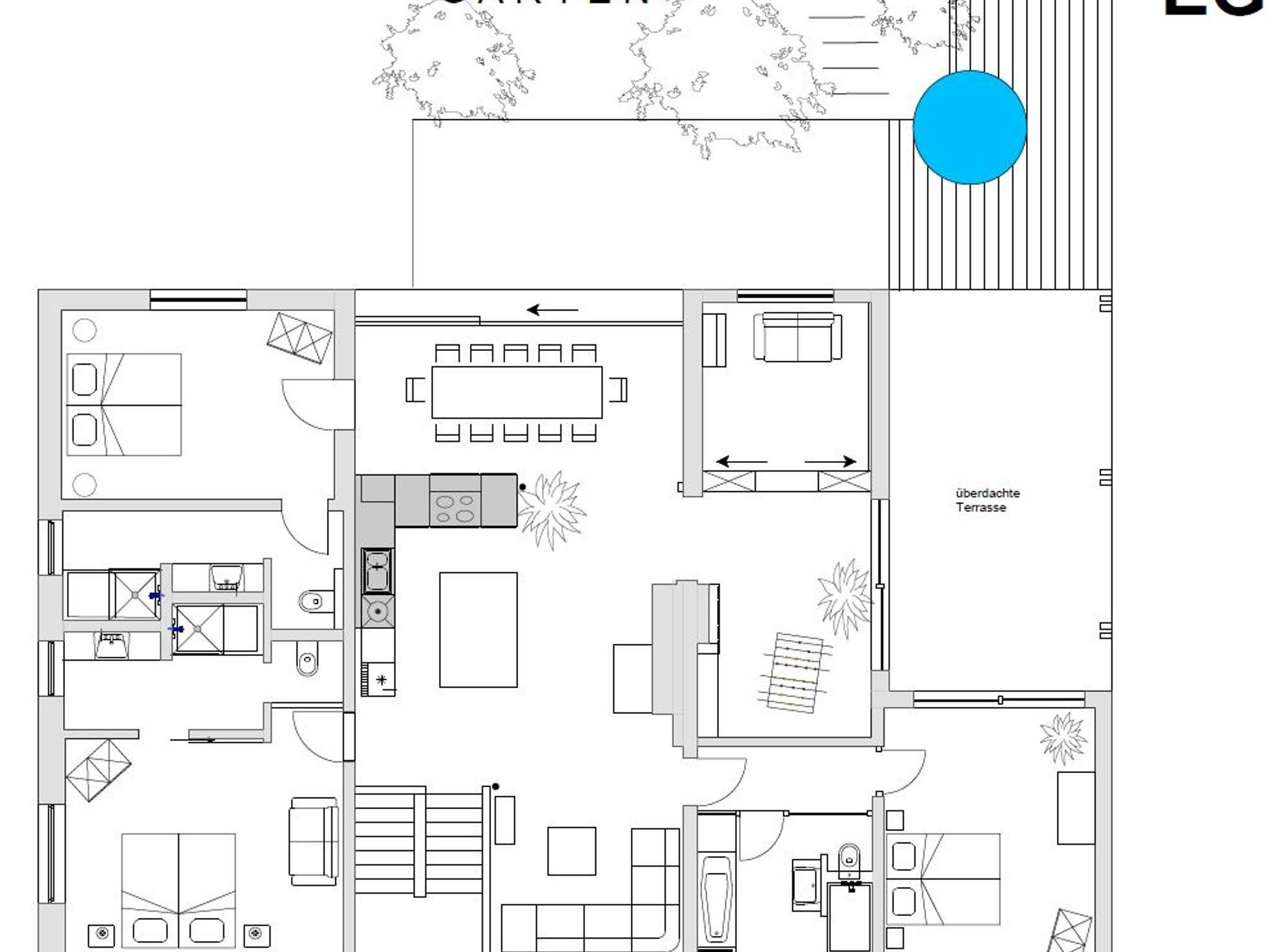 Im Spielzimmer steht ein Kicker zur Verfügung, sowie zahlreiche Spiele für Kleine und Große. Durch große Glasschiebetüren gelangt man vom Gemeinschaftsbereich auf die Südterrasse (44 m²) und die überdachte Westterrasse (26 m²), die mit Tischen, Stühlen und Liegen ausgestattet sind.