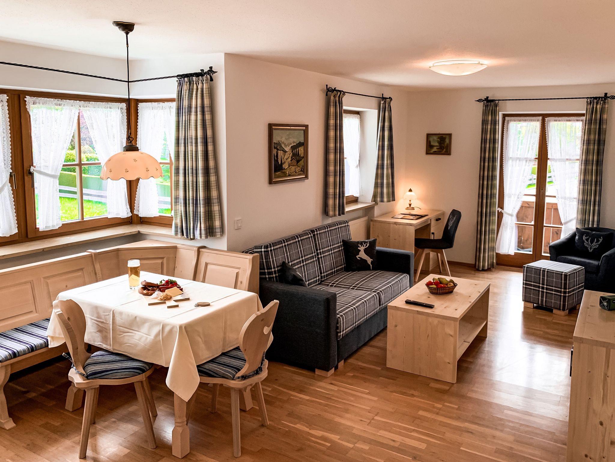 Die Wohnung Hochgern befindet sich im Obergeschoss. Sie verfügt über einen Balkon der nach Süd-Osten ausgerichtet ist. Dieser bietet einen direkten Blick auf den Hochgern. Die voll ausgestattete Küche, die in den geräumigen Wohnbereich integriert ist, verfügt über eine Spülmaschine. Neben dem Schlafzimmer mit einem Doppelbett finden Sie ein separates Schlafzimmer mit einem Einzelbett. Die hochwertige Schlafcouch im Wohnbereich bietet einen weiteren Schlafplatz für bis zu zwei Erwachsene. Das Badezimmer verfügt über eine Dusche und ein WC.