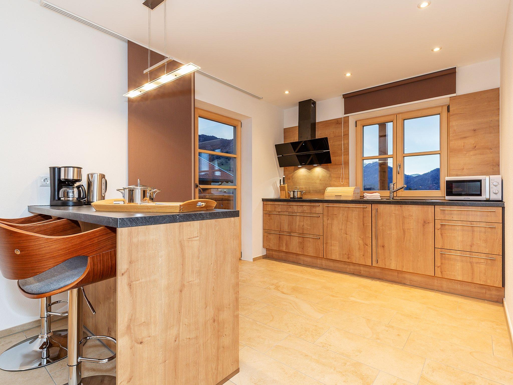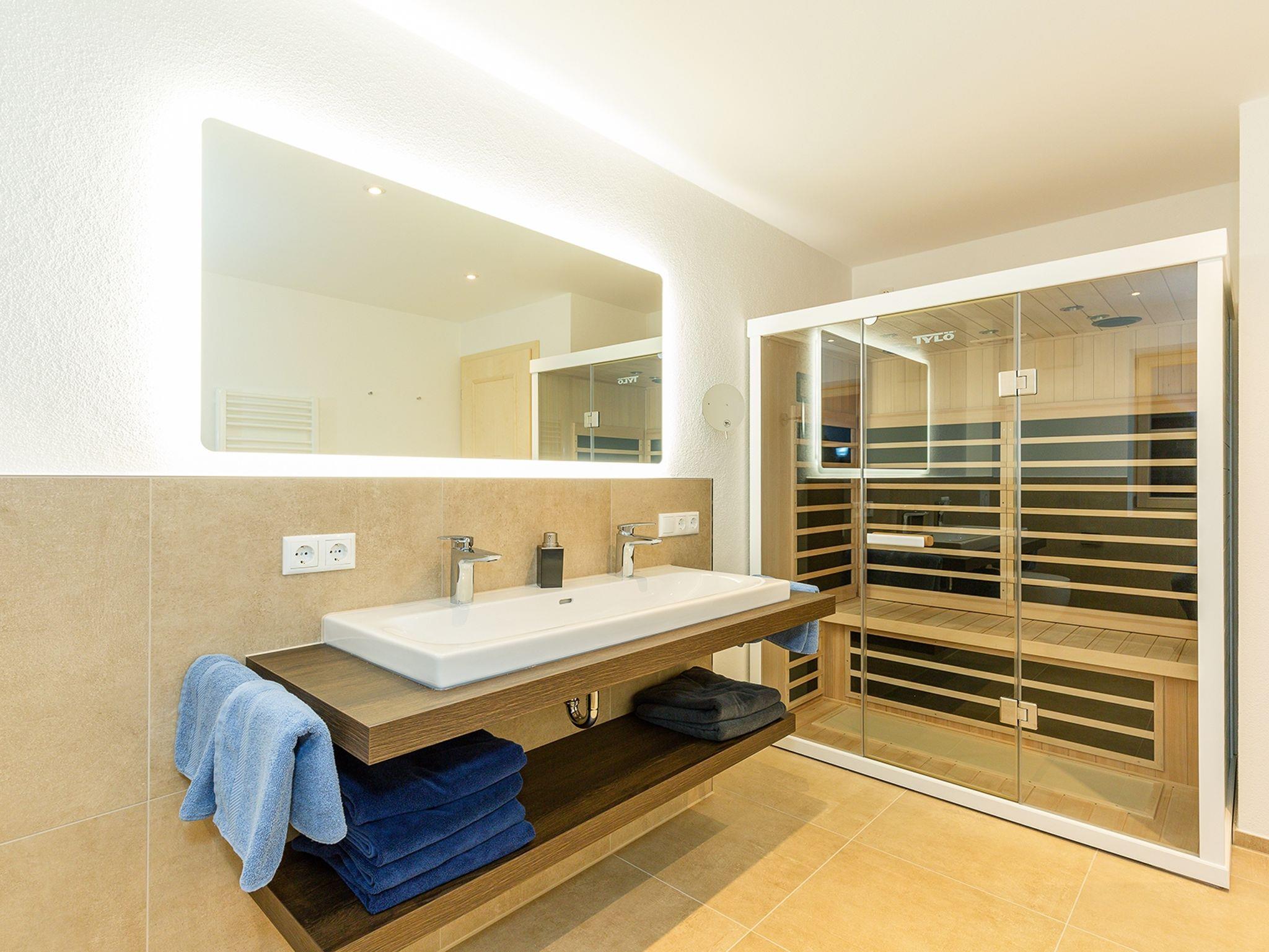 Die Ferienwohnung ist mit einer Infrarot Sauna, einer großen Whirlwanne für 2 Personen, 2 hochwertigen Bädern, 2 Schlafzimmer (1 Zirbenholz Schlafzimmer, 1 Kernbuchen Schlafzimmer), moderner, hochwertiger Küchen/Ess- und Wohnbereich ausgestattet.
